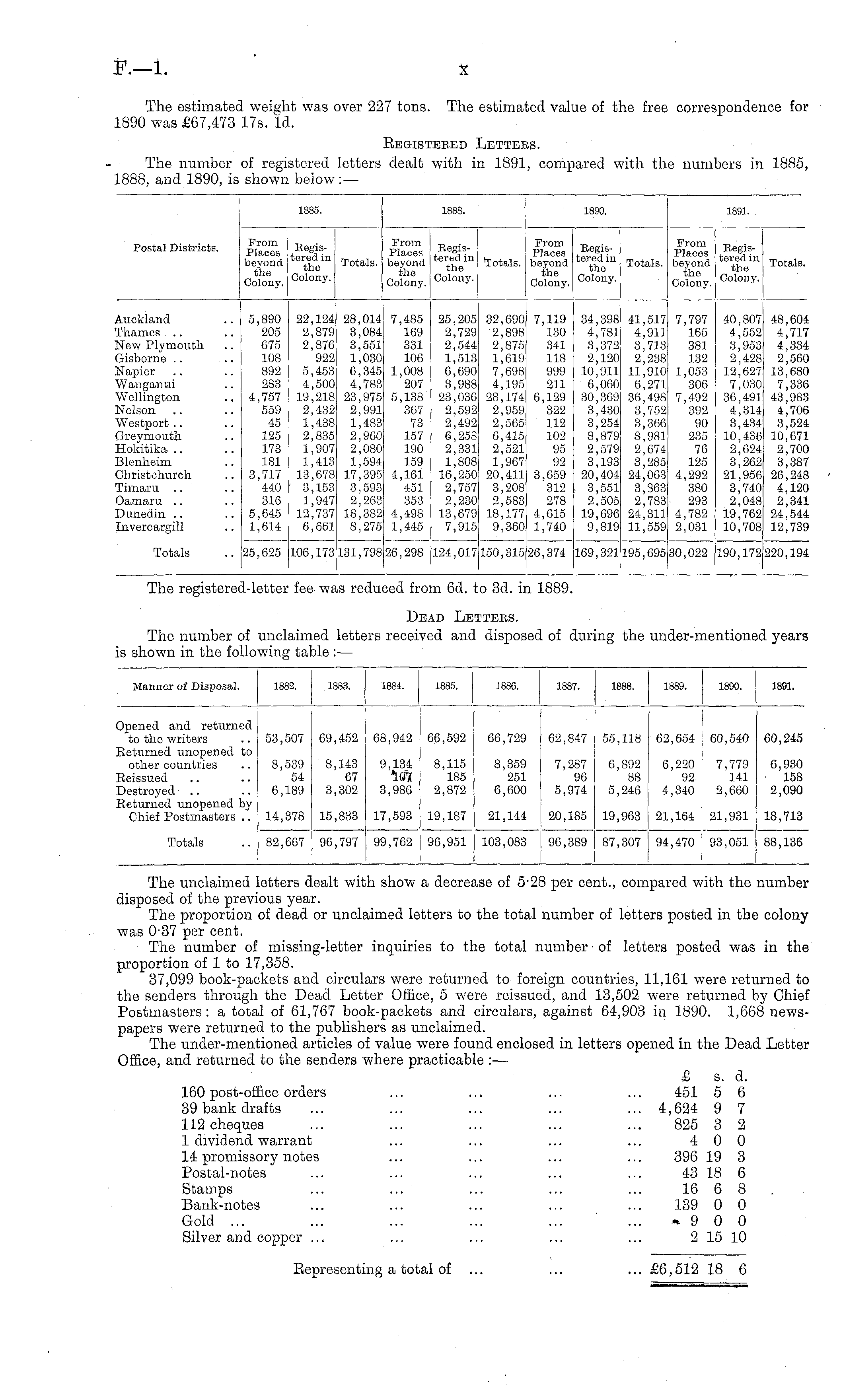 The unclaimed letters dealt with show a decrease of 528 per cent., compared with the number disposed of the previous year. The proportion of dead or unclaimed letters to the total number of letters posted in the colony was 0-37 per cent. The number of missing-letter inquiries to the total number of letters posted was in the proportion of 1 to 17,358. 37,099 book-packets and circulars were returned to foreign countries, 11,161 were returned to the senders through the Dead Letter Office, 5 were reissued, and 13,502 were returned by Chief Postmasters : a total of 61,767 book-packets and circulars, against 64,903 in 1890. 1,668 newspapers were returned to the publishers as unclaimed. The under-mentioned articles of value were found enclosed in letters opened in the Dead Letter Office, and returned to the senders where practicable : — £ s. d. 160 post-office orders ... ... ... ... 451 5 6 39 bank drafts ... ... ... ... ... 4,624 9 7 112 cheques ... ... ... ... ... 825 3 2 1 dividend warrant ... ... ... ... 400 14 promissory notes ... ... ... ... 396 19 3 Postal-notes ... ... ... ... ... 43 18 6 Stamps ... ... ... ... ... 16 6 8 Bank-notes ... ... ... ... ... 139 0 0 Gold ... ... ... ... ... ... * 9 0 0 Silver and copper ... ... ... ... ... 21510 Eepresenting a total of ... ... ... £6,512 18 6