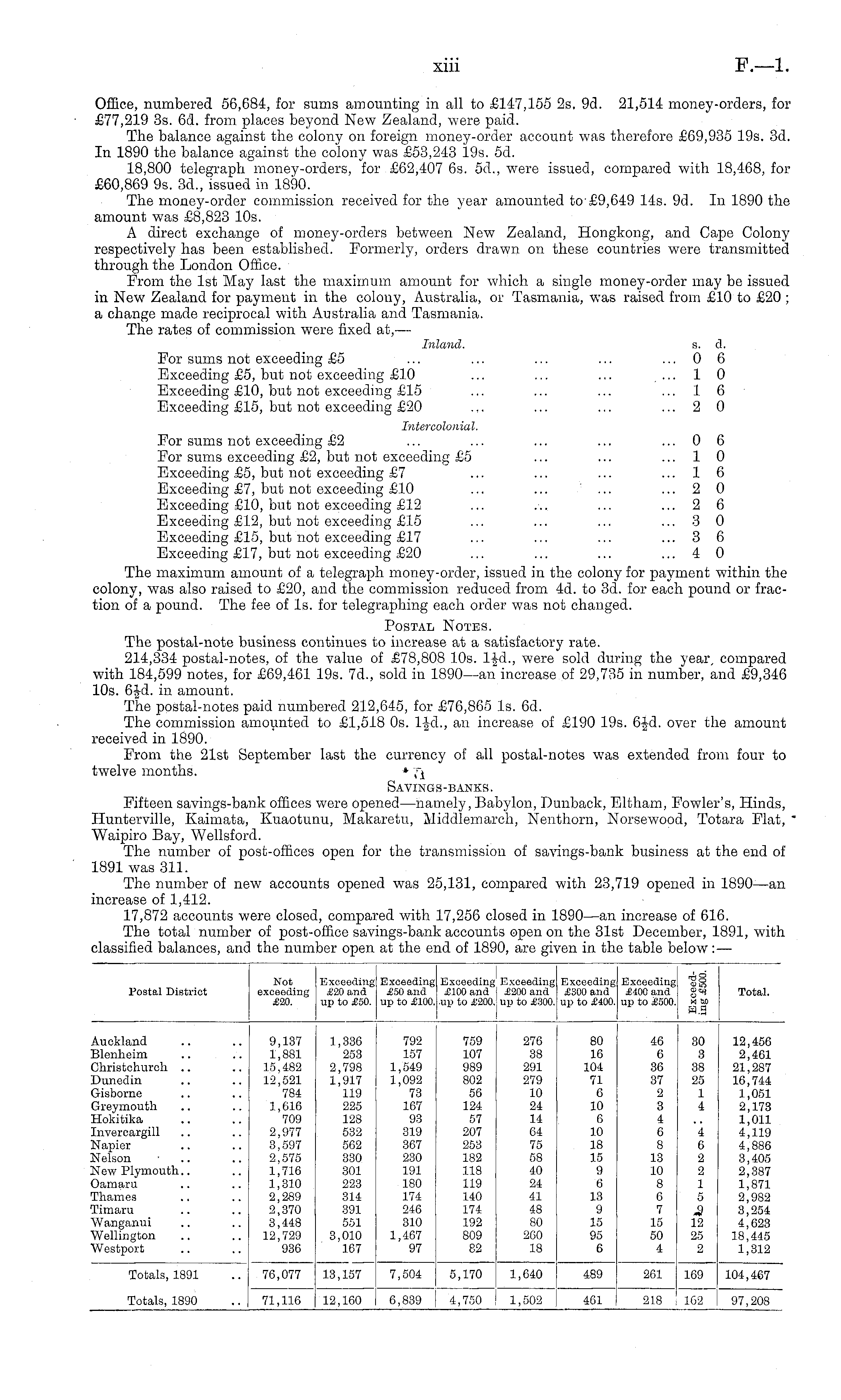 Postal District Not exceeding £20. Exceeding £20 and up to £50. Exceeding £50 and up to £100. Exceeding £100 and .up to £200. Exceeding .£200 and up to £300. Exceeding £300 and up to £400. Exceeding £400 and up to £500. H.S Total. Auckland Blenheim 3hristchurch Dunedin 3-isborne 3-reymouth Bokitika [nvereargill Napier (Sfclson Slew Plymouth.. Damaru Thames rimaru Wanganui Wellington Westport 9,137 1,881 15,482 12,521 784 1,616 709 2,977 3,597 2,575 1,716 1,310 2,289 2,370 3,448 12,729 936 1,336 253 2,798 1,917 119 225 128 532 562 330 301 223 314 391 551 3,010 167 792 157 1,549 1,092 73 167 93 319 367 230 191 180 174 246 310 1,467 97 759 107 989 802 56 124 57 207 253 182 118 119 140 174 192 809 82 276 38 291 279 10 24 14 64 75 58 40 24 41 48 80 200 18 80 16 104 71 6 10 0 10 18 15 9 6 13 9 15 95 6 46 6 36 37 2 3 4 6 8 13 10 8 6 7 15 50 4 30 3 38 25 1 4 4 6 2 2 1 5 'J 12 25 2 12,456 2,461 21,287 16,744 1,051 2,173 1,011 4,119 4,886 3,405 2,387 1,871 2,982 3,254 4,623 18,445 1,312 Totals, 1891 76,077 13,157 7,504 5,170 1,640 489 261 169 104,467 Totals, 1890 71,116 12,160 6,839 4,750 1,502 4G1 21S 162 97,208