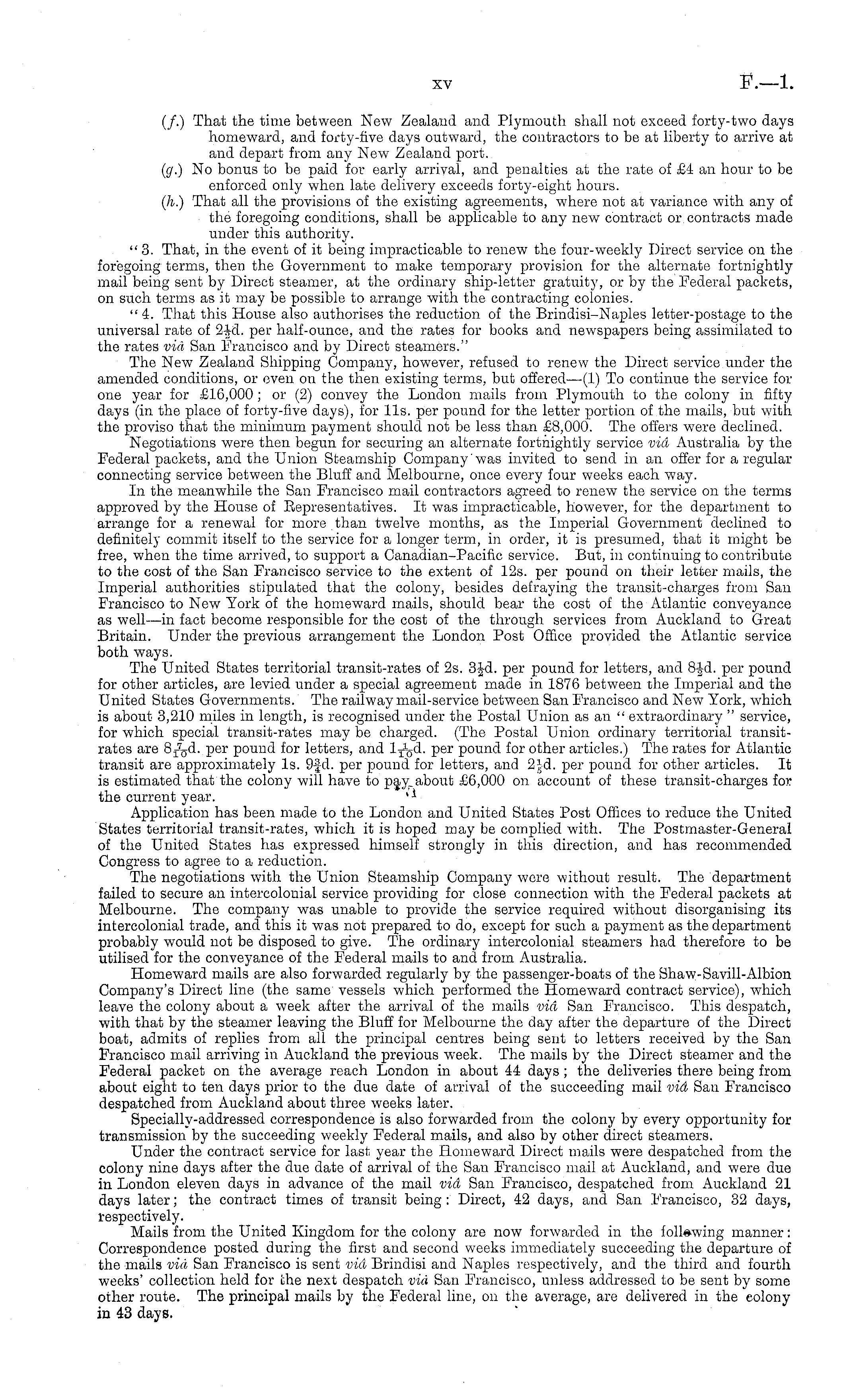 (/.) That the time between New Zealand and Plymouth shall not exceed forty-two days homeward, and forty-five days outward, the contractors to be at liberty to arrive at and depart from any New Zealand port. (g.) No bonus to be paid for early arrival, and penalties at the rate of £4 an hour to be enforced only when late delivery exceeds forty-eight hours. (h.) That all the provisions of the existing agreements, where not at variance with any of the foregoing conditions, shall be applicable to any new contract or contracts made under this authority. " 3. That, in the event of it being impracticable to renew the four-weekly Direct service on the foregoing terms, then the Government to make temporary provision for the alternate fortnightly mail being sent by Direct steamer, at the ordinary ship-letter gratuity, or by the Federal packets, on such terms as it may be possible to arrange with the contracting colonies. "4. That this House also authorises the reduction of the Brindisi-Naples letter-postage to the universal rate of per half-ounce, and the rates for books and newspapers being assimilated to the rates via San Francisco and by Direct steamers." The New Zealand Shipping Company, however, refused to renew the Direct service under the amended conditions, or even on the then existing terms, but offered—(l) To continue the service for one year for £16,000 ; or (2) convey the London mails from Plymouth to the colony in fifty days (in the place of forty-five days), for lis. per pound for the letter portion of the mails, but with the proviso that the minimum payment should not be less than £8,000. The offers were declined. Negotiations were then begun for securing an alternate fortnightly service via Australia by the Federal packets, and the Union Steamship Company was invited to send in an offer for a regular connecting service between the Bluff and Melbourne, once every four weeks each way. In the meanwhile the San Francisco mail contractors agreed to renew the service on the terms approved by the House of Eepresentatives. It was impracticable, however, for the department to arrange for a renewal for more than twelve months, as the Imperial Government declined to definitely commit itself to the service for a longer term, in order, it is presumed, that it might be free, when the time arrived, to support a Canadian-Pacific service. But, in continuing to contribute to the cost of the San Francisco service to the extent of 12s. per pound on their letter mails, the Imperial authorities stipulated that the colony, besides defraying the transit-charges from San Francisco to New York of the homeward mails, should bear the cost of the Atlantic conveyance as well—in fact become responsible for the cost of the through services from Auckland to Great Britain. Under the previous arrangement the London Post Office provided the Atlantic service both ways. The United States territorial transit-rates of 2s. 3_d. per pound for letters, and B_d. per pound for other articles, are levied under a special agreement made in 1876 between the Imperial and the United States Governments. The railway mail-service between San Francisco and New York, which is about 3,210 miles in length, is recognised under the Postal Union as an " extraordinary " service, for which special transit-rates may be charged. (The Postal Union ordinary territorial transitrates are 8 r 7 od. per pound for letters, and per pound for other articles.) The rates for Atlantic transit are approximately Is. 9fd. per pound for letters, and 2|d. per pound for other articles. It is estimated that the colony will have to pay_about £6,000 on account of these transit-charges for the current year. Application has been made to the London and United States Post Offices to reduce the United States territorial transit-rates, which it is hoped may be complied with. The Postmaster-General of the United States has expressed himself strongly in this direction, and has recommended Congress to agree to a reduction. The negotiations with the Union Steamship Company were without result. The department failed to secure an intercolonial service providing for close connection with the Federal packets at Melbourne. The company was unable to provide the service required without disorganising its intercolonial trade, and this it was not prepared to do, except for such, a payment as the department probably would not be disposed to give. The ordinary intercolonial steamers had therefore to be utilised for the conveyance of the Federal mails to and from Australia. Homeward mails are also forwarded regularly by the passenger-boats of the Shaw-Savill-Albion Company's Direct line (the same vessels which performed the Homeward contract service), which leave the colony about a week after the arrival of the mails vid San Francisco. This despatch, with that by the steamer leaving the Bluff for Melbourne the day after the departure of the Direct boat, admits of replies from all the principal centres being sent to letters received by the San Francisco mail arriving in Auckland the previous week. The mails by the Direct steamer and the Federal packet on the average reach London in about 44 days ; the deliveries there being from about eight to ten days prior to the due elate of arrival of the succeeding mail vid San Francisco despatched from Auckland about three weeks later. Specially-addressed correspondence is also forwarded from the colony by every opportunity for transmission by the succeeding weekly Federal mails, and also by other direct steamers. Under the contract service for last year the Homeward Direct mails were despatched from the colony nine days after the due date of arrival of the San Francisco mail at Auckland, and were due in London eleven days in advance of the mail vid San Francisco, despatched from Auckland 21 days later; the contract times of transit being : Direct, 42 days, and San Francisco, 32 days, respectively. Mails from the United Kingdom for the colony