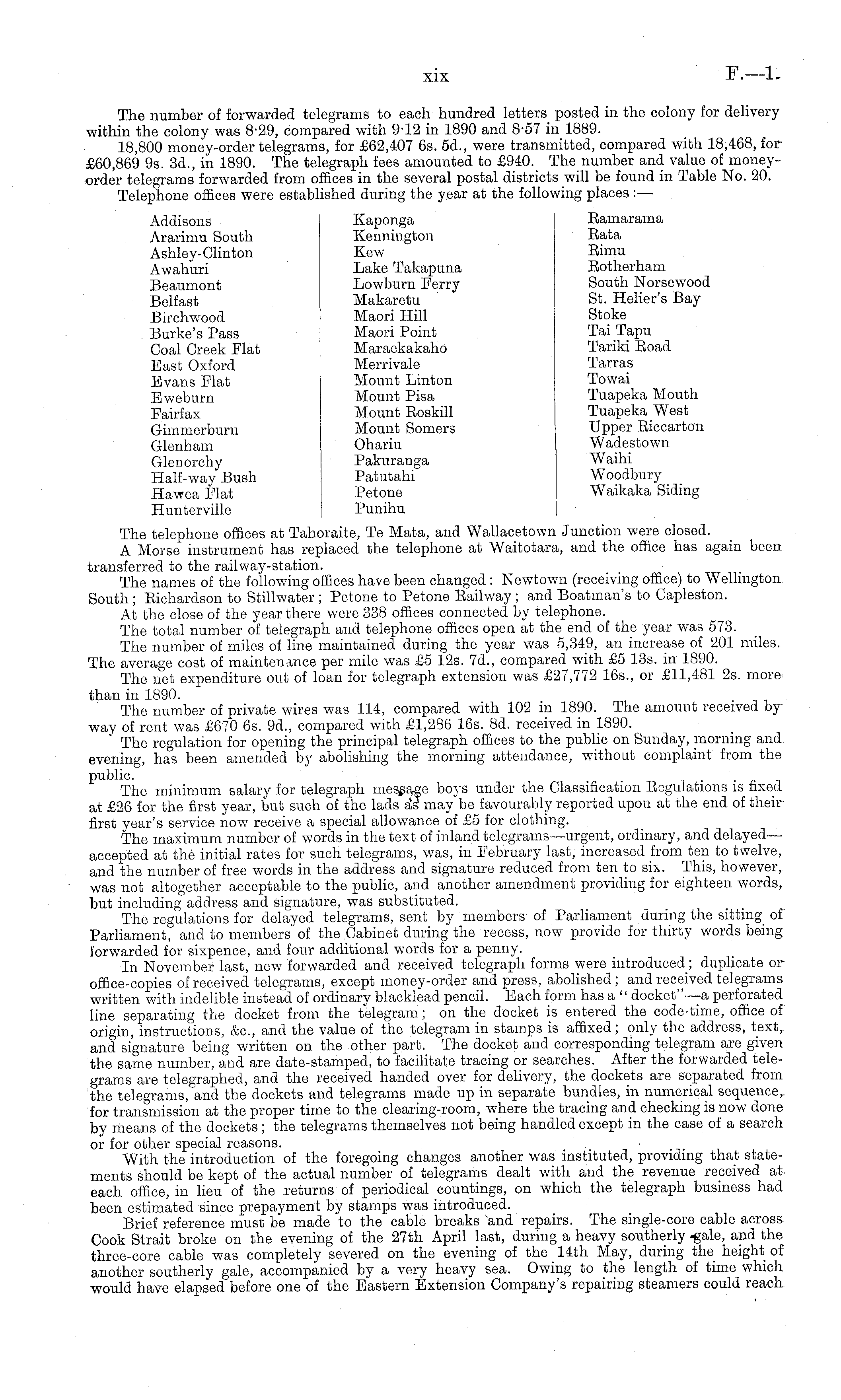 The number of forwarded telegrams to each hundred letters posted in the colony for delivery within the colony was 829, compared with 9-12 in 1890 and 8-57 in 1889. 18,800 money-order telegrams, for £62,407 6s. 5d., were transmitted, compared with 18,468, for £60,869 9s. 3d., in 1890. The telegraph fees amounted to £940. The number and value of moneyorder telegrams forwarded from offices in the several postal districts will be found in Table No. 20. Telephone offices were established during the year at the following places : — Addisons Kaponga Eamarama Ararimu South Kenuington Bata Ashley-Clinton Kew Eimu Awahuri Lake Takapuna Botherham Beaumont Lowburn Ferry South Norsewood Belfast Makaretu St. Helier's Bay Birchwood Maori Hill Stoke Burkes Pass Maori Point Tai Tapu Coal Creek Flat Maraekakaho Tariki Eoad East Oxford Merrivale Tarras Evans Flat Mount Linton Towai Eweburn Mount Pisa Tuapeka Mouth Fairfax Mount Eoskill Tuapeka West Gimmerburn Mount Somers Upper Eiccarton Glenham Ohariu Wadestown Glenorchy Pakuranga Waihi Half-way Bush Patutahi Woodbury Hawea Flat Petone Waikaka Siding Hunterville Punihu The telephone offices at Tahoraite, Te Mata, and Wallacetown Junction were closed. A Morse instrument has replaced the telephone at Waitotara, and the office has again been transferred to the railway-station. The names of the following offices have been changed : Newtown (receiving office) to Wellington South ; Eichardson to Stillwater ; Petone to Petone Eailway ; and Boatman's to Capleston. At the close of the year there were 338 offices connected by telephone. The total number of telegraph and telephone offices open at the end of the year was 573. The number of miles of line maintained during the year was 5,349, an increase of 201 miles. The average cost of maintenance per mile was £5 12s. 7d., compared with £5 13s. in 1890. The net expenditure out of loan for telegraph extension was £27,772 165., or £11,481 2s. more than in 1890. The number of private wires was 114, compared with 102 in 1890. The amount received by way of rent was £670 6s. 9d., compared with £1,286 16s. Bd. received in 1890. The regulation for opening the principal telegraph offices to the public on Sunday, morning and evening, has been amended by abolishing the morning attendance, without complaint from the public. The minimum salary for telegraph menage boys under the Classification Eeguiations is fixed at £26 for the first year, bub such of the lads as may be favourably reported upon at the end of their first year's service now receive a special allowance of £5 for clothing. The maximum number of words in the text of inland telegrams—urgent, ordinary, and delayed— accepted at the initial rates for such telegrams, was, in February last, increased from ten to twelve, and the number of free words in the address and signature reduced from ten to six. This, however, was not altogether acceptable to the public, and another amendment providing for eighteen words, but including address and signature, was substituted. The regulations for delayed telegrams, sent by members of Parliament during the of Parliament, and to members of the Cabinet during the recess, now provide for thirty words being forwarded for sixpence, and four additional words for a penny. In November last, new forwarded and received telegraph forms were introduced; duplicate or office-copies of received telegrams, except money-order and press, abolished; and received telegrams written with indelible instead of ordinary blacklead pencil. Each form has a " docket"—-a perforated line separating the docket from the telegram; on the docket is entered the code-time, office of origin, instructions, &c, and the value of the telegram in stamps is affixed; only the address, text, and signature being written on the other part. The docket and corresponding telegram are given the same number, and are date-stamped, to facilitate tracing or searches. After the forwarded telegrams are telegraphed, and the received handed over for delivery, the dockets are separated from the telegrams, and the dockets and telegrams made up in separate bundles, in numerical sequence,, for transmission at the proper time to the clearing-room, where the tracing and checking is now done by means of the dockets; the telegrams themselves not being handled except in the case of a search or for other special reasons. With the introduction of the foregoing changes another was instituted, providing that statements should be kept of the actual number of telegrams dealt with and the revenue received at each office, in lieu of the returns of periodical countings, on which the telegraph business had been estimated since prepayment by stamps was introduced. Brief reference must be made to the cable breaks and repairs. The single-core cable across Cook Strait broke on the evening of the 27th April last, during a heavy southerly -gale, and the three-core cable was completely severed on the evening of the 14th May, during the height of another southerly gale, accompanied by a very heavy sea. Owing to the length of time which would have elapsed before one of the Eastern Extension Company's repairing steamers could reach