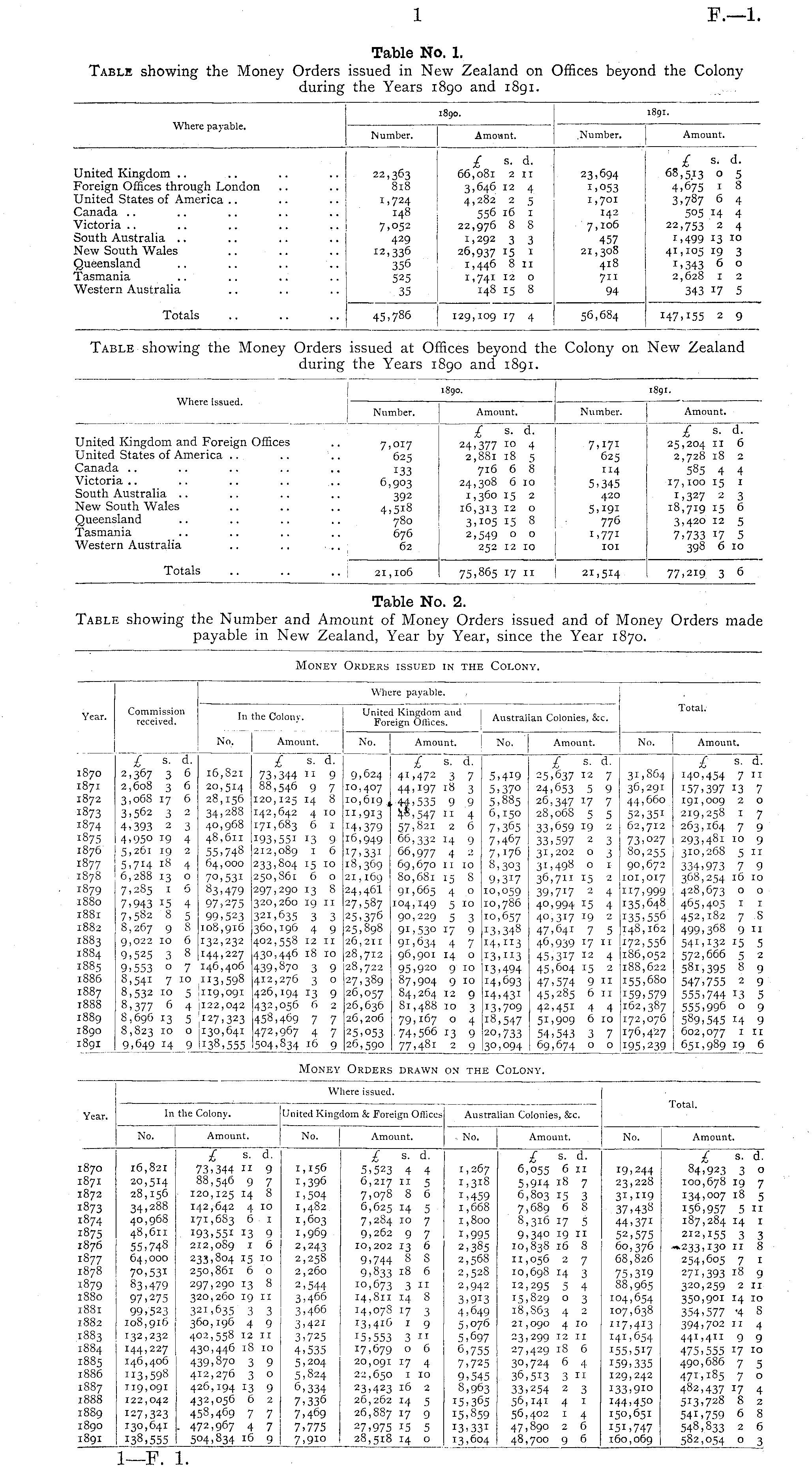 Table No. 1. Table showing the Money Orders issued in New Zealand on Offices beyond the Colony during the Years 1890 and 1891.
