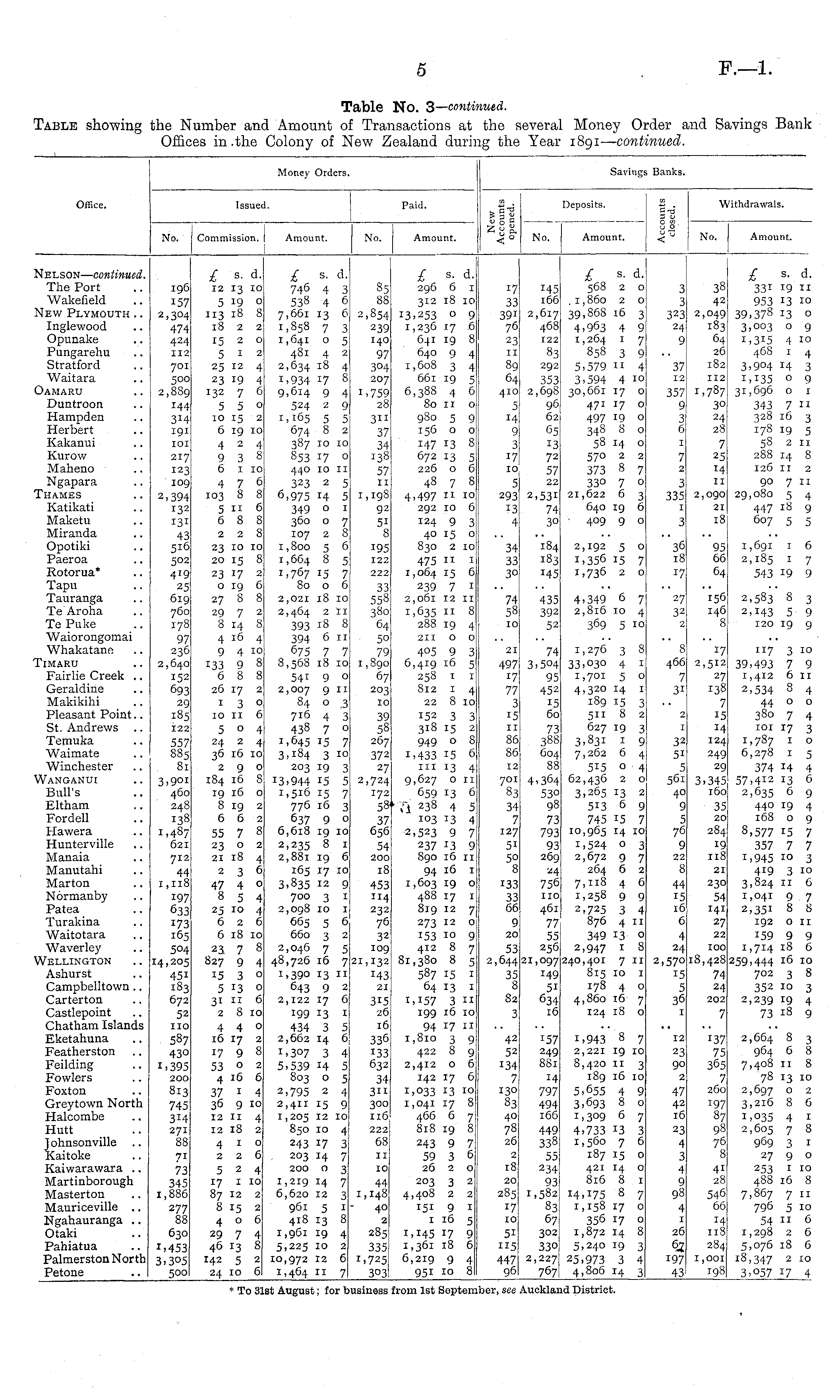 Table No. 3— continued. Table showing the Number and Amount of Transactions at the several Money Order and Savings Bank Offices in the Colony of New Zealand during the Year 1891 — continued.