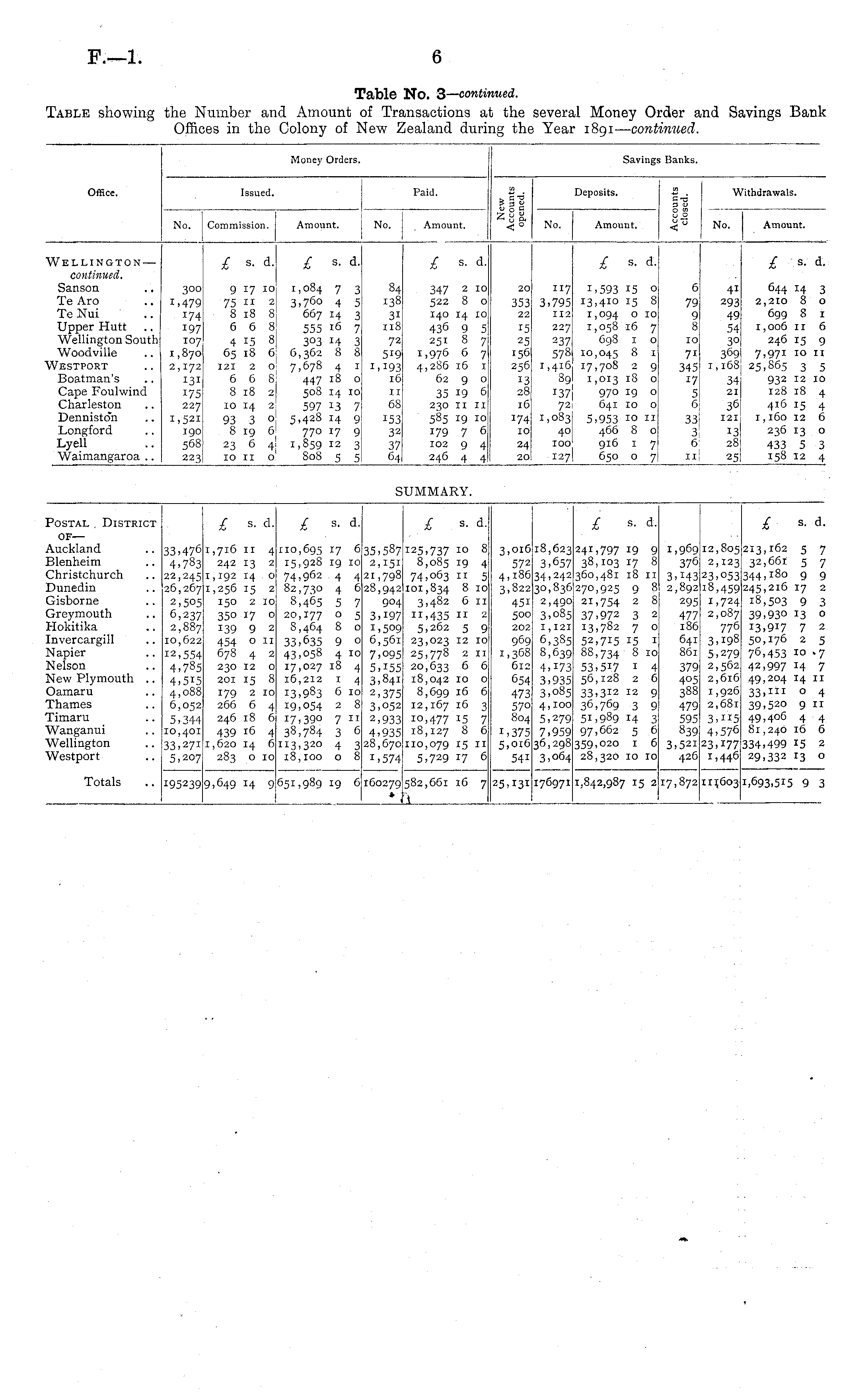 Table No. 3 — continued. Table showing the Number and Amount of Transactions at the several Money Order and Savings Bank Offices in the Colony of New Zealand during the Year 1891 — continued.
