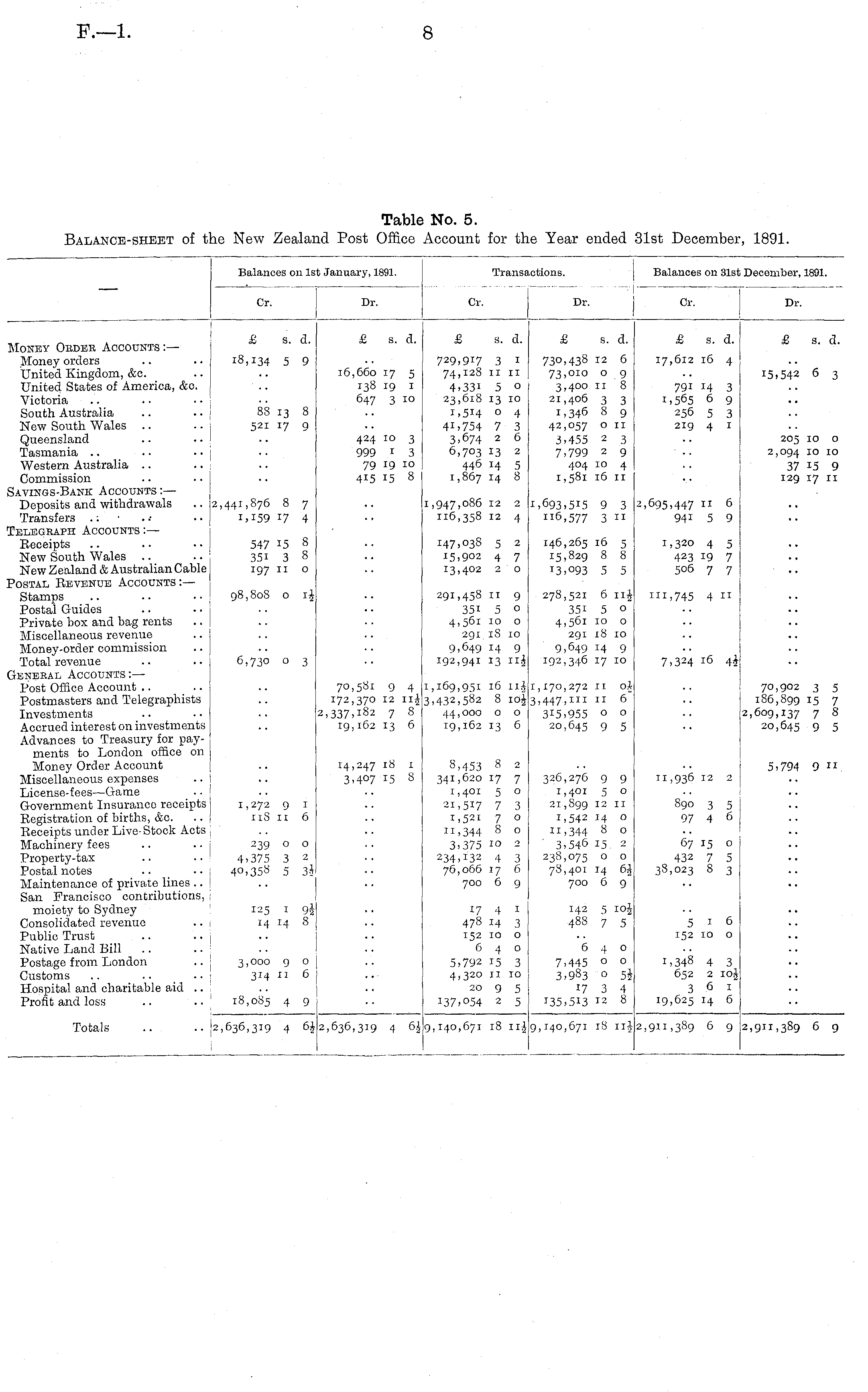 Table No. 5. Balance-sheet of the New Zealand Post Office Account for the Year ended 31st December, 1891.