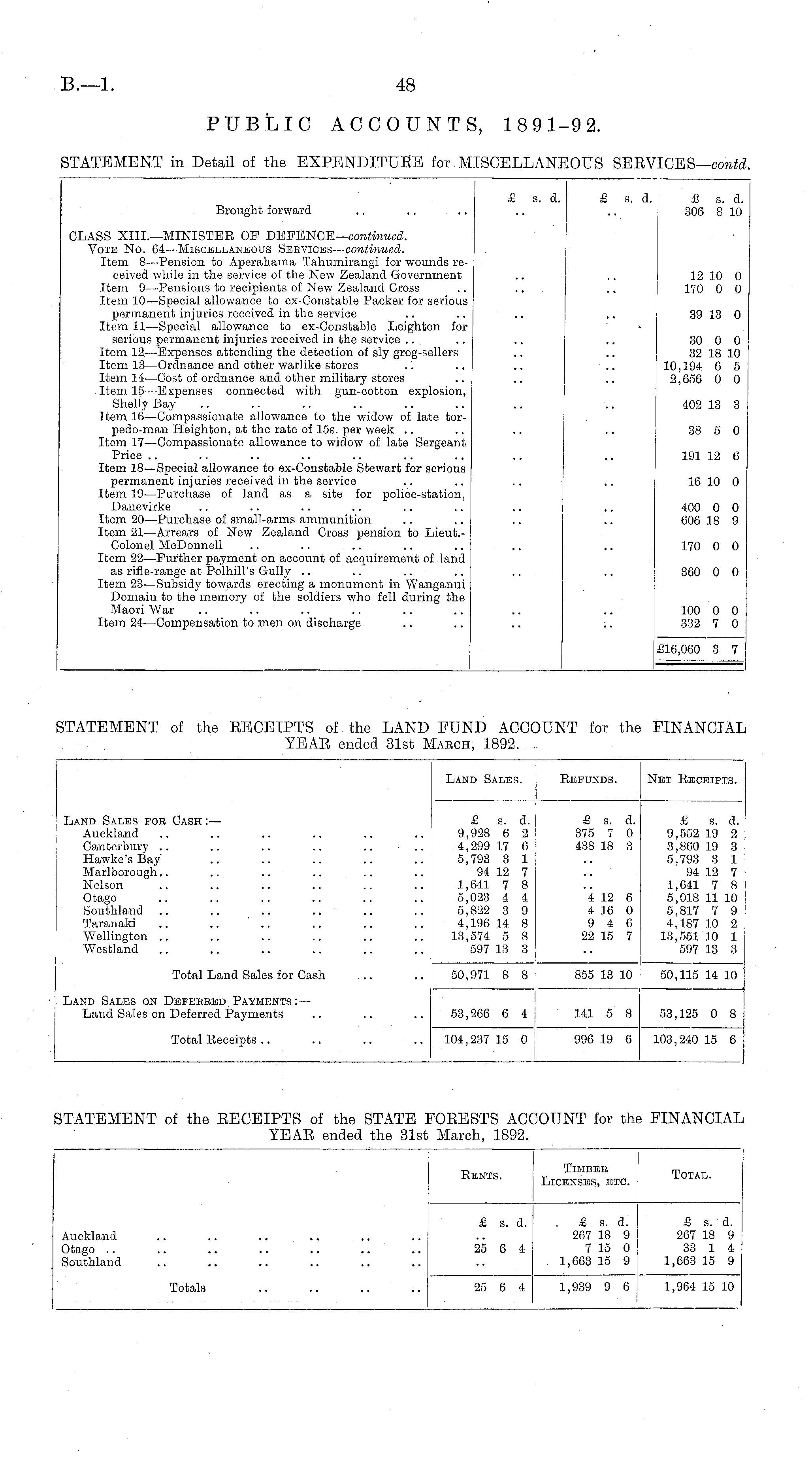 STATEMENT of the RECEIPTS of the LAND FUND ACCOUNT for the FINANCIAL YEAR ended 31st March, 1892.