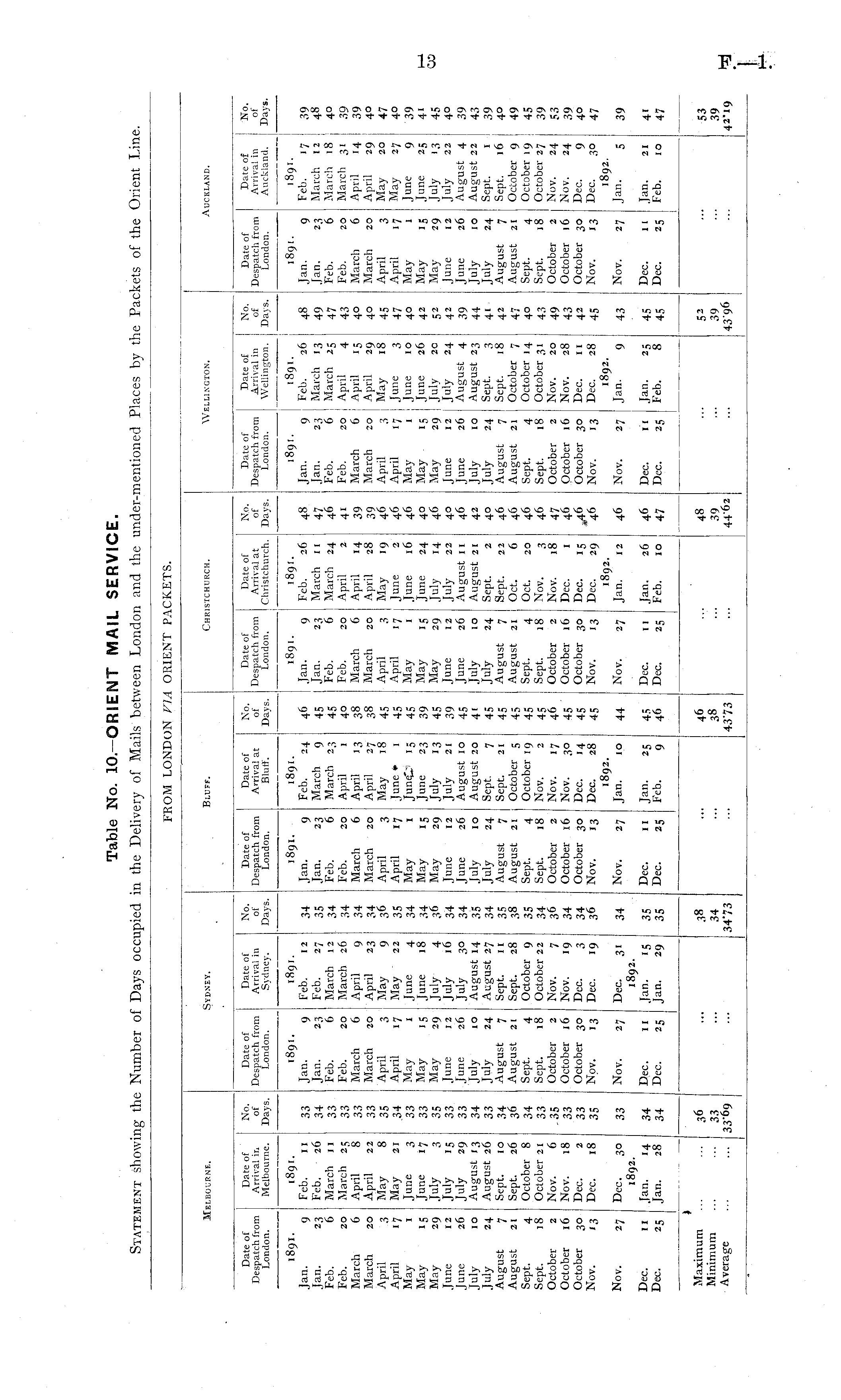 FROM LONDON VI. ORIENT PACKETS. Melbourne. Sydney. Bluff. Christchurch. Wellington. Auckland. Date of Despatch from London. 1891. Jan. 9 Jan. 23 Feb. 6 Feb. 20 March 6 March 20 April 3 April 17 May 1 May 1 s May 29 June 12 June 26 July 10 July 24 August 7 August 21 Sept. 4 Sept. 18 October 2 October 16 October 30 Nov. 1 3 Date of Arrival in Melbourne. 1891. Feb. 11 Feb. 26 March 11 March 25 April 8 April 22 May 8 May 21 June 3 June 17 July 3 Ju'y '5 July 29 August 13 August 26 Sept. 10 Sept. 26 October 8 October 2 1 Nov. 6 Nov. 18 Dec. 2 Dec. 18 No. of Days. 33 34 33 33 33 35 34 33 33 35 33 33 34 33 34 36 34 33 35 33 33 35 Date of Despatch from London. t 1891. Jan. 9 Jan. 23 Feb. 6 Feb. 20 March 6 March 20 April 3 April 17 May 1 May 15 May 29 June 12 June 26 July 10 July 24 August 7 August 21 Sept. 4 Sept. 18 October 2 October 16 October 30 Nov. 13 Date of Arrival in Sydney. 1891. Feb. 12 Feb. 27 March 12 March 26 April 9 April 23 May 9 May 2 2 June 4 June 18 July 4 July 16 July 3° August 14 August 27 Sept. 11 Sept. 28 October 9 October 22 j Nov. 7 I Nov. 19 j Dec. 3 J Dec. 19 No. of Days. 34 35 I- 34 I 34 1 34 34 36 35 i 34 I 34 34 ! 34 35 34 i 35 38 35 36 34 34 36 Date of Despatch from London. ■ 1 1891. Jan. 9 Jan. 23 Feb. 6 Feb. 20 March 6 March 20 April 3 April 17 May 1 May 1 5 May 29 June 12 June 26 July 10 July 24 August 7 August 21 Sept. 4 Sept. 18 October 2 October 16 October 30 Nov. 13 Date of Arrival at Bluff. 189 1. Feb. 24 March 9 March 23 April 1 April 13 April 27 May 18 J une * 1 Junel" 15 June 23 July 13 July 2 1 August 10 August 20 Sept. 7 Sept. 2 1 October 5 October 19 Nov. 2 Nov. 17 Nov. 30 Dec. 14 Dec. 28 1892. Jan. 10 No. oi Days. 46 45 45 40 38 38 45 45 45 39 : 45 : 39 45 4' 45 45 45 45 j 45 46 45 45 i 45 : Date of Despatch from London. 189 I - Jan. 9 Jan. 23 Feb. 6 Feb. 20 March 6 March 20 April 3 April 17 May 1 May 15 May 29 June 12 June 26 July 10 July 24 August 7 August 21 Sept. 4 Sept. 18 October 2 October 16 October 30 Nov. 13 Date of Arrival at Christchurch. 1 189I. Feb. 26 March 11 March 24 April 2 April 14 April 28 May 19 June 2 June 16 June 24 July 14 July 22 August 11 August 21 Sept. 2 Sept. 22 Oct. 6 Oct. 20 Nov. 3 Nov. 18 Dec. 1 Dec. 13 Dec. 29 1892. No. of Days. 48 47 46 4i 39 39 46 46 46 40 46 40 46 42 40 46 46 46 46 47 46 46 46 1891. Jan. 9 I Jan. 23 Feb. 6 Feb. 20 March 6 March 20 April 3 April 17 May 1 May 15 May 29 June 12 June 26 July 10 July 24 ! August 7 August 21 Sept. 4 Sept. 18 October 2 October 16 October 30 Nov. 13 Date of Despatch from London. 1891. Feb. 26 March 13 March 25 April 4 April 15 April 29 May 18 June 3 June 10 June 26 July 20 July 24 August 4 August 23 Sept. 3 Sept. 18 October 7 October 14 October 31 Nov. 20 Nov. 28 Dec. 11 Dec. 28 1892. Date of Arrival in Wellington. No. of Days. 48 49 47 43 40 40 45 47 40 42 52 42 39 44 ; 4. 42 I 47 40 43 i 49 43 42 45 Date of Despatch from London. 1891. Jan. 9 Jan. 23 Feb. 6 Feb. 20 March 6 March 20 April 3 April 17 May 1 May 15 May 29 June 12 June 26 July 10 July 24 August 7 August 21 Sept. 4 Sept. 18 October 2 October 16 October 30 Nov. 13 Date of ! No. Arrival in ; ot Auckland. | Days 1891. Feb. 17 ! 39 March 12 48 March 18 40 March 31 39 April 14 ! 39 April 29 40 May 20 ! 47 May 27 40 June 9 J 39 June 25 41 July 13 45 July 22 i 40 August 4 J 39 August 22 ] 43 Sept. 1 : s<) Sept. 16 40 October 9 49 October 19 45 October 27 39 Nov. 24 $3 Nov. 24 39 Dec. 9 40 Dec. 30 1 47 1892. Nov. 27 Dec. 30 1892. 33 Nov. 27 Dec. 31 1892. 34 Nov. 27 44 Nov. 27 Jan. 12 46 Nov. 27 Jan. 9 43 Nov. 27 J a "- 5 I 39 Dec. 11 Jan. 14 Jan. 28 34 34 Dec. 11 Dec. 25 Jan. 15 Jan. 29 35 35 Dec. 1 1 Dec. 25 Jan. 25 Feb. 9 45 1 46 I Dec. 1 1 Dec. 25 Jan. 26 Feb. 10 46 47 Dec. 11 Dec. 25 Jan. 25 Feb. 8 45 45 Dec. 1 1 Dec. 25 1 Jan. 21 J 41 Feb. 10 J 47 Dec. 25 1 I 4 Maximum Minimum Average 36 33 33-69 ) 38 34 3473 46 38 4373 48 39 4462 39 439 6 53 39 42"n