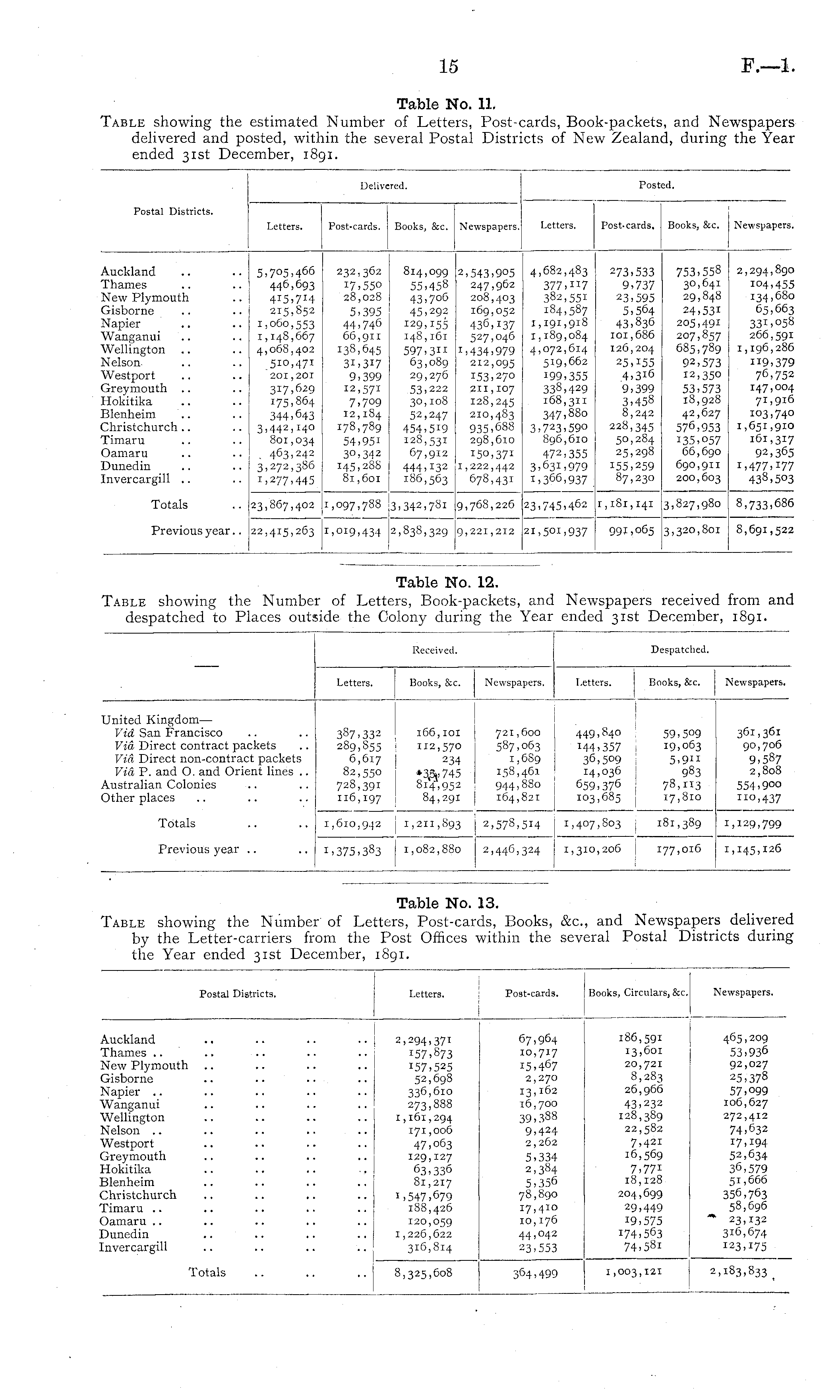 Postal Districts. Delivered. j ■ Post-cards. Books, &c. Newspapers, Delivered. Letters. Posted. Post-cards. Books, &c. Newspapers, Posted. Letters. I Auckland rhames Mew Plymouth jisborne Napier vVanganui Wellington kelson vVestport j-reymouth Hlokitika Blenheim "hristchurch rimaru Damaru 3unedin jivercargill 5,705,466 446,693 4 I 5,7 I 4 215,852 1,060,553 1,148,667 4,068,402 510,471 201,201 317,629 175,864 344,643 3,442,140 I 801,034 , 463,242 3,272,386 !,277,445 232,362 17,550 28,028 5,395 44,746 66,911 138,645 3i,3i7 9,399 12,571 7>7°9 12,184 : 178,789 54,951 30,342 145,288 81,601 i 814,099 55,458 43.7O0 45,292 129,155 148,161 597,3" 63,089 29,276 53,222 3O,IO8 52,247 454,519 128,531 67,912 444, J 3 2 i 186,563 2,543,905 247,962 208,403 169,052 436,137 527,046 1,434,979 212,095 153,270 211,107 128,245 210,483 935,688 298,610 150,37 1 1,222,442 678,431 4,682,483 377,"7 i 382,551 184,587 1,191,918 1,189,084 4,072,614 519,662 I 99,355 338,429 168,311 347,880 3,723,59o 896,610 ! 472,355 3,631,979 1,366,937 273,533 9,737 23,595 5,564 43,836 101,686 126,204 25,155 4,3i6 9,399 3,458 8,242 228,345 50,284 25,298 155,259 87,230 753,558 30,641 29,848 24,531 205,491 207,857 685,789 92,573 12,35° 53,573 18,928 42,627 576,953 135,057 66,690 690,911 200,603 2,294,890 104,455 134,680 65,663 331,058 266,591 1,196,286 "9,379 76,752 147,004 71,916 103,740 1,651,910 161,317 92,365 i>477.377 438,503 Totals ■ 1 1 23,867,402 1,097,788 ! 3,342,781 9,768,226 231745>462 '1,181,141 991,065 3,827,980 3,320,801 8.733,681 I 8,691,52: Previous year.. 22,415,263 1,019,434 2,838,329 9,221,212 21,501,937