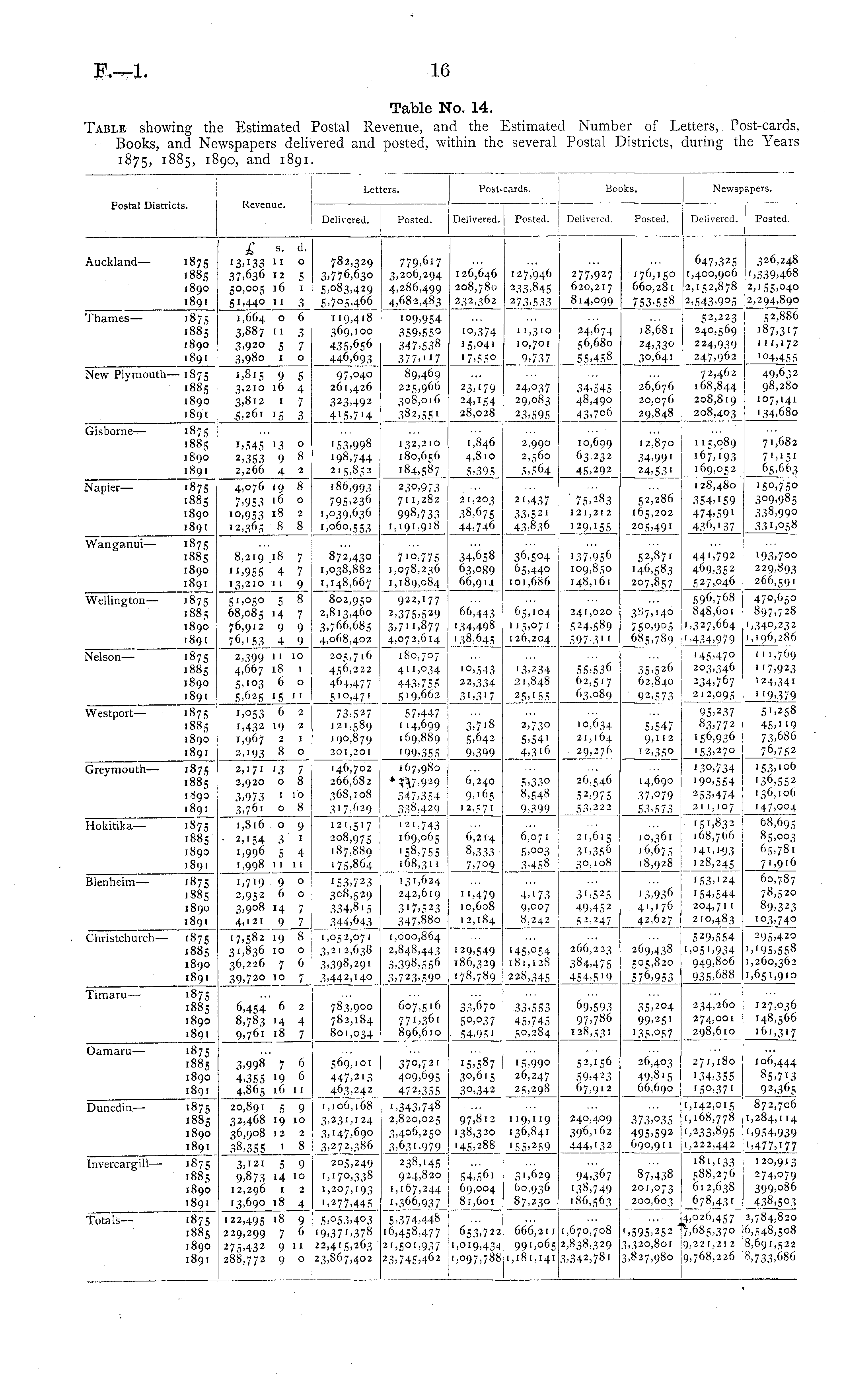 Postal Districts. Revenue. Letter i Delivered. Letters. :rs. Posted. Post-cards. Book Delivered. Posted. ; Delivered. I Post-cards. Books. ks. Posted. Delivered. Posted. Newspapers. Auckland — 1875 1885 1890 1891 £ s. d. I3,i33 J 1 o 37,636 12 s 50,005 16 I 5',44O 11 3_ 782,329 3,776,630 5,08.3,429 5,705,466 779,617 3,206,294 4,286,499 4.682,483 126,646 208,780 232,362 127,946 233,845 273,533 277,927 620,217 814,099 176,150 660,281 753,558 647,325 [,400,906 2,152,878 2,543,9O5 326,248 ',339,468 2,i5S>°4° 2,294,890 hames — 1875 1885 1890 1891 1,664 ° 6 3,887 'I 3 3,920 5 7 3,980 1 o 119,418 369,100 435>656 446,693 io9,954 359,55° 347,538 377,'i7 io,374 15,041 17,55° 11,310 10,701 9,737 24,674 56,680 55,458 18,681 24,330 30,641 52,223 240,569 2 24,939 247,962 72,462 168,844 208,819 208,403 52,886 187,317 111,172 104.455 49,632 98,280 107,141 134,680 lew Plymouth — 1875 1885 1890 1891 1.815 9 5 3,210 16 4 3,812 1 7 5,261 15 3 97,040 261,426 323,49 3 4'5,7'4 89,469 225,966 308,016 382,551 23,'79 24,154 28,028 24,037 29,083 23,595 34,545 48,490 43,7o 6 26,676 20,076 29,848 Gisborne— 1885 1890 189! 1,545 13 ° 2,353 9 s 2,266 4 2 153,998 198,744 215,852 132,210 180,656 184,587 1,846 4,810 5,395 2,990 2, 5,564 10,699 63.232 45,292 12,870 34,99' 24,53' 115,089 167,193 169,052 71,682 "',151 65,663 apier— '875 '885 1890 1891 4,076 19 8 7,953 16 o 10,953 18 2 12,365 8 8 186,993 795,236 1,039,636 1,060,553 230.973 711,282 998,733 1,191,918 21,203 38,675 44,746 21,437 33,521 43-836 ■ 75,283 121,212 129,155 52,286 165,202 205,49' 128,480 354,'59 474,59' 436,1 37 '5°,75° 3°9,985 338,990 331,058 Wanganui — l8 75 1885 1890 1891 8,219 18 7 11.955 4 7 13,210 11 9 872,430 1,038,882 1,148,667 7io,775 1,078,236 1,189,084 34,658 63,089 66,91.1 36,504 65,440 101,686 137,956 109,850 148,161 52,871 146,583 207,857 441,792 469,352 527,046 193,700 229,893 266,591 Wellington — 1875 1885 1890 1891 5i,°5° 5 8 68,085 14 7 76,912 9 9 76,153 4 9 802,950 2,81 3,460 3,766,685 4,068,402 922,177 2,375,529 3,711,877 4,072,614 66,443 134,498 138.645 65,i°4 "a. 0 ?' 126,204 241,020 524,589 597,3" 337,14° 75 O .9O5 685,789 596,768 848,601 1,327,664 ',434,979 470,650 897,728 [,340,232 1,196,286 ,'elson— 1875 1885 1890 1891 2,399 ! ' 1O 4,667 18 1 5,103 6 o 5,625 15 1 1 205,716 456,222 464,477 5 '0,47' 180,707 411,034 443,755 519,662 10,543 22,334 3',3'7 '3.234 21,848 25,155 55,536 62,517 63,089 35,526 62,840 92,573 145,47° 203,346 234,767 212,095 1 1 1,769 117,923 124,341 119,379 Westport — '875 1885 1890 1891 1,053 6 2 1,432 19 2 1,967 2 1 2,193 8 o 73,527 121,589 190,879 201,201 57,447 114,699 169,889 '99,355 3,7 '8 5,642 9,399 2,73O 5,54' 4,3i6 10,634 21,164 29,276 5.547 9,112 12,350 95,2.37 83,772 '56,936 153,270 51,258 45,'19 73,686 76,752 Greymouth — '875 1885 1890 1891 2,17' '3 7 2,920 o 8 3,973 ' IO 3,761 o 8 146,702 266,682 368,108 317,629 167,980 • 3/5(7,929 347,354 338,429 6,240 9.165 12.571 5,33° 8,548 9,399 26,546 5 2 ,975 53,222 14,690 37,°79 53,573 13°,734 '9°,554 253,474 211,107 ■53,i°6 136,552 136,106 147,004 Hokitika — 1875 1885 1890 1891 1,816 o 9 2,154 3 1 1,996 5 4 1,998 11 ii 121,517 208,975 187,889 175,864 121,743 169,065 158,755 168,31 1 6,214 8,333 7,7°9 6,071 5,o°3 3.458 21,615 31,356 30, 108 10,361 16,675 18,928 151,832 168,706 i4i,i-93 128,245 68,695 85,003 65,781 71,916 Blenheim — 1875 1885 1890 1891 1,719 9 ° 2,952 6 o 3,908 14 7 4,121 9 7 153,723 308,529 334,81 5 344,643 131,624 242,619 3'7.5 23 347,88o 11.479 10,608 12,184 4,i/3 9,007 8,242 31,525 49,452 52,247 '3,936 41,176 42,627 153,124 '54,544 204,711 210,483 60,787 78,52° 89,323 103,740 Christchurch — '875 1885 1890 [891 17,582 19 8 31,836 10 o 36,226 7 6 39,720 10 7 1,052,071 3,212,638 3,398,291 3,442,140 1,000,864 2,848,443 3,398,556 3,723,S9 0 129,549 186,329 '78,78') '45,°54 181,128 228,345 266,223 384,475 454,5'9 269,438 505,820 576,953 529,554 i,o5i,934 949,806 935,688 295,420 ',' 95,558 1,260,362 1,651,910 Timaru — ■875 1885 1890 1891 6,454 6 2 8,783 14 4 9,761 18 7 783,900 782,184 801,034 607,5 16 7 7 1>36 1 896.610 33,670 5°,°37 54-951 33,553 45,745 50,284 69,593 97,786 I2«,K3I 35,204 99,2Si 135,°57 234,260 274,001 298,610 127,036 148,566 '61,317 Oamaru — '8/5 '885 1890 1891 3,998 7 6 4,355 '9 6 4,865 16 ii 569,101 447,213 463,242 37o,72i 409,695 472,355 15.587 3°.6i5 30.342 '5,99° 26,247 25,298 52,156 59.423 67,912 26,403 49.815 66,690 271,180 134,355 ' jjo.37' 106,444 85,7i3 92,365 Dunedin — ■875 1885 1890 1891 20,891 5 9 32,468 19 10 36,908 12 2 38,355 ' 8 1,106,168 3,231,124 3,147,69° 3,272,386 1,343,748 2,820,025 3,406,250 3,631,979 97.812 138,320 145,288 119, 119 136,841 155,25Q 240,409 396,162 444,132 373,035 495,592 690,911 1,142,015 1,168,778 1,233,895 1,222,442 872,706 1,284,114 ',954,939 ',477,'77 Invercargill — l8 75 1885 1890 1891 3,121 5 9 9,873 14 10 12,296 1 2 13,690 18 4 205,249 1,170,338 1.20;,193 1,277,445 238,145 924,820 1,167,244 1,366,937 54>S 6[ 69,004 81,601 31,629 60,936 87,230 94,367 138,749 186,563 87.438 201,073 200,603 181,133 588,276 612,638 6/8,43' 120,913 274,079 399,o86 438,503 Totals — 1875 1885 1890 1891 122,495 l8 9 229,299 7 6 275,432 9 " 288,772 9 o : 5> O 53,4 O 3 '9>37',378 22,415,263 23,867,402 5,374.448 16,458,477 2i,5 o[ >937 2.S,74;.462 653,722 1,097,788 666,211 991,065 [,181,141 1,670,708 2,838,329 3.342.78' ',595.252 3,320,80 [ 3,827,980 4,026,457 7,685.37° 9,221,2] 2 9,768,226 2,784,820 6,548,508 8,691,522 8,733,686
