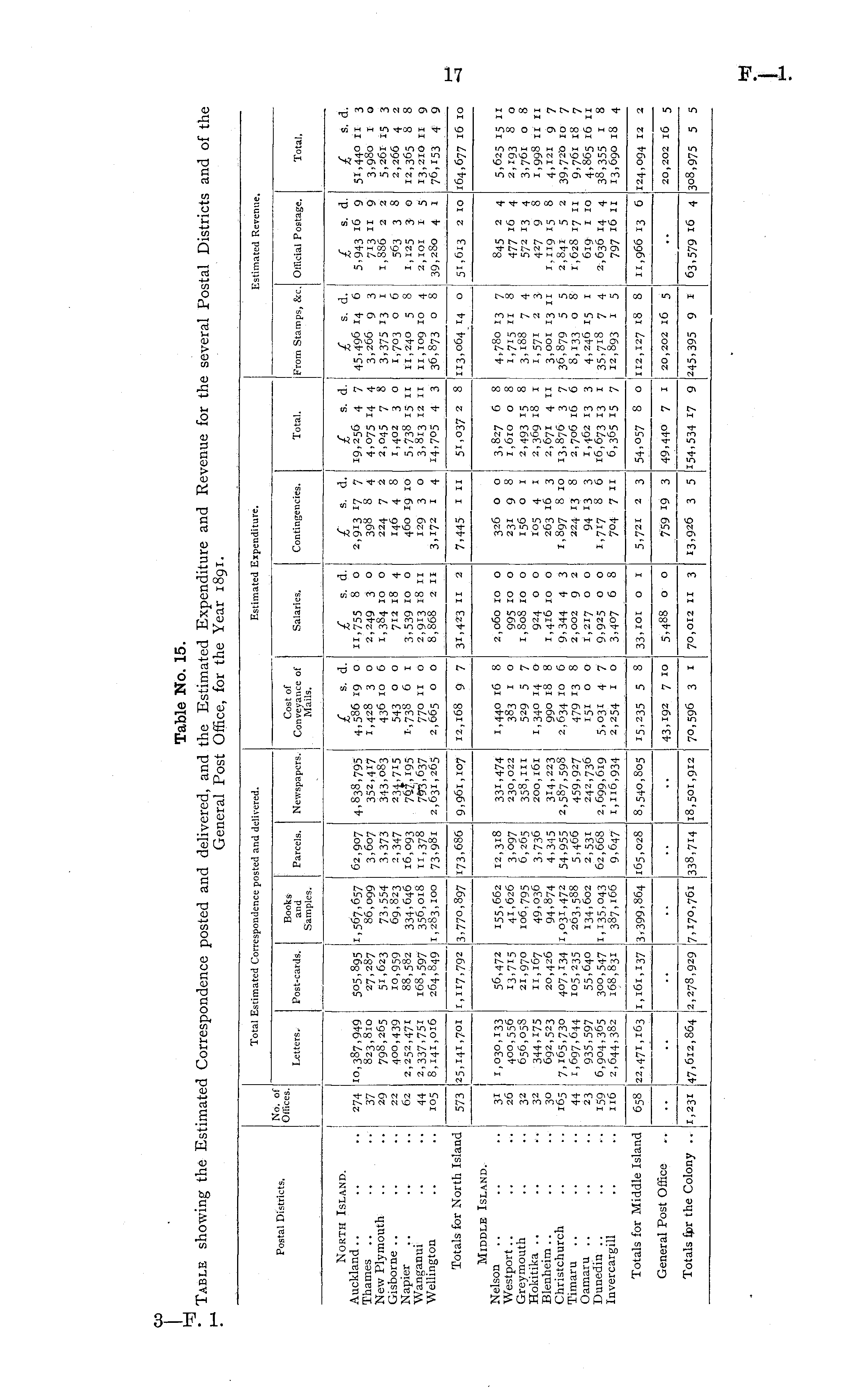 Table No. 15. Table showing the Estimated Correspondence posted and delivered, and the Estimated Expenditure and Revenue for the several Postal Districts and of the General Post Office, for the Year 1891.