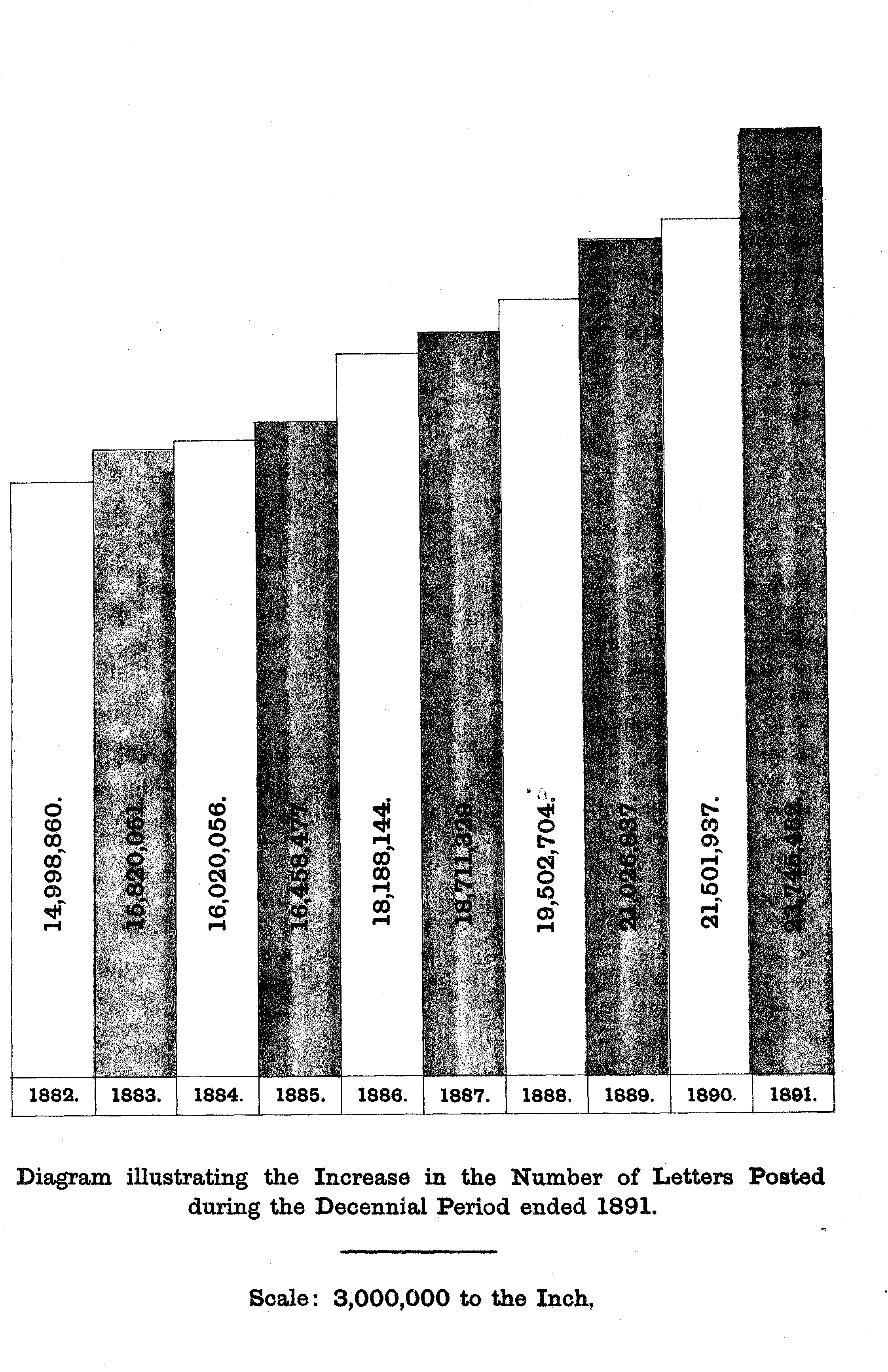 Diagram illustrating the Increase in the Number of Letters Posted during the Decennial Period ended 1891.