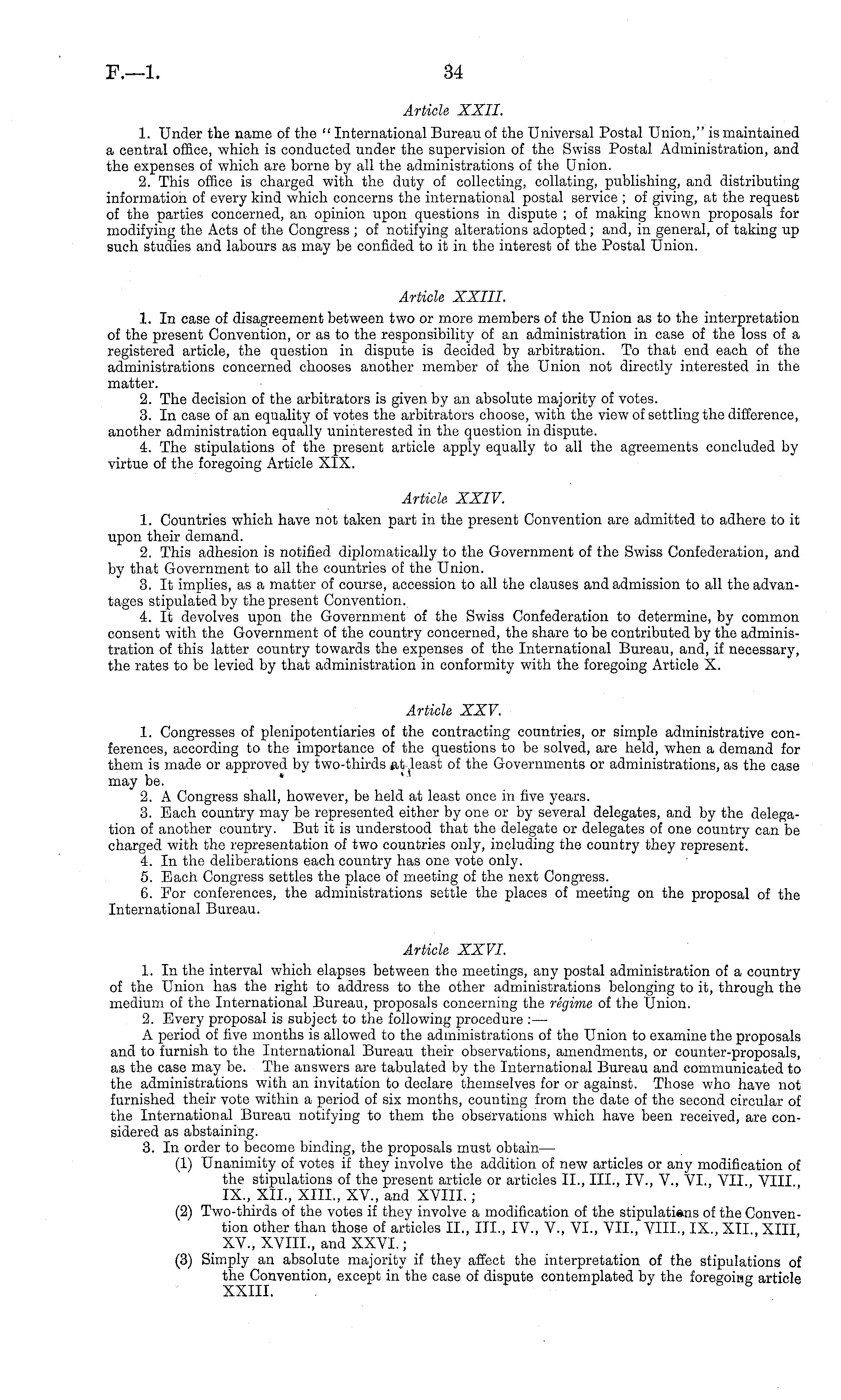 Article XXII. 1. Under the name of the " International Bureau of the Universal Postal Union," is maintained a central office, which is conducted under the supervision of the Swiss Postal Administration, and the expenses of which are borne by all the administrations of the Union. 2. This office is charged with the duty of collecting, collating, publishing, and distributing information of every kind which concerns the international postal service ; of giving, at the request of the parties concerned, an opinion upon questions in dispute ; of making known proposals for modifying the Acts of the Congress ; of notifying alterations adopted; and, in general, of taking up such studies and labours as may be confided to it in the interest of the Postal Union. Article XXIII. 1. In case of disagreement between two or more members of the Union as to the interpretation of the present Convention, or as to the responsibility of an administration in case of the loss of a registered article, the question in dispute is decided by arbitration. To that end each of the administrations concerned chooses another member of the Union not directly interested in the matter. 2. The decision of the arbitrators is given by an absolute majority of votes. 3. In case of an equality of votes the arbitrators choose, with the view of settling the difference, another administration equally uninterested in the question in dispute. 4. The stipulations of the present article apply equally to all the agreements concluded by virtue of the foregoing Article XIX. Article XXIV. 1. Countries which have not taken part in the present Convention are admitted to adhere to it upon their demand. 2. This adhesion is notified diplomatically to the Government of the Swiss Confederation, and by that Government to all the countries of the Union. 3. It implies, as a matter of course, accession to all the clauses and admission to all the advantages stipulated by the present Convention. 4. It devolves upon the Government of the Swiss Confederation to determine, by common consent with the Government of the country concerned, the share to be contributed by the administration of this latter country towards the expenses of the International Bureau, and, if necessary, the rates to be levied by that administration in conformity with the foregoing Article X. Article XXV. 1. Congresses of plenipotentiaries of the contracting countries, or simple administrative conferences, according to the importance of the questions to be solved, are held, when a demand for them is made or approved by two-thirds at ( least of the Governments or administrations, as the case may be. 2. A Congress shall, however, be held at least once in five years. 3. Each country may be represented either by one or by several delegates, and by the delegation of another country. But it is understood that the delegate or delegates of one country can be charged with the representation of two countries only, including the country they represent. 4. In the deliberations each country has one vote only. 5. Each Congress settles the place of meeting of the next Congress. 6. For conferences, the administrations settle the places of meeting on the proposal of the International Bureau. Article XXVI. 1. In the interval which elapses between the meetings, any postal administration of a country of the Union has the right to address to the other administrations belonging to it, through the medium of the International Bureau, proposals concerning the regime of the Union. 2. Every proposal is subject to the following procedure : — A period of five months is allowed to the administrations of the Union to examine the proposals and to furnish to the International Bureau their observations, amendments, or counter-proposals, as the case may be. The answers are tabulated by the International Bureau and communicated to the administrations with an invitation to declare themselves for or against. Those who have not furnished their vote within a period of six months, counting from the date of the second circular of the International Bureau notifying to them the observations which have been received, are considered as abstaining. 3. In order to become binding, the proposals must obtain — (1) Unanimity of votes if they involve the addition of new articles or any modification of the stipulations of the present article or articles 11., 111., IV., V., VI., VII VIII IX., XII., XIII., XV., and XVIII.; (2) Two-thirds of the votes if they involve a modification of the stipulations of the Convention other than those of articles 11., 111., IV., V., VI., VII., VIII., IX., XII. XIII XV., XVIII., and XXVI.; (3) Simply an absolute majority if they affect the interpretation of the stipulations of the Convention, except in the case of dispute contemplated by the foregoiiag article XXIII.