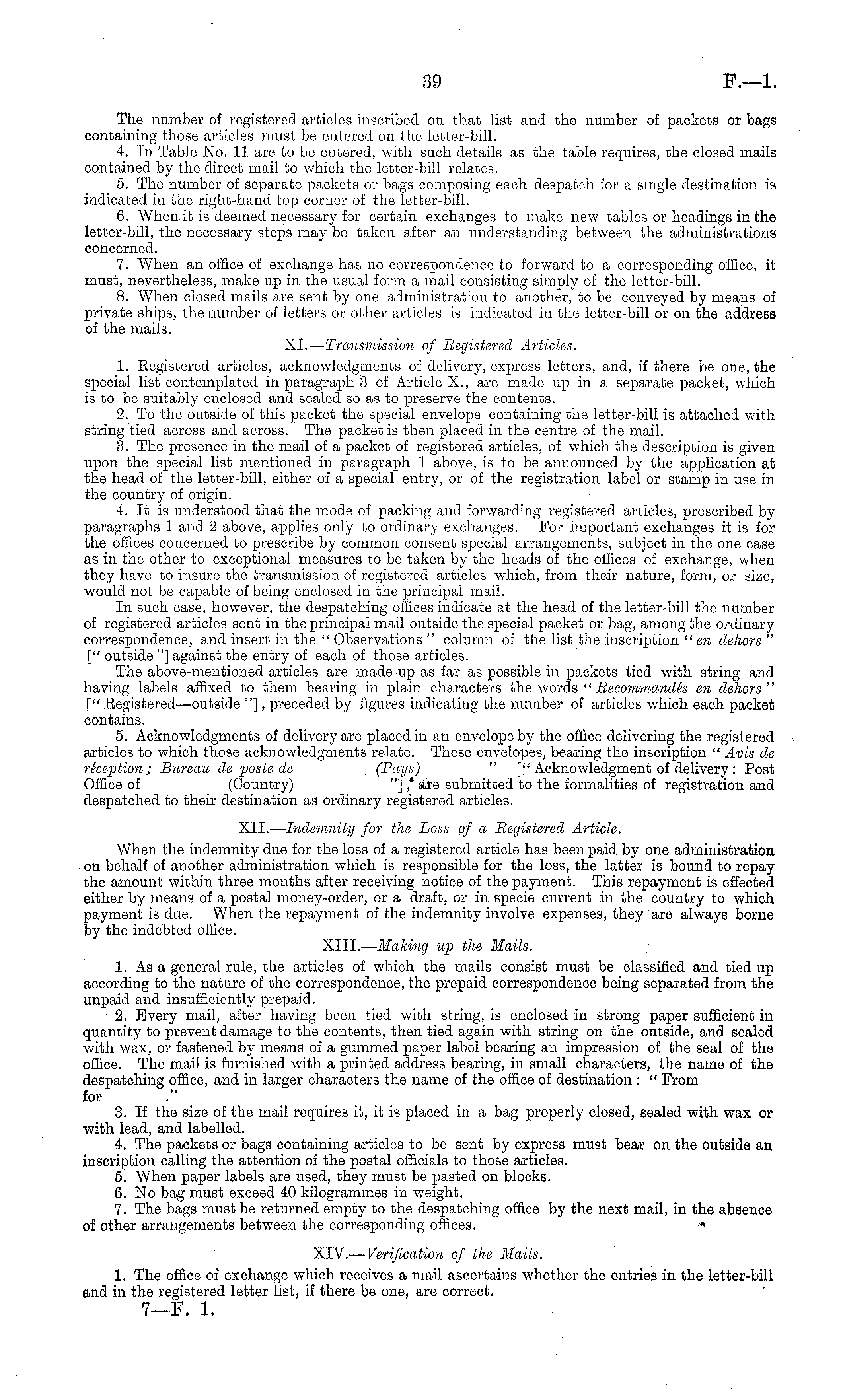 The number of registered articles inscribed on that list and the number of packets or bags containing those articles must be entered on the letter-bill. 4. In Table No. 11 are to be entered, with such details as the table requires, the closed mails contained by the direct mail to which the letter-bill relates. 5. The number of separate packets or bags composing each despatch for a single destination is indicated in the right-hand top corner of the letter-bill. 6. When it is deemed necessary for certain exchanges to make new tables or headings in the letter-bill, the necessary steps may be taken after an understanding between the administrations concerned. 7. When an office of exchange has no correspondence to forward to a corresponding office, it must, nevertheless, make up in the usual form a mail consisting simply of the letter-bill. 8. When closed mails are sent by one administration to another, to be conveyed by means of private ships, the number of letters or other articles is indicated in the letter-bill or on the address of the mails. XI. — Transmission of Registered Articles. 1. Registered articles, acknowledgments of delivery, express letters, and, if there be one, the special list contemplated in paragraph 3 of Article X., are made up in a separate packet, which is to be suitably enclosed and sealed so as to preserve the contents. 2. To the outside of this packet the special envelope containing the letter-bill is attached with string tied across and across. The packet is then placed in the centre of the mail. 3. The presence in the mail of a packet of registered articles, of which the description is given upon the special list mentioned in paragraph 1 above, is to be announced by the application at the head of the letter-bill, either of a special entry, or of the registration label or stamp in use in the country of origin. 4. It is understood that the mode of packing and forwarding registered articles, prescribed by paragraphs 1 and 2 above, applies only to ordinary exchanges. For important exchanges it is for the offices concerned to prescribe by common consent special arrangements, subject in the one case as in the other to exceptional measures to be taken by the heads of the offices of exchange, when they have to insure the transmission of registered articles which, from their nature, form, or size, would not be capable of being enclosed in the principal mail. In such case, however, the despatching offices indicate at the head of the letter-bill the number of registered articles sent in the principal mail outside the special packet or bag, among the ordinary correspondence, and insert in the " Observations " column of the list the inscription "en dehors " [" outside "] against the entry of each of those articles. The above-mentioned articles are made up as far as possible in packets tied with string and having labels affixed to them bearing in plain characters the words " Becommandes en dehors" [" Registered—outside "], preceded by figures indicating the number of articles which each packet contains. 5. Acknowledgments of delivery are placed in an envelope by the office delivering the registered articles to which those acknowledgments relate. These envelopes, bearing the inscription " Avis de reception; Bureau de poste de (Pays) " ['.' Acknowledgment of delivery : Post Office of (Country) "] * site submitted to the formalities of registration and despatched to their destination as ordinary registered articles. Xll.— lndemnity for the Loss of a Registered Article. When the indemnity due for the loss of a registered article has been paid by one administration on behalf of another administration which is responsible for the loss, the latter is bound to repay the amount within three months after receiving notice of the payment. This repayment is effected either by means of a postal money-order, or a draft, or in specie current in the country to which payment is due. When the repayment of the indemnity involve expenses, they are always borne by the indebted office. Xlll.— Making up the Mails. 1. As a general rule, the articles of which the mails consist must be classified and tied up according to the nature of the correspondence, the prepaid correspondence being separated from the unpaid and insufficiently prepaid. 2. Every mail, after having been tied with string, is enclosed in strong paper sufficient in quantity to prevent damage to the contents, then tied again with string on the outside, and sealed with wax, or fastened by means of a gummed paper label bearing an impression of the seal of the office. The mail is furnished with a printed address bearing, in small characters, the name of the despatching office, and in larger characters the name of the office of destination : " From for 3. If the size of the mail requires it, it is placed in a bag properly closed, sealed with wax or with lead, and labelled. 4. The packets or bags containing articles to be sent by express must bear on the outside an inscription calling the attention of the postal officials to those articles. 5. When paper labels are used, they must be pasted on blocks. 6. No bag must exceed 40 kilogrammes in weight. 7. The bags must be returned empty to the despatching office by the next mail, in the absence of other arrangements between the corresponding offices. XlV.— Verification of the Mails. 1. The office of exchange which receives a mail ascertains whether the entries in the letter-bill and in the registered letter list, if there be one, are correct. 7—F. 1.