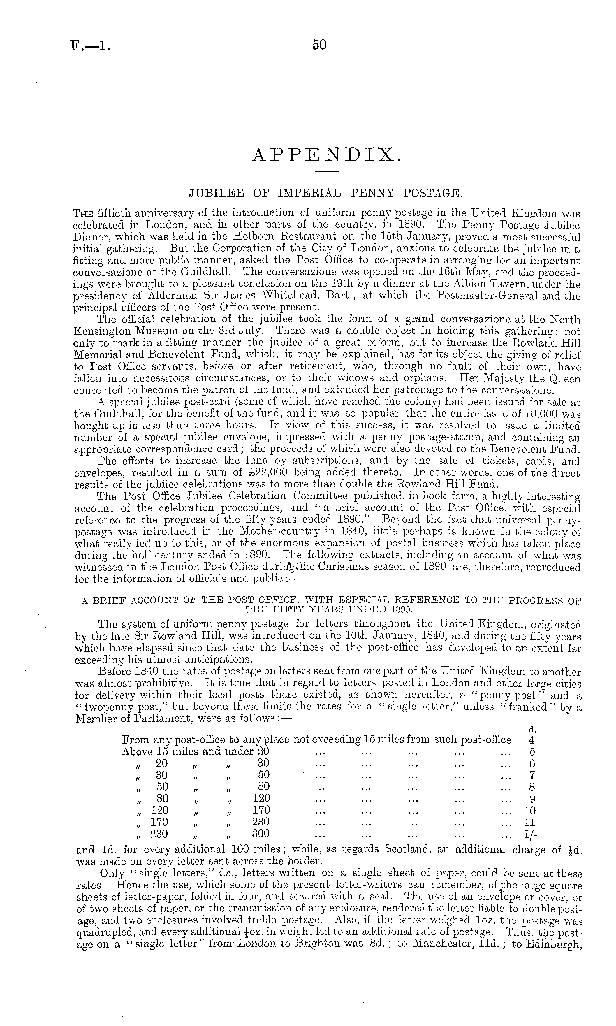 JUBILEE OP IMPEEIAL PENNY POSTAGE. The fiftieth anniversary of the introduction of uniform penny postage in the United Kingdom was celebrated in London, and in other parts of the country, in 1890. The Penny Postage Jubilee Dinner, which was held in the Holborn Restaurant on the 15th January, proved a most successful initial gathering. But the Corporation of the City of London, anxious to celebrate the jubilee in a fitting and more public manner, asked the Post Office to co-operate in arranging for an important conversazione at the Guildhall. The conversazione was opened on the 16th May, and the proceedings were brought to a pleasant conclusion on the 19th by a dinner at the Albion Tavern, under the presidency of Alderman Sir James Whitehead, Bart., at which the Postmaster-General and the principal officers of the Post Office were present. The official celebration of the jubilee took the form of a grand conversazione at the North Kensington Museum on the 3rd July. There was a double object in holding this gathering: not only to mark in a fitting manner the jubilee of a great reform, but to increase the Eowland Hill Memorial and Benevolent Fund, which, it may be explained, has for its object the giving of relief to Post Office servants, before or after retirement, who, through no fault of their own, have fallen into necessitous circumstances, or to their widows and orphans. Her Majesty the Queen consented to become the patron of the fund, and extended her patrona.ge to the conversazione. A special jubilee post-card (some of which have reached the colony) had been issued for sale at the Guildhall, for the benefit of the fund, and it was so popular that the entire issue of 10,000 was bought up in less than three hours. In view of this success, it was resolved to issue a limited number of a special jubilee envelope, impressed with a penny postage-stamp, and containing an appropriate correspondence card; the proceeds of which were also devoted to the Benevolent Eund. The efforts to increase the fund by subscriptions, and by the sale of tickets, cards, and envelopes, resulted in a sum of £22,000 being added thereto. In other words, one of the direct results of the jubilee celebrations was to more than double the Eowland Hill Eund. The Post Office Jubilee Celebration Committee published, in book form, a highly interesting account of the celebration proceedings, and "a brief account of the Post Office, with especial reference to the progress of the fifty years ended 1890." Beyond the fact that universal pennypostage was introduced in the Mother-country in 1840, little perhaps is known in the colony of what really led up to this, or of the enormous expansion of postal business which has taken place during the half-century ended in 1890. The following extracts, including an account of what was witnessed in the London Post Office Christmas season of 1890, are, therefore, reproduced for the information of officials and public : — A BRIEF ACCOUNT OF THE POST OFFICE, WITH ESPECIAL REFERENCE TO THE PROGRESS OF THE FIFTY YEARS ENDED 1890. The system of uniform penny postage for letters throughout the United Kingdom, originated by the late Sir Eowland Hill, was introduced on the 10th January, 1840, and during the fifty years which have elapsed since that date the business of the post-office has developed to an extent far exceeding his utmost anticipations. Before 1840 the rates of postage on letters sent from one part of the United Kingdom to another was almost prohibitive. It is true that in regard to letters posted in London and other largo cities for delivery within their local posts there existed, as shown hereafter, a " penny post " and a "twopenny post," but beyond these limits the rates for a "single letter," unless "franked" by a Member of Parliament, were as follows : — a. Erom any post-office to anyplace not exceeding 15 miles from such post-office 4 Above 15 miles and under 20 ... ... ... ... ... 5 „ 20 „ „ 30 6 „ 30 „ „ 50 7 . 50 „ „ 80 8 „ 80 „ „ 120 9 „ 120 „ „ 170 10 „ 170 „ „ 230 ... ... ... ... ... 11 „ 230 „ „ 300 1/and Id. for every additional 100 miles; while, as regards Scotland, an additional charge of -|d. was made on every letter sent across the border. Only "single letters," i.e., letters written on a single sheet of paper, could be sent at these rates. Hence the use, which some of the present letter-writers can remember, of the large square sheets of letter-paper, folded in four, and secured with a seal. The use of an envelope or cover, or of two sheets of paper, or the transmission of any enclosure, rendered the letter liable to double postage, and two enclosures involved treble postage. Also, if the letter weighed loz. the postage was quadrupled, and every additional Joz. in weight led to an additional rate of postage. Thus, the postage on a "single letter" from London to Brighton was Bd. ; to Manchester, lid. ; to Edinburgh,