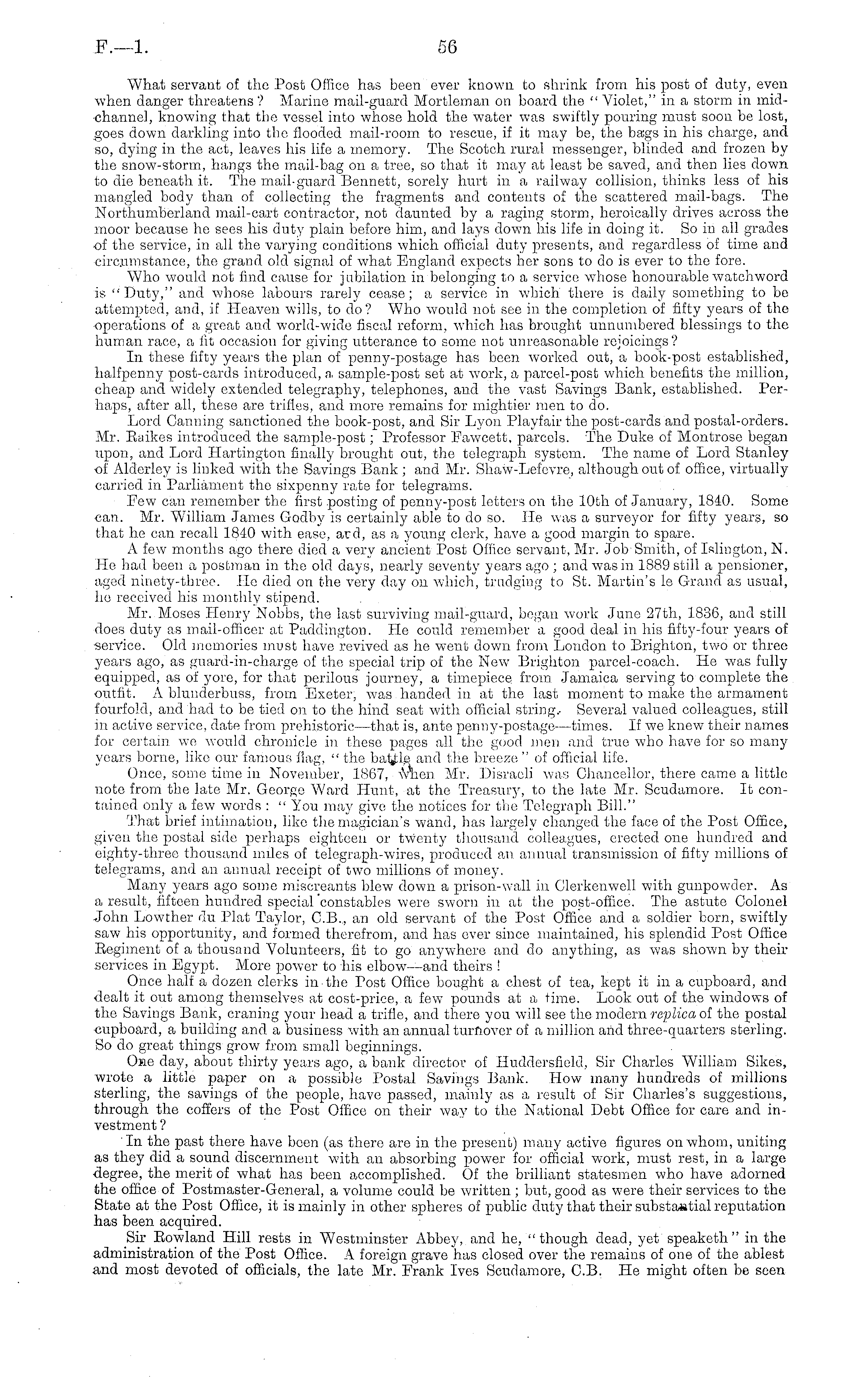 What servant of the Post Office has been ever known to shrink from his post of duty, even when danger threatens ? Marine mail-guard Mortleman on board the " Violet," in a storm in midchannel, knowing that the vessel into whose hold the water was swiftly pouring must soon be lost, goes down darkling into the flooded mail-room to rescue, if it may be, the bags in his charge, and so, dying in the act, leaves his life a memory. The Scotch, rural messenger, blinded and frozen by the snow-storm, hangs the mail-bag on a tree, so that it may at least be saved, and then lies down to die beneath it. The mail-guard Bennett, sorely hurt in a railway collision, thinks less of his mangled body than of collecting the fragments and contents of the scattered mail-bags. The Northumberland mail-cart contractor, not daunted by a raging storm, heroically drives across the moor because he sees his duty plain before him, and lays down his life in doing it. So in all grades •of the service, in all the varying conditions which official duty presents, and regardless of time and circumstance, the grand old signal of what England expects her sons to do is ever to the fore. Who would not find cause for jubilation in belonging to a service whose honourable watchword is "Duty," and whose labours rarely cease; a service in which there is daily something to be attempted, and, if Heaven wills, to do? Who would not see in the completion of fifty years of the operations of a great and world-wide fiscal reform, which has brought unnumbered blessings to the human race, a fit occasion for giving utterance to some not unreasonable rejoicings? In these fifty years the plan of penny-postage has been worked out, a book-post established, halfpenny post-cards introduced, a. sample-post set at work, a parcel-post which benefits the million, cheap and widely extended telegraphy, telephones, and the vast Savings Bank, established. Perhaps, after all, these are trifles, and more remains for mightier men to do. Lord Canning sanctioned the book-post, and Sir Lyon Playfair the post-cards and postal-orders. Mr. Eaikes introduced the sample-post; Professor Fawcett, parcels. The Duke of Montroso began upon, and Lord Hartington finally brought out, the telegraph system. The name of Lord Stanley •of Alderley is linked with the Savings Bank ; and Mr. Shaw-Lefevre, although out of office, virtually carried in Parliament the sixpenny rate for telegrams. Few can remember the first posting of penny-post letters on the 10th of January, 1340. Some can. Mr. William James Godby is certainly able to do so. He was a surveyor for fifty years, so that he can recall 1840 with ease, ard, as a young clerk, have a good margin to spare. A few months ago there died a very ancient Post Office servant, Mr. Job Smith, of Islington, N. He had been a postman in the old days, nearly seventy years ago ; and was in 1889 still a pensioner, aged ninety-three. He died on the very day on which, trudging- to St. Martin's le Grand as usual, ho received his monthly stipend. Mr. Moses Henry Nobbs, the last surviving mail-guard, began work June 27th, 1836, and still does duty as mail-officer at Paddington. He could remember a good deal in his fifty-four years of service. Old memories must have revived as he went down from London to Brighton, two or three years ago, as guard-in-charge of the special trip of the New Brighton parcel-coach. Ho was fully equipped, as of yore, for that perilous journey, a timepiece from Jamaica serving to complete the outfit. A blunderbuss, from Exeter, was handed in at the last moment to make the armament fourfold, and had to be tied on to the hind seat with official string.- Several valued colleagues, still in active service, date from prehistoric—that is, ante penny-postage —times. If we knew their names for certain wo would chronicle in these pages all the good men and true who have for so many years borne, like our famous flag, " the battle and the breeze " of official life. Once, some time in November, 1867, wnen Mr. Disraeli was Chancellor, there came a little note from the late Mr. George Ward Hunt, at the Treasuiy, to the late Mr. Scudamore. It contained only a few words : " You may give the notices for the Telegraph Bill." That brief intimation, like the magician's wand, has largely changed the face of the Post Office, given the postal side perhaps eighteen or twenty thousand colleagues, erected one hundred and eighty-three thousand miles of telegraph-wires, produced an annual transmission of fifty millions of telegrams, and an annual receipt of two millions of money. Many years ago some miscreants blew down a prison-wall in Clerkcnwell with gunpowder. As a result, fifteen hundred special'constables were sworn in at the post-office. The astute Colonel John Lowther dv Plat Taylor, C.8.., an old servant of the Post Office and a soldier born, swiftly saw his opportunity, and formed therefrom, and has over since maintained, his splendid Post Office Eegiment of a thousand Volunteers, fit to go anywhere and do anything, as was shown by their services in Egypt. M!ore power to his elbow —and theirs i Once half a dozen clerks in the Post Office bought a chest of tea, kept it in a cupboard, and <lealt it out among themselves at cost-price, a few pounds at a time. Look out of the windows of the Savings Bank, craning your head a trifle, and there you will see the modern replica of the postal cupboard, a building and a business with an annual turnover of a million and three-quarters sterling. So do great things grow from small beginnings. One day, about thirty years ago, a bank director of Huddersfield, Sir Charles William Sikes, wrote a little paper on a possible Postal Savings Bank. How many hundreds of millions sterling, the savings of the people, have passed, mainly as a result of Sir Charles's suggestions, through the coffers of the Post Office on their way to the National Debt Office for care and investment ? In the past there have boon (