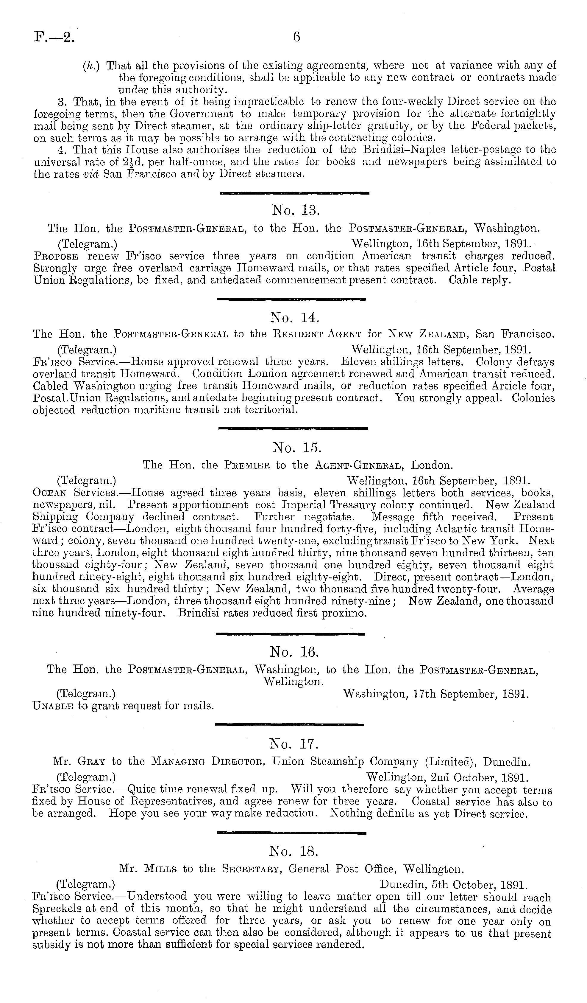 No. 15. The Hon. the Premier to the Agent-General, London. (Telegram.) Wellington, 16th September, 1891. Ocean Services.—House agreed three years basis, eleven shillings letters both services, books, newspapers, nil. Present apportionment cost Imperial Treasury colony continued. New Zealand Shipping Company declined contract. Further negotiate. Message fifth received. Present Pr'isco contract —London, eight thousand four hundred forty-five, including Atlantic transit Homeward ; colony, seven thousand one hundred twenty-one, excluding transit Frisco to New York. Next three years, London, eight thousand eight hundred thirty, nine thousand seven hundred thirteen, ten thousand eighty-four; New Zealand, seven thousand one hundred eighty, seven thousand eight hundred ninety-eight, eight thousand six hundred eighty-eight. Direct, present contract —London, six thousand six hundred thirty ; New Zealand, two thousand five hundred twenty-four. Average next three years—London, three thousand eight hundred ninety-nine; New Zealand, one thousand nine hundred ninety-four. Brindisi rates reduced first proximo.
