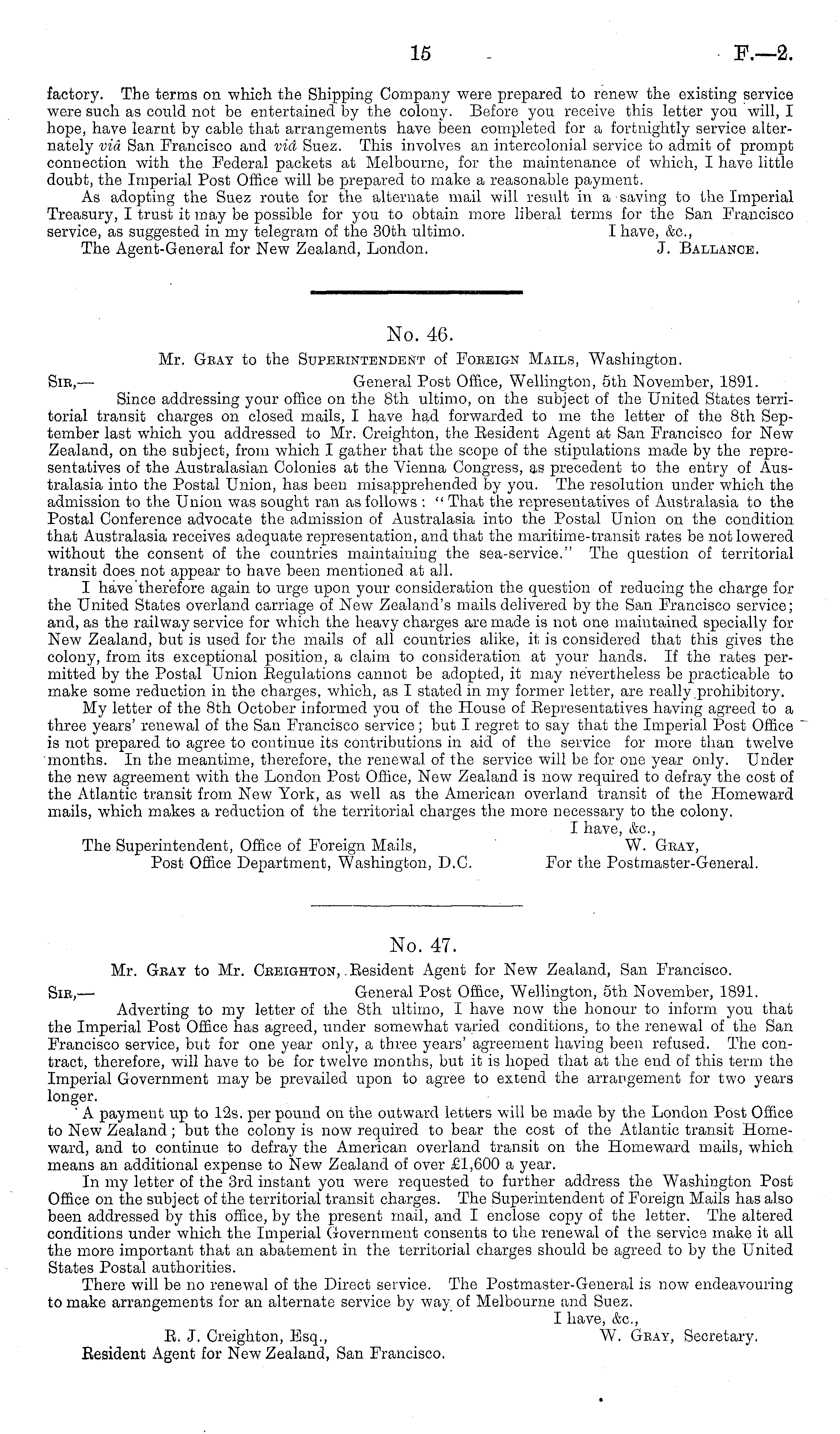No. 47. Mr. Gray to Mr. Creighton, . Resident Agent for New Zealand, San Francisco. Sic, — General Post Office, Wellington, oth November, 1891. Adverting to my letter of the Bth ultimo, I have now the honour to inform you that the Imperial Post Office has agreed, under somewhat varied conditions, to the renewal of the San Francisco service, but for one year only, a three years' agreement having been refused. The contract, therefore, will have to be for twelve months, but it is hoped that at the end of this term the Imperial Government may be prevailed upon to agree to extend the arrangement for two years longer. ' A payment up to 12s. per pound on the outward letters will be made by the London Post Office to New Zealand; but the colony is now required to bear the cost of the Atlantic transit Homeward, and to continue to defray the American overland transit on the Homeward mails, which means an additional expense to New Zealand of over £1,600 a year. In my letter of the 3rd instant you were requested to further address the Washington Post Office on the subject of the territorial transit charges. The Superintendent of Foreign Mails has also been addressed by this office, by the present mail, and I enclose copy of the letter. The altered conditions under which the Imperial Government consents to the renewal of the service make it all the more important that an abatement in the territorial charges should be agreed to by the United States Postal authorities. There will be no renewal of the Direct service. The Postmaster-General is now endeavouring to make arrangements for an alternate service by way of Melbourne and Suez. I have, &c, E. J. Creighton, Esq., W. Geay, Secretary. Eesident Agent for New Zealand, San Francisco.