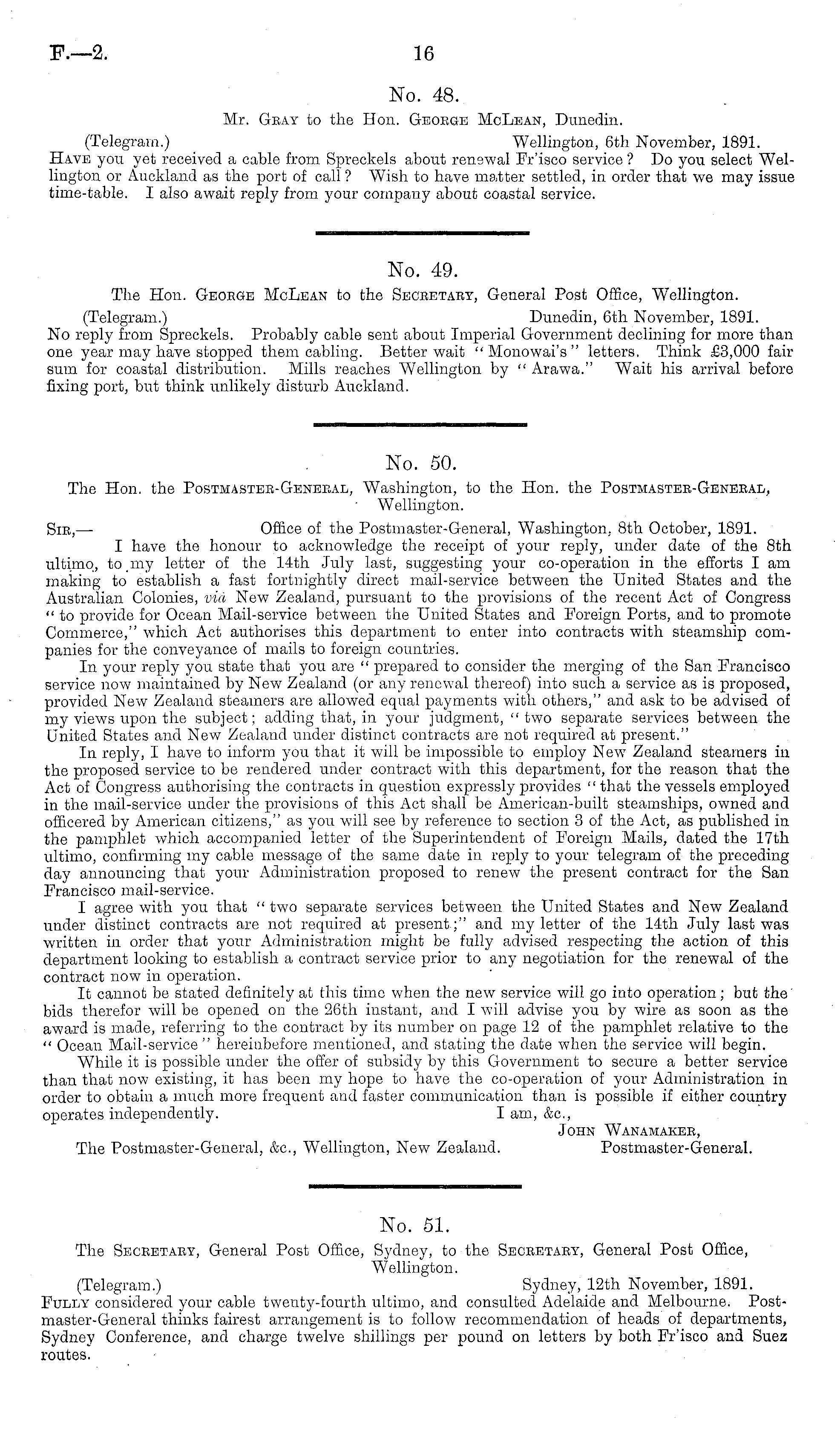 No. 50. The Hon. the Postmastee-Gbneeal, Washington, to the Hon. the Postmaster-General, Wellington. Sir, — Office of the Postmaster-General, Washington. Bth October, 1891. I have the honour to acknowledge the receipt of your reply, under date of the Bth ultimo, to my letter of the 14th July last, suggesting your co-operation in the efforts I am making to establish a fast fortnightly direct mail-service between the United States and the Australian Colonies, via New Zealand, pursuant to the provisions of the recent Act of Congress " to provide for Ocean Mail-service between the United States and Foreign Ports, and to promote Commerce," which Act authorises this department to enter into contracts with steamship companies for the conveyance of mails to foreign countries. In your reply you state that you are " prepared to consider the merging of the San Francisco service now maintained by New Zealand (or any renewal thereof) into such a service as is proposed, provided New Zealand steamers are allowed equal payments with others," and ask to be advised of my views upon the subject; adding that, in your judgment, "two separate services between the United States and New Zealand under distinct contracts are not required at present." In reply, I have to inform you that it will be impossible to employ New Zealand steamers in the proposed service to be rendered under contract with this department, for the reason that the Act of Congress authorising the contracts in question expressly provides " that the vessels employed in the mail-service under the provisions of this Act shall be American-built steamships, owned and officered by American citizens," as you will see by reference to section 3 of the Act, as published in the pamphlet which accompanied letter of the Superintendent of Foreign Mails, dated the 17th ultimo, confirming my cable message of the same date in reply to your telegram of the preceding day announcing that your Administration proposed to renew the present contract for the San Francisco mail-service. I agree with you that " two separate services between the United States and New Zealand under distinct contracts are not required at present;" and my letter of the 14th July last was written in order that your Administration might be fully advised respecting the action of this department looking to establish a contract service prior to any negotiation for the renewal of the contract now in operation. It cannot be stated definitely at this time when the new service will go into operation; but the' bids therefor will be opened on the 26th instant, and I will advise you by wire as soon as the award is made, referring to the contract by its number on page 12 of the pamphlet relative to the " Ocean Mail-service " hereinbefore mentioned, and stating the date when the service will begin. While it is possible under the offer of subsidy by this Government to secure a better service than that now existing, it has been my hope to have the co-operation of your Administration in order to obtain a much more frequent and faster communication than is possible if either country operates independently. I am, &c, John Wanamakee, The Postmaster-General, &c, Wellington, New Zealand. Postmaster-General.