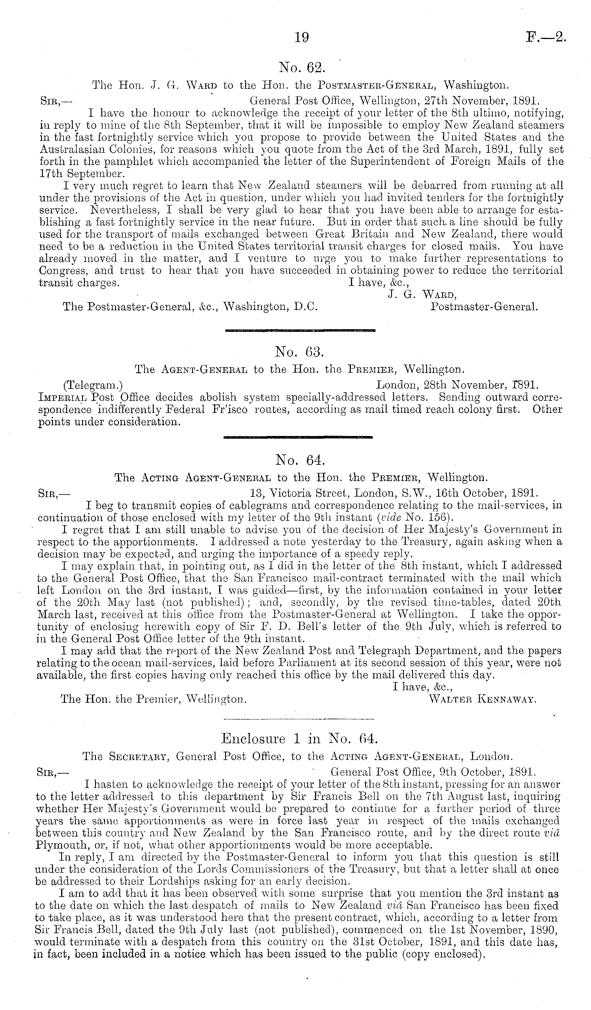 No. 62. The Hon. J. G. Ward to the Hon. the Postmaster-General, Washington. Blß,— General Post Office, Wellington, 27th November, 1891. I have the honour to acknowledge the receipt of your letter of the Bth ultimo, notifying, in reply to mine of the Bth September, that it will bo impossible to employ New Zealand steamers in the fast fortnightly service which you propose to provide between the United States and the Australasian Colonies, for reasons which you quote from the Act of the 3rd March, 1891, fully set forth in the pamphlet which accompanied the letter of the Superintendent of Foreign Mails of the 17th September. I very much regret to learn that New Zealand steamers will be debarred from running at all under the provisions of the Act in question, under which you had invited tenders for the fortnightly service. Nevertheless, I shall be very glad to hear that you have been able to arrange for establishing a fast fortnightly service in the near future. But in order that such, a line should be fully used for the transport of mails exchanged between Great Britain and New Zealand, there would need to be a reduction in the United States territorial transit charges for closed mails. You have already moved in the matter, and I venture to urge you to make further representations to Congress, and trust to hear that you have succeeded in obtaining power to reduce the territorial transit charges. I have, &c, J. G. Ward, The Postmaster-General, &c, Washington, D.C. Postmaster-General.