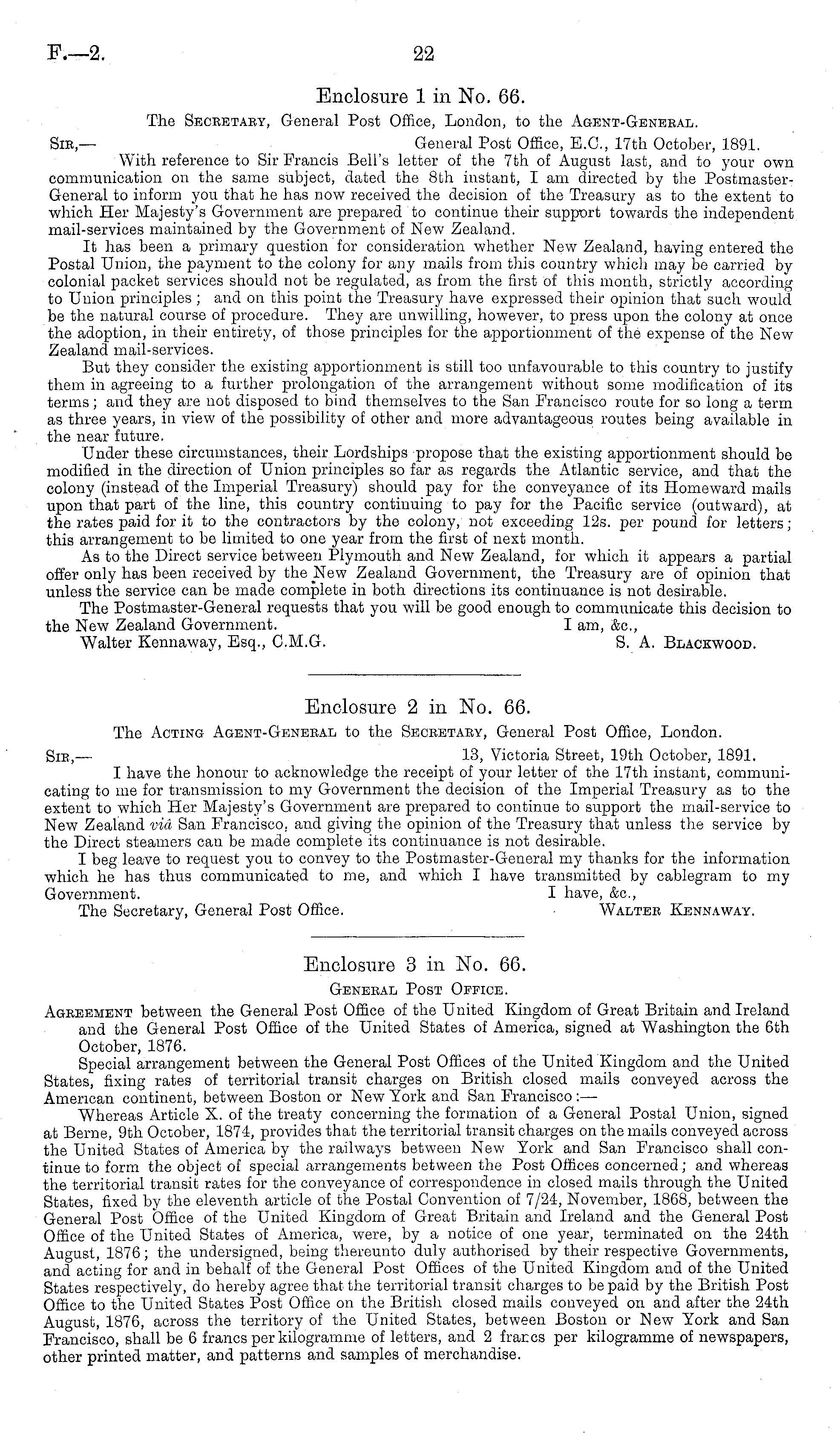 Enclosure 1 in No. 66. The Secretary, General Post Office, London, to the Agent-General. Sib,— General Post Office, E.G., 17th October, 1891. With reference to Sir Francis Bell's letter of the 7th of August last, and to your own communication on the same subject, dated the Bth instant, I am directed by the PostmasterGeneral to inform you that he has now received the decision of the Treasury as to the extent to which Her Majesty's Government are prepared to continue their support towards the independent mail-services maintained by the Government of New Zealand. It has been a primary question for consideration whether New Zealand, having entered the Postal Union, the payment to the colony for any mails from this country which may be carried by colonial packet services should not be regulated, as from the first of this month, strictly according to Union principles ; and on this point the Treasury have expressed their opinion that such would be the natural course of procedure. They are unwilling, however, to press upon the colony at once the adoption, in their entirety, of those principles for the apportionment of the expense of the New Zealand mail-services. But they consider the existing apportionment is still too unfavourable to this country to justify them in agreeing to a further prolongation of the arrangement without some modification of its terms; and they are not disposed to bind themselves to the San Francisco route for so long a term as three years, in view of the possibility of other and more advantageous routes being available in the near future. Under these circumstances, their Lordships propose that the existing apportionment should be modified in the direction of Union principles so far as regards the Atlantic service, and that the colony (instead of the Imperial Treasury) should pay for the conveyance of its Homeward mails upon that part of the line, this country continuing to pay for the Pacific service (outward), at the rates paid for it to the contractors by the colony, not exceeding 12s. per pound for letters; this arrangement to be limited to one year from the first of next month. As to the Direct service between Plymouth and New Zealand, for which it appears a partial offer only has been received by the New Zealand Government, the Treasury are of opinion that unless the service can be made complete in both directions its continuance is not desirable. The Postmaster-General requests that you will be good enough to communicate this decision to the New Zealand Government. I am, &c, Walter Kennaway, Esq., C.M.G. S. A. Blackwood.