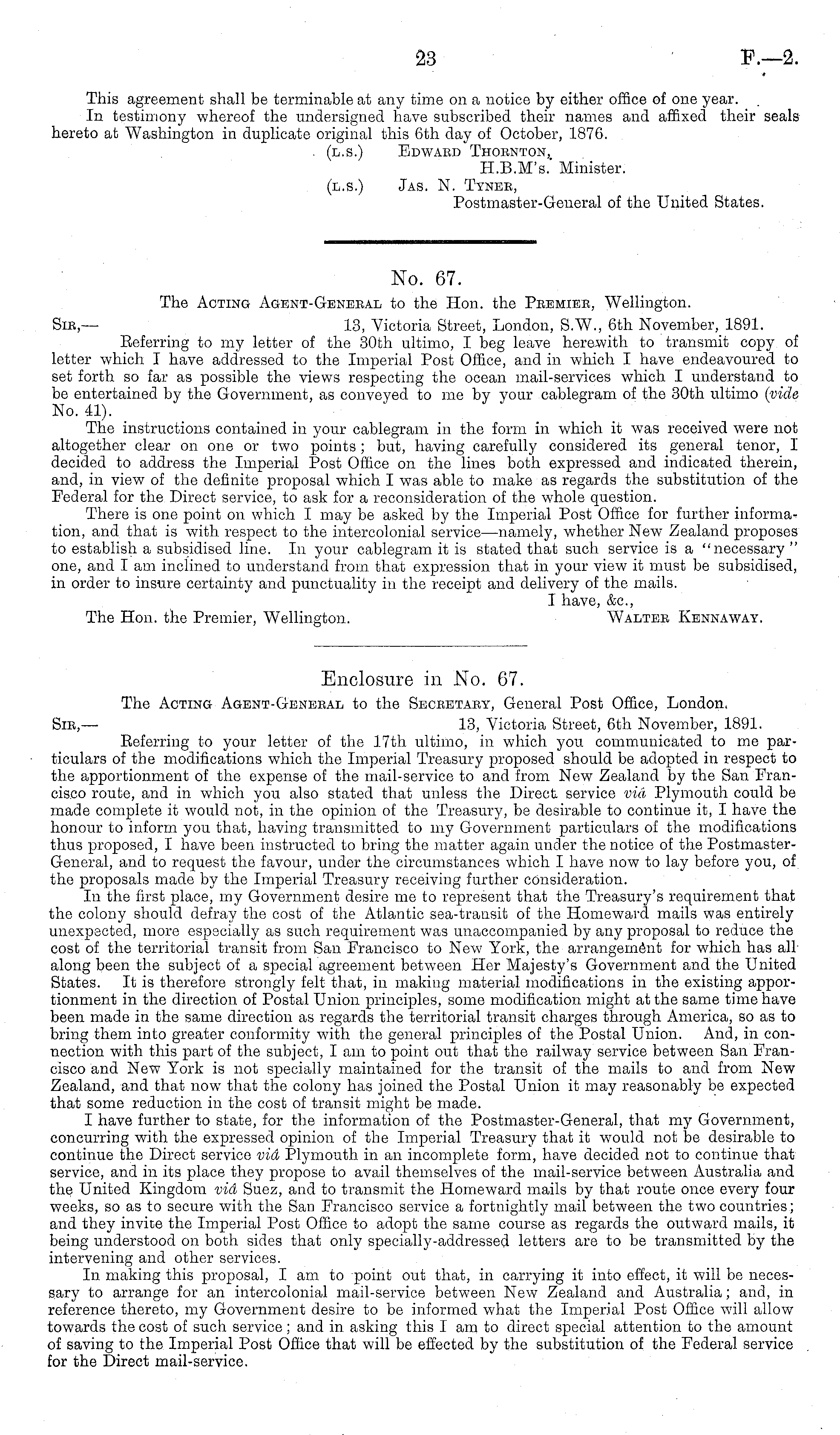 Enclosure in No. 67. The Acting Agent-Geneeal to the Seceetaey, General Post Office, London, Sic, — 13, Victoria Street, 6th November, 1891. Eeferring to your letter of the 17th ultimo, in which you communicated to me particulars of the modifications which the Imperial Treasury proposed should be adopted in respect to the apportionment of the expense of the mail-service to and from New Zealand by the San Francisco route, and in which you also stated that unless the Direct service via Plymouth could be made complete it would not, in the opinion of the Treasury, be desirable to continue it, I have the honour to inform you that, having transmitted to my Government particulars of the modifications thus proposed, I have been instructed to bring the matter again under the notice of the PostmasterGeneral, and to request the favour, under the circumstances which I have now to lay before you, of the proposals made by the Imperial Treasury receiving further consideration. In the first place, my Government desire me to represent that the Treasury's requirement that the colony should defray the cost of the Atlantic sea-transit of the Homeward mails was entirely unexpected, more especially as such requirement was unaccompanied by any proposal to reduce the cost of the territorial transit from San Francisco to New York, the arrangement for which has ailalong been the subject of a special agreement between Her Majesty's Government and the United States. It is therefore strongly felt that, in making material modifications in the existing apportionment in the direction of Postal Union principles, some modification might at the same time have been made in the same direction as regards the territorial transit charges through America, so as to bring them into greater conformity with the general principles of the Postal Union. And, in connection with this part of the subject, I am to point out that the railway service between San Francisco and New York is not specially maintained for the transit of the mails to and from New Zealand, and that now that the colony has joined the Postal Union it may reasonably be expected that some reduction in the cost of transit might be made. I have further to state, for the information of the Postmaster-General, that my Government, concurring with the expressed opinion of the Imperial Treasury that it would not be desirable to continue the Direct service via Plymouth in an incomplete form, have decided not to continue that service, and in its place they propose to avail themselves of the mail-service between Australia and the United Kingdom via Suez, and to transmit the Homeward mails by that route once every four weeks, so as to secure with the San Francisco service a fortnightly mail between the two countries; and they invite the Imperial Post Office to adopt the same course as regards the outward mails, it being understood on both sides that only specially-addressed letters are to be transmitted by the intervening and other services. In making this proposal, I am to point out that, in carrying it into effect, it will be necessary to arrange for an intercolonial mail-service between New Zealand and Australia; and, in reference thereto, my Government desire to be informed what the Imperial Post Office will allow towards the cost of such service; and in asking this I am to direct special attention to the amount of saving to the Imperial Post Office that will be effected by the substitution of the Federal service for the Direct mail-service.