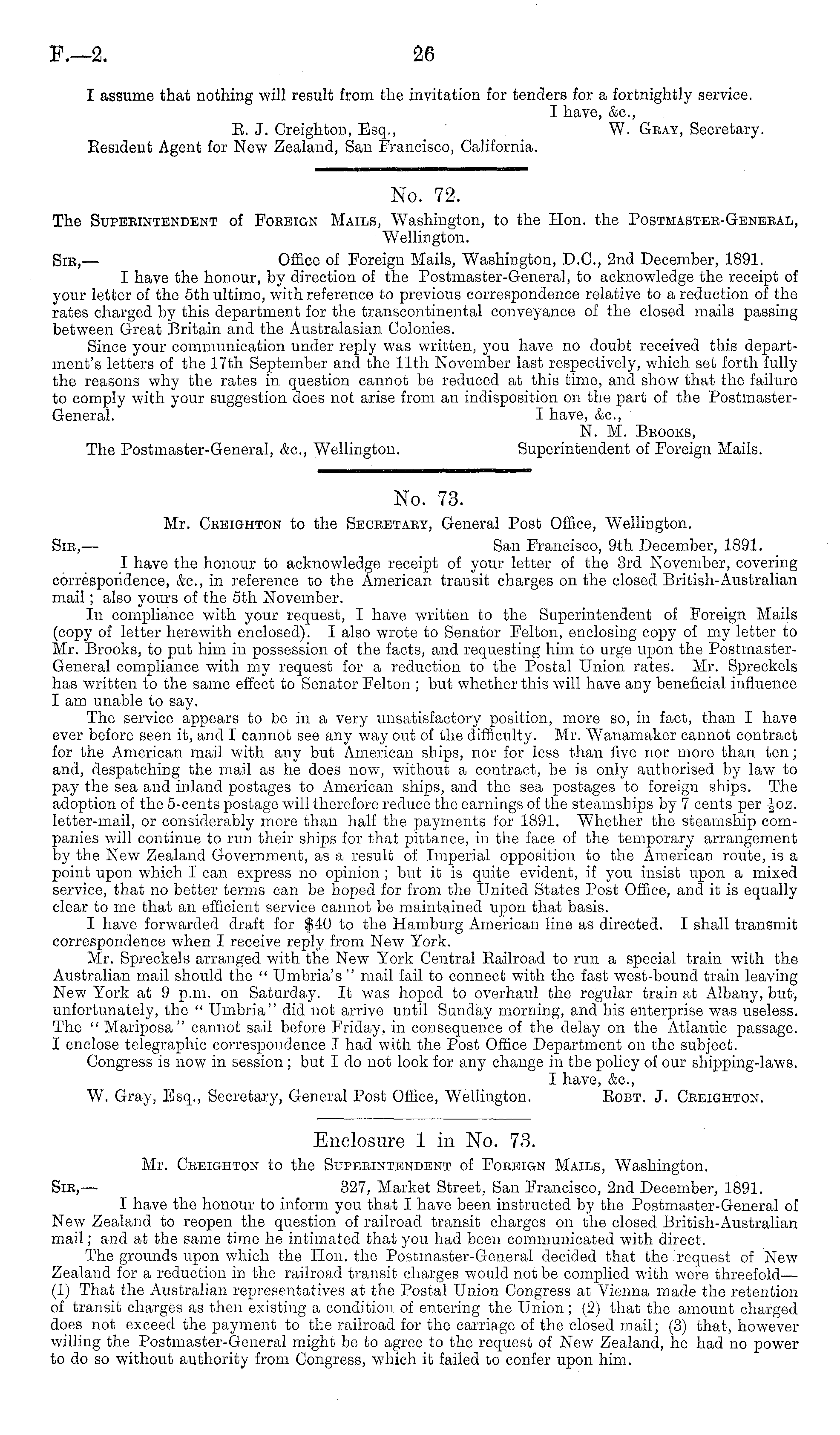 Enclosure 1 in No. 73. Mr. Ckeighton to the Superintendent of Foreign Mails, Washington. Sir, — 327, Market Street, San Francisco, 2nd December, 1891. I have the honour to inform you that I have been instructed by the Postmaster-General of New Zealand to reopen the question of railroad transit charges on the closed British-Australian mail; and at the same time he intimated that you had been communicated with direct. The grounds upon which the Hon. the Postmaster-General decided that the request of New Zealand for a reduction in the railroad transit charges would not be complied with were threefold— (1) That the Australian representatives at the Postal Union Congress at Vienna made the retention of transit charges as then existing a condition of entering the Union; (2) that the amount charged does not exceed the payment to the railroad for the carriage of the closed mail; (3) that, however willing the Postmaster-General might be to agree to the request of New Zealand, he had no power to do so without authority from Congress, which it failed to confer upon him.