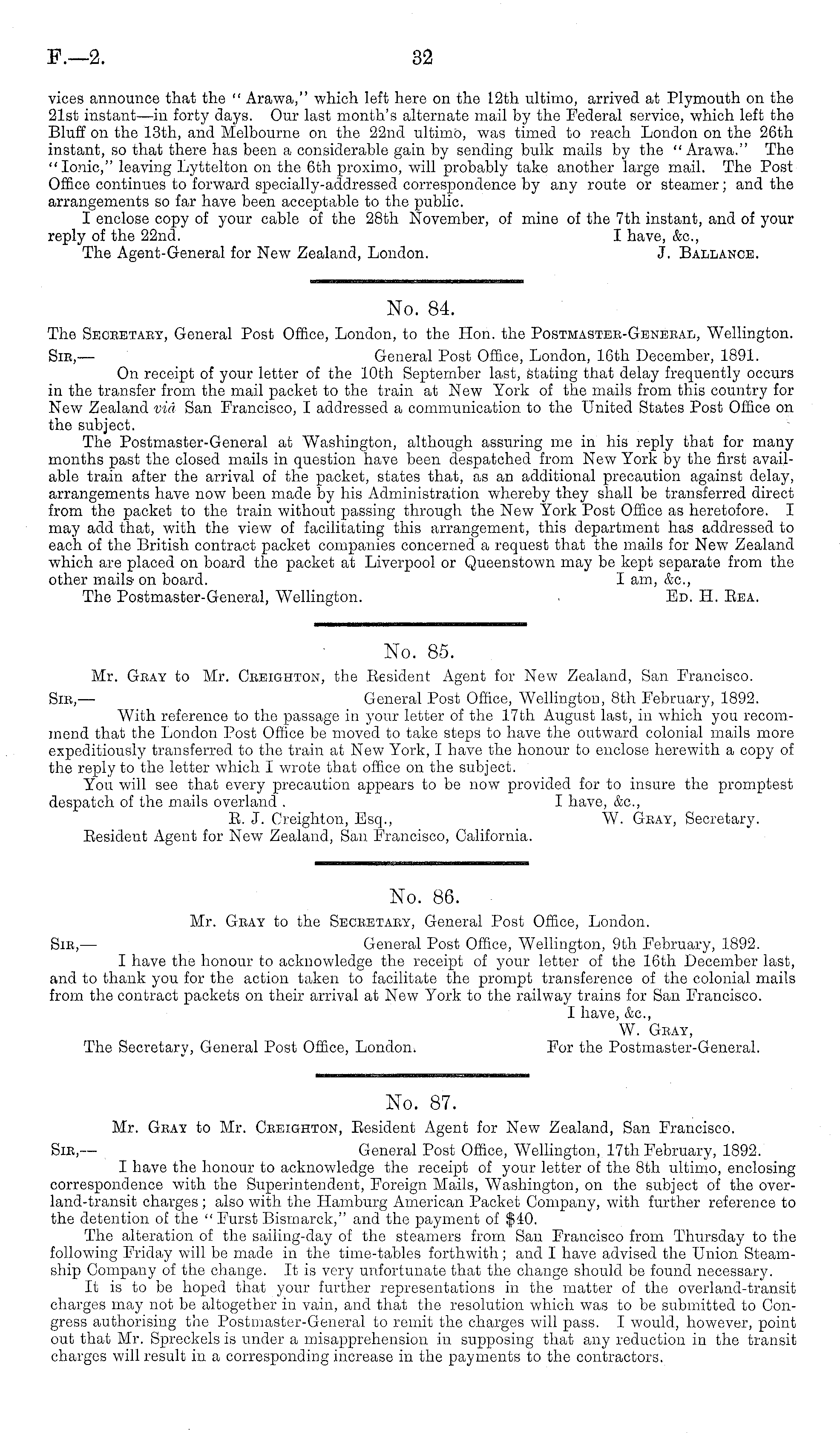 No. 85. Mr. Gbay to Mr. Ceeighton, the Eesident Agent for New Zealand, San Francisco. Sib,— General Post Office, Wellington, Bth February, 1892. With reference to the passage in your letter of the 17th August last, in which you recommend that the London Post Office be moved to take steps to have the outward colonial mails more expeditiously transferred to the train at New York, I have the honour to enclose herewith a copy of the reply to the letter which I wrote that office on the subject. You will see that every precaution appears to be now provided for to insure the promptest despatch of the mails overland . I have, &c, E. J. Creighton, Esq., W. Gbay, Secretary. Eesident Agent for New Zealand, San Francisco, California.