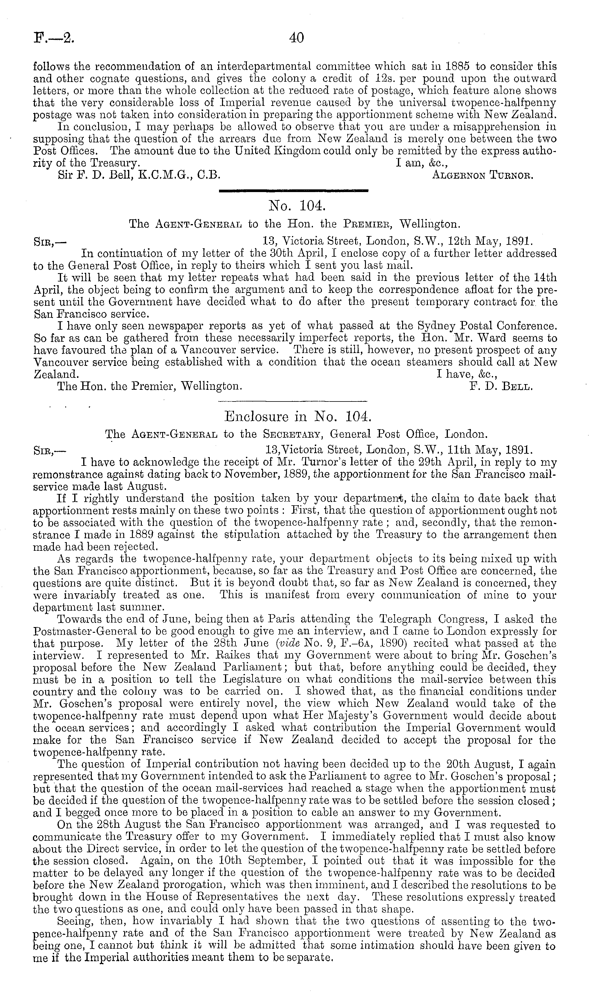 Enclosure in No. 104. The Agent-Geneeal to the Seceetaey, General Post Office, London. Sib,— 13, Victoria Street, London, S.W., 11th May, 1891. I have to acknowledge the receipt of Mr. Tumor's letter of the 29th April, in reply to my remonstrance against dating back to November, 1889, the apportionment for the San Francisco mailservice made last August. If I rightly understand the position taken by your department, the claim to date back that apportionment rests mainly on these two points : First, that the question of apportionment ought not to be associated with the question of the twopence-halfpenny rate ; and, secondly, that the remonstrance I made in 1889 against the stipulation attached by the Treasury to the arrangement then made had been rejected. As regards the twopence-halfpenny rate, your department objects to its being mixed up with the San Francisco apportionment, because, so far as the Treasury and Post Office are concerned, the questions are quite distinct. But it is beyond doubt that, so far as New Zealand is concerned, they were invariably treated as one. This is manifest from every communication of mine to your department last summer. Towards the end of June, being then at Paris attending the Telegraph Congress, I asked the Postmaster-General to be good enough to give me an interview, and I came to London expressly for that purpose. My letter of the 28th June (vide No. 9, F.-6a, 1890) recited what passed at the interview. I represented to Mr. Eaikes that my Government were about to bring Mr. Goschen's proposal before the New Zealand Parliament; but that, before anything could be decided, they must be in a position to tell the Legislature on what conditions the mail-service between this country and the colony was to be carried on. I showed that, as the financial conditions under Mr. Goschen's proposal were entirely novel, the view which New Zealand would take of the twopence-halfpenny rate must depend upon what Her Majesty's Government would decide about the ocean services; and accordingly I asked what contribution the Imperial Government would make for the San Francisco service if New Zealand decided to accept the proposal for the twopence-halfpenny rate. The question of Imperial contribution not having been decided up to the 20th August, I again represented that my Government intended to ask the Parliament to agree to Mr. Goschen's proposal; but that the question of the ocean mail-services had reached a stage when the apportionment must be decided if the question of the twopence-halfpenny rate was to be settled before the session closed; and I begged once more to be placed in a position to cable an answer to my Government. On the 28th August the San Francisco apportionment was arranged, and I was requested to communicate the Treasury offer to my Government. I immediately replied that I must also know about the Direct service, in order to let the question of the twopence-halfpenny rate be settled before the session closed. Again, on the 10th September, I pointed out that it was impossible for the matter to be delayed any longer if the question of the twopence-halfpenny rate was to be decided before the New Zealand prorogation, which was then imminent, and I described the resolutions to be brought down in the House of Representatives the next day. These resolutions expressly treated the two questions as one, and could only have been passed in that shape. Seeing, then, how invariably I had shown that the two questions of assenting to the two-pence-halfpenny rate and of the San Francisco apportionment were treated by New Zealand as being one, I cannot but think it will be admitted that some intimation should have been given to me if the Imperial authorities meant them to be separate.