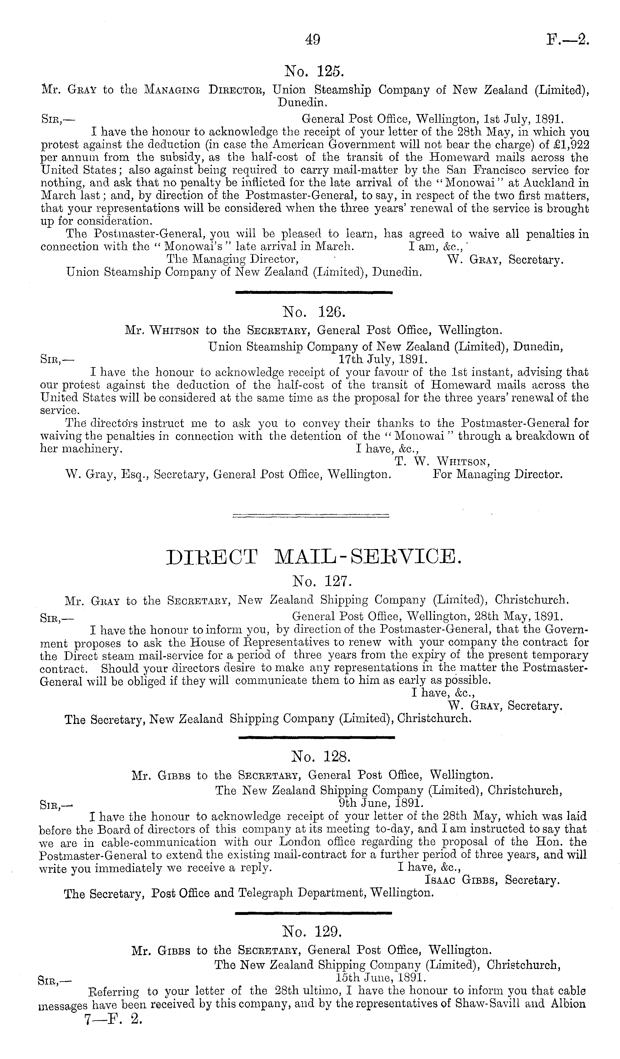 DIRECT MAIL-SEBVICE. No. 127. Mr. Gbay to the Secbetaby, New Zealand Shipping Company (Limited), Christchurch. Sm,— General Post Office, Wellington, 28th May, 1891. I have the honour to inform you, by direction of the Postmaster-General, that the Government proposes to ask the House of representatives to renew with your company the contract for the Direct steam mail-service for a period of three years from the expiry of the present temporary contract. Should your directors desire to make any representations in the matter the PostmasterGeneral will be obliged if they will communicate them to him as early as possible. I have, &c, W. Gbay, Secretary. The Secretary, New Zealand Shipping Company (Limited), Christchurch.