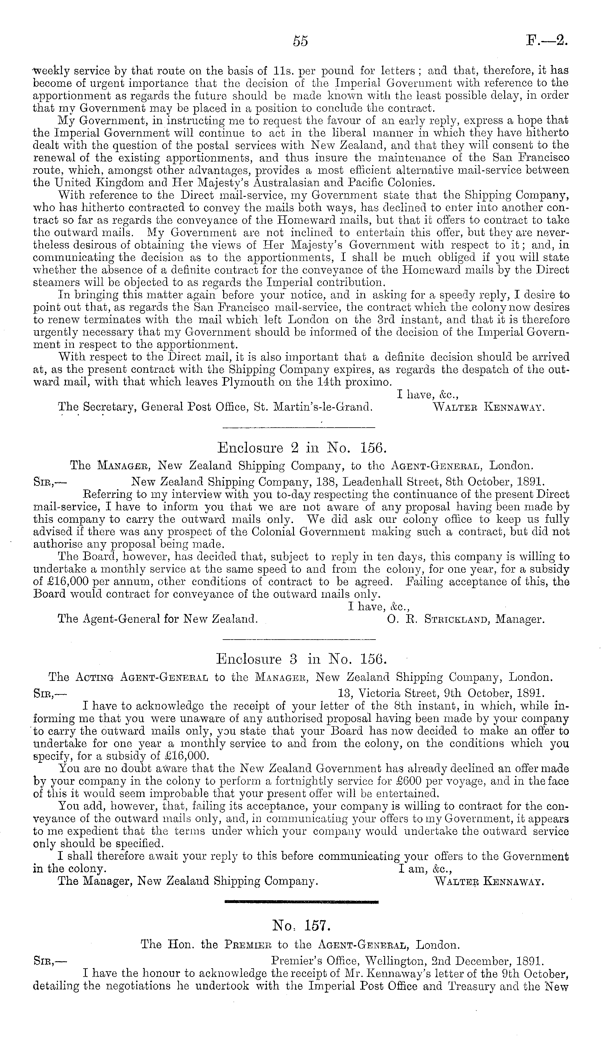 Enclosure 2 in No. 156. The Manages, New Zealand Shipping Company, to the Agent-General, London. Sir,— New Zealand Shipping Company, 138, Leadenhall Street, Bth October, 1891. Referring to my interview with you to-day respecting the continuance of the present Direct mail-service, I have to inform you that we are not aware of any proposal having been made by this company to carry the outward mails only. We did ask our colony office to keep us fully advised if there was any prospect of the Colonial Government making such a contract, but did not authorise any proposal being made. The Board, however, has decided that, subject to reply in ten days, this company is willing to undertake a monthly service at the same speed to and from the colony, for one year, for a subsidy of £16,000 per annum, other conditions of contract to be agreed. .Failing acceptance of this, the Board would contract for conveyance of the outward mails only. I have, Ac, The Agent-General for New Zealand. O. B. Stbickland, Manager.