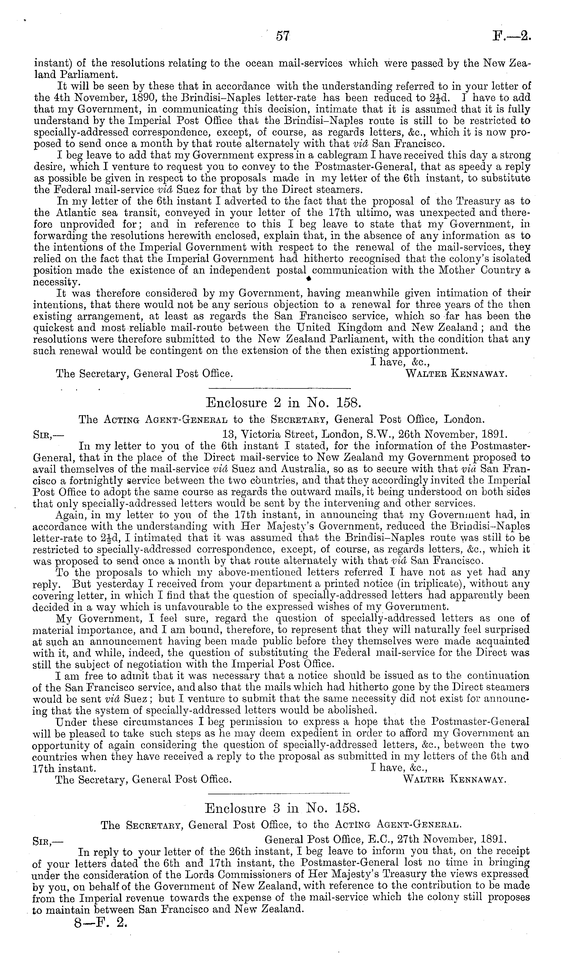 instant) of the resolutions relating to the ocean mail-services which were passed by the New Zealand Parliament. It will be seen by these that in accordance with the understanding referred to in your letter of the 4th November, 1890, the Brindisi-Naples letter-rate has been reduced to 2-|d. I have to add that my Government, in communicating this decision, intimate that it is assumed that it is fully understand by the Imperial Post Office that the Brindisi-Naples route is still to be restricted to specially-addressed correspondence, except, of course, as regards letters, &c, which it is now proposed to send once a month by that route alternately with that via San Francisco. I beg leave to add that my Government express in a cablegram I have received this day a strong desire, which I venture to request you to convey to the Postmaster-General, that as speedy a reply as possible be given in respect to the proposals made in my letter of the 6th instant, to substitute the Federal mail-service via Suez for that by the Direct steamers. In my letter of the 6th instant I adverted to the fact that the proposal of the Treasury as to the Atlantic sea transit, conveyed in your letter of the 17th ultimo, was unexpected and therefore unprovided for; and in reference to this I beg leave to state that my Government, in forwarding the resolutions herewith enclosed, explain that, in the absence of any information as to the intentions of the Imperial Government with respect to the renewal of the mail-services, they relied on the fact that the Imperial Government had hitherto recognised that the colony's isolated position made the existence of an independent postal communication with the Mother Country a necessity. It was therefore considered by my Government, having meanwhile given intimation of their intentions, that there would not be any serious objection to a renewal for three years of the then existing arrangement, at least as regards the San Francisco service, which so far has been the quickest and most reliable mail-route between the United Kingdom and New Zealand; and the resolutions were therefore submitted to the New Zealand Parliament, with the condition that any such renewal would be contingent on the extension of the then existing apportionment. I have, &c, The Secretary, General Post Office. Waltbb Kennaway.