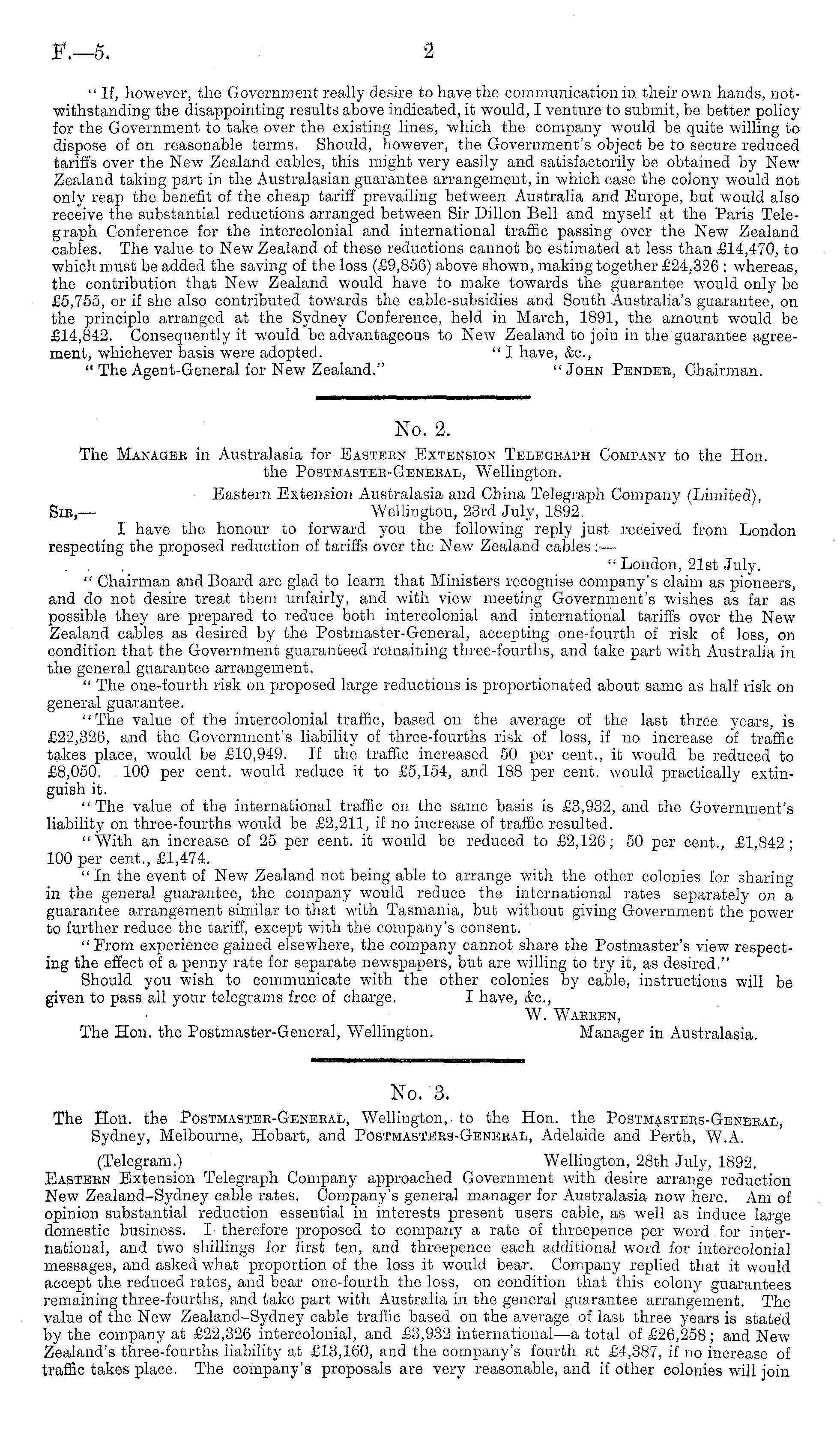 No. 2. The Managee in Australasia for Easteen Extension Telegbaph Company to the Hon. the Postmasteb-Genebal, Wellington. Eastern Extension Australasia and China Telegraph Company (Limited), Sic,— Wellington, 23rd July, 1892, I have the honour to forward you the following reply just received from London respecting the proposed reduction of tariffs over the New Zealand cables: — "London, 21st July. " Chairman and Board are glad to learn that Ministers recognise company's claim as pioneers, and do not desire treat them unfairly, and with view meeting Government's wishes as far as possible they are prepared to reduce both intercolonial and international tariffs over the New Zealand cables as desired by the Postmaster-General, accepting one-fourth of risk of loss, on condition that the Government guaranteed remaining three-fourths, and take part with Australia in the general guarantee arrangement. " The one-fourth risk on proposed large reductions is proportionated about same as half risk on general guarantee. "The value of the intercolonial traffic, based on the average of the last three years, is £22,326, and the Government's liability of three-fourths risk of loss, if no increase of traffic takes place, would be £10,949. If the traffic increased 50 per cent., it would be reduced to £8,050. 100 per cent, would reduce it to £5,154, and 188 per cent, would practically extinguish it. "The value of the international traffic on the same basis is £3,932, and the Government's liability on three-fourths would be £2,211, if no increase of traffic resulted. " With an increase of 25 per cent, it would be reduced to £2,126; 50 per cent., £1,842 ; 100 per cent., £1,474. "In the event of New Zealand not being able to arrange with the other colonies for sharing in the general guarantee, the company would reduce the international rates separately on a guarantee arrangement similar to that with Tasmania, but without giving Government the power to further reduce the tariff, except with the company's consent. "From experience gained elsewhere, the company cannot share the Postmaster's view respecting the effect of a penny rate for separate newspapers, but are willing to try it, as desired," Should you wish to communicate with the other colonies by cable, instructions will be given to pass all your telegrams free of charge. I have, &c, W. Waeeen, The Hon. the Postmaster-General, Wellington. Manager in Australasia.