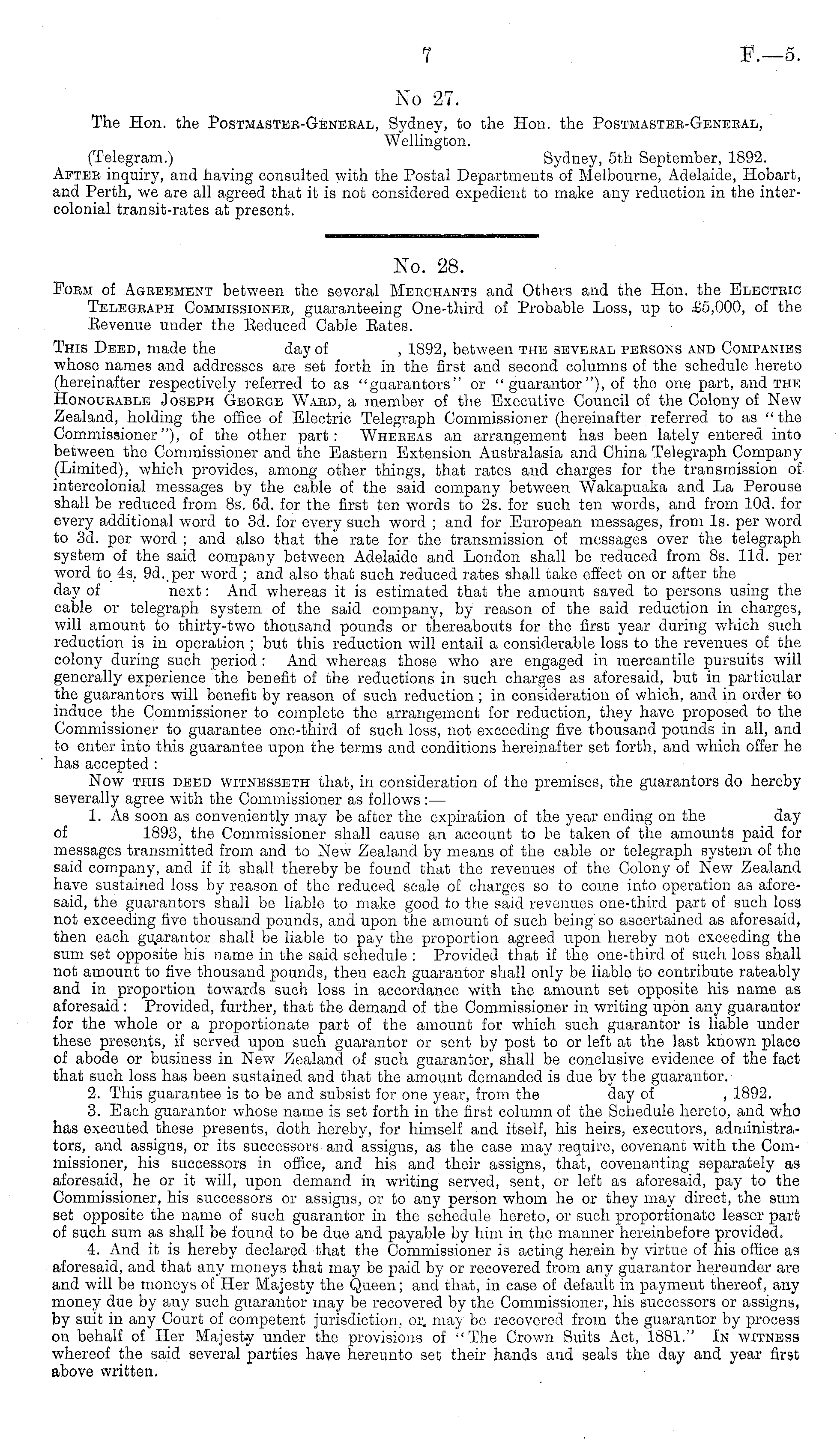 No. 28. Poem of Agreement between the several Merchants and Others and the Hon. the Electric Telegraph Commissioner, guaranteeing One-third of Probable Loss, up to £5,000, of the Eevenue under the Beduced Cable Bates. This Deed, made the day of , 1892, between the several persons and Companies whose names and addresses are set forth in the first and second columns of the schedule hereto (hereinafter respectively referred to as "guarantors" or "guarantor"), of the one part, and the Honourable Joseph George Wabd, a member of the Executive Council of the Colony of New Zealand, holding the office of Electric Telegraph Commissioner (hereinafter referred to as " the Commissioner"), of the other part: Whereas an arrangement has been lately entered into between the Commissioner and the Eastern Extension Australasia and China Telegraph Company (Limited), which provides, among other things, that rates and charges for the transmission of intercolonial messages by the cable of the said company between Wakapuaka and La Perouse shall be reduced from Bs. 6d. for the first ten words to 2s. for such ten words, and from 10d. for every additional word to 3d. for every such word ; and for European messages, from Is. per word to 3d. per word ; and also that the rate for the transmission of messages over the telegraph system of the said company between Adelaide and London shall be reduced from Bs. lid. per word to is. 9d.,per word ; and also that such reduced rates shall take effect on or after the day of next: And whereas it is estimated that the amount saved to persons using the cable or telegraph system of the said company, by reason of the said reduction in charges, will amount to thirty-two thousand pounds or thereabouts for the first year during which such reduction is in operation ; but this reduction will entail a considerable loss to the revenues of the colony during such period.: And whereas those who are engaged in mercantile pursuits will generally experience the benefit of the reductions in such charges as aforesaid, but in particular the guarantors will benefit by reason of such reduction ; in consideration of which, and in order to induce the Commissioner to complete the arrangement for reduction, they have proposed to the Commissioner to guarantee one-third of such loss, not exceeding five thousand pounds in all, and to enter into this guarantee upon the terms and conditions hereinafter set forth, and which offer he has accepted : Now this deed wiTNESSETH that, in consideration of the premises, the guarantors do hereby severally agree with the Commissioner as follows: — 1. As soon as conveniently may be after the expiration of the year ending on the day of 1893, the Commissioner shall cause an account to be taken of the amounts paid for messages transmitted from and to New Zealand by means of the cable or telegraph system of the said company, and if it shall thereby be found that the revenues of the Colony of New Zealand have sustained loss by reason of the reduced scale of charges so to come into operation as aforesaid, the guarantors shall be liable to make good to the said revenues one-third part of such loss not exceeding five thousand pounds, and upon the amount of such being so ascertained as aforesaid, then each guarantor shall be liable to pay the proportion agreed upon hereby not exceeding the sum set opposite his name in the said schedule : Provided that if the one-third of such loss shall not amount to five thousand pounds, then each guarantor shall only be liable to contribute rateably and in proportion towards such loss in accordance with the amount set opposite his name as aforesaid: Provided, further, that the demand of the Commissioner in writing upon any guarantor for the whole or a proportionate part of the amount for which such guarantor is liable under these presents, if served upon such guarantor or sent by post to or left at the last known place of abode or business in New Zealand of such guarantor, shall be conclusive evidence of the fact that such loss has been sustained and that the amount demanded is due by the guarantor. 2. This guarantee is to be and subsist for one year, from the day of , 1892. 3. Each guarantor whose name is set forth in the first column of the Schedule hereto, and who has executed these presents, doth hereby, for himself and itself, his heirs, executors, administrators, and assigns, or its successors and assigns, as the case may require, covenant with the Commissioner, his successors in office, and his and their assigns, that, covenanting separately as aforesaid, he or it will, upon demand in writing served, sent, or left as aforesaid, pay to the Commissioner, his successors or assigns, or to any person whom he or they may direct, the sum set opposite the name of such guarantor in the schedule hereto, or such proportionate lesser part of such sum as shall be found to be due and payable by him in the manner hereinbefore provided. 4. And it is hereby declared that the Commissioner is acting herein by virtue of his office as aforesaid, and that any moneys that may be paid by or recovered from any guarantor hereunder are and will be moneys of Her Majesty the Queen; and that, in case of default in payment thereof, any money due by any such guarantor may be recovered by the Commissioner, his successors or assigns, by suit in any Court of competent jurisdiction, or. may be recovered from the guarantor by process on behalf of Her Majesty under the provisions of "The Crown Suits Act, 1881." In witness whereof the said several parties have hereunto set their hands and seals the day and year first above written.