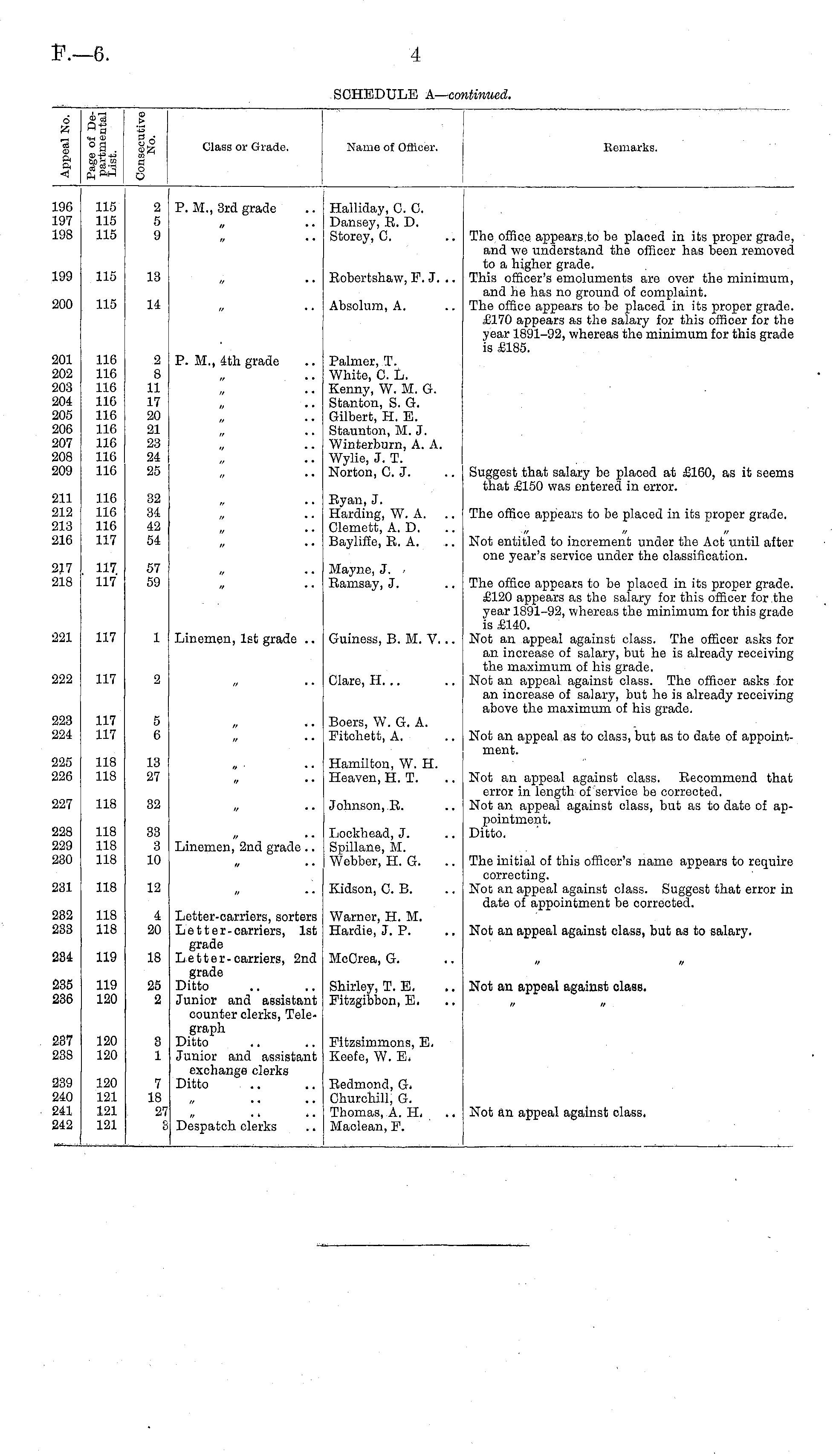 o "A Class or Grade. Name of Officer. Kemarks. .96 -97 .98 115 115 115 2 5 9 P. M., 3rd grade Halliday, 0. C. Dansey, R. D. Storey, G. .99 100 115 115 13 14 Bobertshaw, F. J. Absolum, A. The office appears to be placed in its proper grade, and we understand the officer has been removed to a higher grade. This officer's emoluments are over the minimum, and he has no ground of complaint. The office appeal's to be placed in its proper grade. £170 appears as the salary for this officer for the year 1891-92, whereas the minimum for this grade is £185. !01 !02 !03 104 iO5 !06 !07 !08 109 116 116 116 116 116 116 116 116 116 2 8 11 17 20 21 23 24 25 P. M., 4th grade Palmer, T. White, 0. L. Kenny, W. M. G. Stanton, S. G. Gilbert, H. E. Staunton, M. J. Winterburn, A. A. Wylie, J. T. Norton, C. J. Suggest that salary be placed at £160, as it seems that £150 was entered in error. ill !12 518 !16 116 116 116 117 32 34 42 54 Ryan, J. Harding, W. A. Clemett, A. D. Bayliffe, R. A. The office appears to be placed in its proper grade. Not entitled to increment under the Act until after one year's service under the classification. !17 Hβ 117 117 57 59 Mayne, J. Ramsay, J. The office appears to be placed in its proper grade. £120 appears as the salary for this officer for the year 1891-92, whereas the minimum for this grade is £140. Not an appeal against class. The officer asks for an increase of salary, but he is already receiving the maximum of his grade. Not an appeal against class. The officer asks for an increase of salary, but he is already receiving above the maximum of his grade. 221 117 Linemen, 1st grade .. Guiness, B. M. V... !22 117 Glare, H. .. !23 !24 117 117 5 6 Boers, W. G. A. Fitchett, A. Not an appeal as to class, but as to date of appointment. !25 !26 118 118 13 27 Hamilton, W. H. Heaven, H. T. Not an appeal against class. Recommend that error in length of service be corrected. Not an appeal against class, but as to date of appointment. Ditto. !27 118 32 Johnson, R. !28 !29 !30 118 118 118 33 3 10 Linemen, 2nd grade .. Lockhead, J. Spillane, M. Webber, H. G. !31 118 12 Kidson, C. B. The initial of this officer's name appears to require correcting. Not an appeal against class. Suggest that error in date of appointment be corrected. !82 !33 !84 !35 !36 118 118 119 119 120 4 20 18 25 2 Letter-carriers, sorters Letter-carriers, 1st grade Letter-carriers, 2nd grade Ditto Junior and assistant counter clerks, Telegraph Ditto Junior and assistant exchange clerks Ditto Warner, H. M. Hardie, J. P. McCrea, G. Shirley, T. E. Fitzgibbon, E. Not an appeal against class, but as to salary. Not an appeal against class. !87 !38 120 120 3 1 Fitzsiromons, E. Keefe, W. E. !39 !40 141 142 120 121 121 121 7 18 27 o Redmond, G. Churchill, G. Thomas, A. H. Maclean, F. Not an appeal against class. Despatch clerks