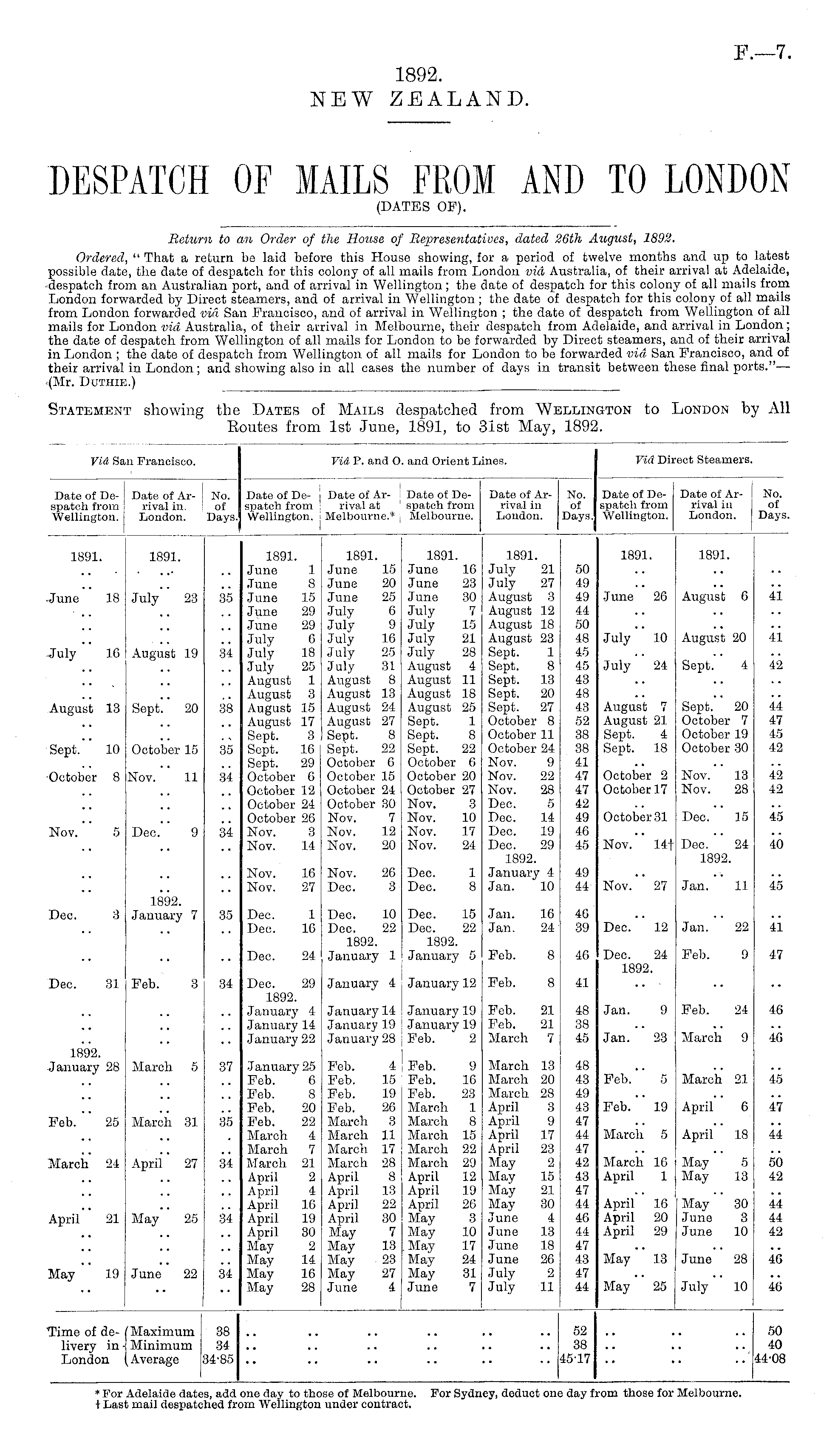 Return to an Order of the B.ouse of Representatives, dated 26th August, 1892. Ordered, " That a return be laid before this House showing, for a period of twelve months and up to latest possible date, the date of despatch for this colony of all mails from London via Australia, of their arrival at Adelaide, despatch from an Australian port, and of arrival in Wellington; the date of despatch for this colony of all mails from London forwarded by Direct steamers, and of arrival in Wellington; the date of despatch for this colony of all mails from London forwarded via San Francisco, and of arrival in Wellington ; the date of despatch from Wellington of all mails for London via Australia, of their arrival in Melbourne, their despatch from Adelaide, and arrival in London; the date of despatch from Wellington of all mails for London to be forwarded by Direct steamers, and of their arrival in London ; the date of despatch from Wellington of all mails for London to be forwarded via San Francisco, and of their arrival in London; and showing also in all cases the number of days in transit between these final ports." — (Mr. Duthie.)
