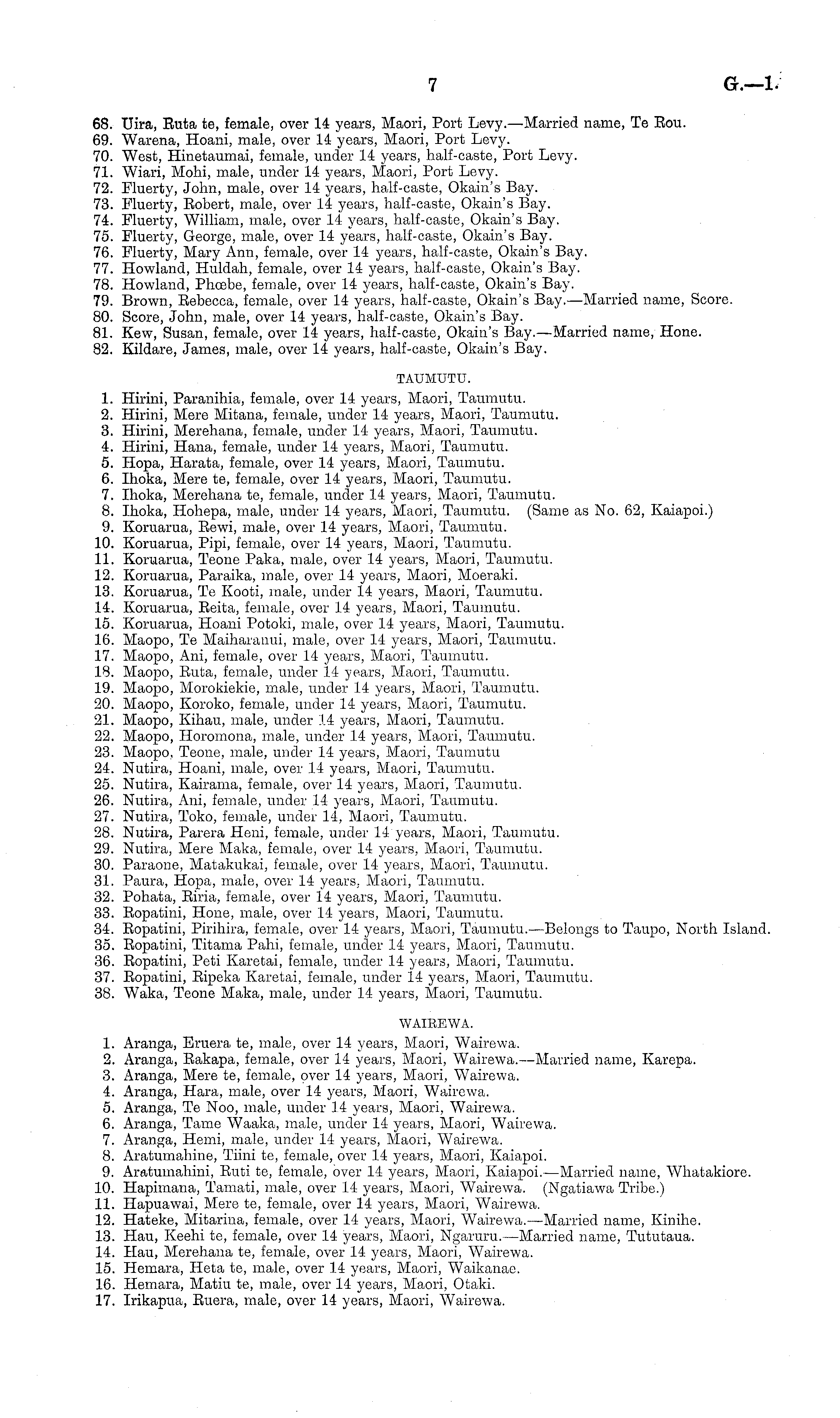 68. Uira, Euta te, female, over 14 years, Maori, Port Levy.—Married name, Te Eou. 69. Warena, Hoard, male, over 14 years, Maori, Port Levy. 70. West, Hinetaumai, female, under 14 years, half-caste, Port Levy. 71. Wiari, Mohi, male, under 14 years, Maori, Port Levy. 72. Fluerty, John, male, over 14 years, half-caste, Okain's Bay. 73. Fluerty, Eobert, male, over 14 years, half-caste, Okain's Bay. 74. Fluerty, William, male, over 14 years, half-caste, Okain's Bay. 75. Fluerty, George, male, over 14 years, half-caste, Okain's Bay. 76. Fluerty, Mary Ann, female, over 14 years, half-caste, Okain's Bay. 77. Howland, Huldah, female, over 14 years, half-caste, Okain's Bay. 78. Howland, Phcebe, female, over 14 years, half-caste, Okain's Bay. 79. Brown, Eebecca, female, over 14 years, half-caste, Okain's Bay. —Married name, Score. 80. Score, John, male, over 14 years, half-caste, Okain's Bay. 81. Kew, Susan, female, over 14 years, half-caste, Okain's Bay.—Married name, Hone. 82. Kildare, James, male, over 14 years, half-caste, Okain's Bay. TAUMUTU. 1. Hirini, Paranihia, female, over 14 years, Maori, Taumutu. 2. Hirini, Mere Mitana, female, under 14 years, Maori, Taumutu. 3. Hirini, Merehana, female, under 14 years, Maori, Taumutu. 4. Hirini, Hana, female, under 14 years, Maori, Taumutu. 5. Hopa, Harata, female, over 14 years, Maori, Taumutu. 6. Ihoka, Mere te, female, over 14 years, Maori, Taumutu. 7. Ihoka, Merehana te, female, under 14 years, Maori, Taumutu. 8. Ihoka, Hohepa, male, under 14 years, Maori, Taumutu. (Same as No. 62, Kaiapoi.) 9. Koruarua, Eewi, male, over 14 years, Maori, Taumutu. 10. Koruarua, Pipi, female, over 14 years, Maori, Taumutu. 11. Koruarua, Teone Paka, male, over 14 years, Maori, Taumutu. 12. Koruarua, Paraika, male, over 14 years, Maori, Moeraki. 13. Koruarua, Te Kooti, male, under 14 years, Maori, Taumutu. 14. Koruarua, Eeita, female, over 14 years, Maori, Taumutu. 15. Koruarua, Hoani Potoki, male, over 14 years, Maori, Taumutu. 16. Maopo, Te Maiharanui, male, over 14 years, Maori, Taumutu. 17. Maopo, Ani, female, over 14 years, Maori, Taumutu. 18. Maopo, Euta, female, under 14 years, Maori, Taumutu. 19. Maopo, Morokiekie, male, under 14 years, Maori, Taumutu. 20. Maopo, Koroko, female, under 14 years, Maori, Taumutu. 21. Maopo, Kihau, male, under 14 years, Maori, Taumutu. 22. Maopo, Horomona, male, under 14 years, Maori, Taumutu. 23. Maopo, Teone, male, under 14 years, Maori, Taumutu 24. Nutira, Hoani, male, over 14 years, Maori, Taumutu. 25. Nutira, Kairama, female, over 14 years, Maori, Taumutu. 26. Nutira, Ani, female, under 14 years, Maori, Taumutu. 27. Nutira, Toko, female, under 14, Maori, Taumutu. 28. Nutira, Parera Hem, female, under 14 years, Maori, Taumutu. 29. Nutira, Mere Maka, female, over 14 years, Maori, Taumutu. 30. Paraone, Matakukai, female, over 14 years, Maori, Taumutu. 31. Paura, Hopa, male, over 14 years, Maori, Taumutu. 32. Pohata, Eiria, female, over 14 years, Maori, Taumutu. 33. Eopatini, Hone, male, over 14 years, Maori, Taumutu. 34. Eopatini, Pirihira, female, over 14 years, Maori, Taumutu.—Belongs to Taupo, North Island, 35. Eopatini, Titama Pahi, female, under 14 years, Maori, Taumutu. 36. Eopatini, Peti Karetai, female, under 14 years, Maori, Taumutu. 37. Eopatini, Eipeka Karetai, female, under 14 years, Maori, Taumutu. 38. Waka, Teone Maka, male, under 14 years, Maori, Taumutu. WAIEEWA. 1. Aranga, Eruera te, male, over 14 years, Maori, Wairewa. 2. Aranga, Eakapa, female, over 14 years, Maori, Wairewa.—Married name, Karepa. 3. Aranga, Mere te, female, over 14 years, Maori, Wairewa. 4. Aranga, Hara, male, over 14 years, Maori, Wairewa. 5. Aranga, Te Noo, male, under 14 years, Maori, Wairewa. 6. Aranga, Tame Waaka, male, under 14 years, Maori, Wairewa. 7. Aranga, Hemi, male, under 14 years, Maori, Wairewa. 8. Aratumahine, Tiini te, female, over 14 years, Maori, Kaiapoi. 9. Aratumahini, Euti te, female, over 14 years, Maori, Kaiapoi.—Married name, Whatakiore. 10. Hapimana, Tamati, male, over 14 years, Maori, Wairewa. (Ngatiawa Tribe.) 11. Hapuawai, Mere te, female, over 14 years, Maori, Wairewa. 12. Hateke, Mitarina, female, over 14 years, Maori, Wairewa.—Married name, Kinihe. 13. Hau, Keehi te, female, over 14 years, Maori, Ngaruru.—Married name, Tututaua. 14. Hau, Merehana te, female, over 14 years, Maori, Wairewa. 15. Hemara, Heta te, male, over 14 years, Maori, Waikanae. 16. Hemara, Matiu te, male, over 14 years, Maori, Otaki. 17. Irikapua, Euera, male, over 14 years, Maori, Wairewa.