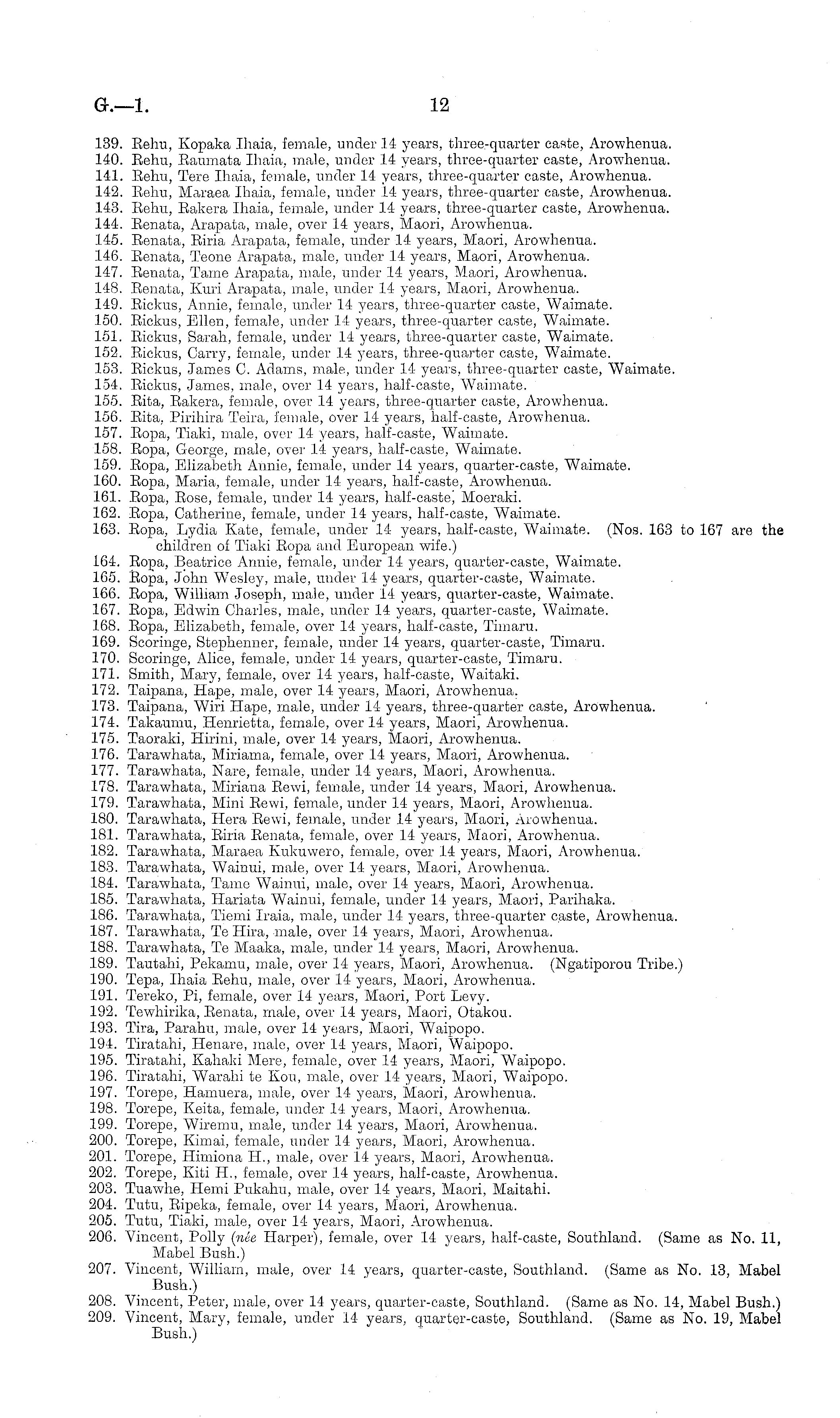 139. Behu, Kopaka Ihaia, female, under 14 years, three.-qnarter caste, Arowhenua. 140. Eehu, Eanmata Ihaia, male, under 14 years, three-quarter caste, Arowhenua. 141. Eehu, Tere Ihaia, female, under 14 years, three-quarter caste, Arowhenua. 142. Eehu, Maraea Ihaia, female, under 14 years, three-quarter caste, Arowhenua. 143. Eehu, Eakera Ihaia, female, under 14 years, three-quarter caste, Arowhenua. 144. Eenata, Arapata, male, over 14 years, Maori, Arowhenua. 145. Eenata, Eiria Arapata, female, under 14 years, Maori, Arowhenua. 146. Eenata, Teone Arapata, male, under 14 years, Maori, Arowhenua. 147. Eenata, Tame Arapata, male, under 14 years, Maori, Arowhenua. 148. Eenata, Kuri Arapata, male, under 14 years, Maori, Arowhenua. 149. Eickus, Annie, female, under 14 years, three-quarter caste, Waimate. 150. Eickus, Ellen, female, under 14 years, three-quarter caste, Waimate. 151. Eickus, Sarah, female, under 14 years, three-quarter caste, Waimate. 152. Eickus, Carry, female, under 14 years, three-quarter caste, Waimate. 153. Eickus, James G. Adams, male, under 14 years, three-quarter caste, Waimate. 154. Eickus, James, male, over 14 years, half-caste, Waimate. 155. Eita, Eakera, female, over 14 years, three-quarter caste, Arowhenua. 156. Eita, Pirihira Teira, female, over 14 years, half-caste, Arowhenua. 157. Eopa, Tiaki, male, over 14 years, half-caste, Waimate. 158. Eopa, George, male, over 14 years, half-caste, Waimate. 159. Eopa, Elizabeth Annie, female, under 14 years, quarter-caste, Waimate. 160. Eopa, Maria, female, under 14 years, half-caste, Arowhenua. 161. Eopa, Eose, female, under 14 years, half-castej Moeraki. 162. Eopa, Catherine, female, under 14 years, half-caste, Waimate. 163. Eopa, Lydia Kate, female, under 14 years, half-caste, Waimate. (Nos. 163 to 167 are the children of Tiaki Eopa and European wife.) 164. Eopa, Beatrice Annie, female, under 14 years, quarter-caste, Waimate. 165. Eopa, John Wesley, male, under 14 years, quarter-caste, Waimate. 166. Eopa, William Joseph, male, under 14 years, quarter-caste, Waimate. 167. Eopa, Edwin Charles, male, under 14 years, quarter-caste, Waimate. 168. Eopa, Elizabeth, female, over 14 years, half-caste, Timaru. 169. Scoringe, Stephenner, female, under 14 years, quarter-caste, Timaru. 170. Scoringe, Alice, female, under 14 years, quarter-caste, Timaru. 171. Smith, Mary, female, over 14 years, half-caste, Waitaki. 172. Taipana, Ilape, male, over 14 years, Maori, Arowhenua. 173. Taipana, Wiri Hape, male, under 14 years, three-quarter caste, Arowhenua. 174. Takaumu, Henrietta, female, over 14 years, Maori, Arowhenua. 175. Taoraki, Hirini, male, over 14 years, Maori, Arowhenua. 176. Tarawhata, Miriama, female, over 14 years, Maori, Arowhenua. 177. Tarawhata, Nare, female, under 14 years, Maori, Arowhenua. 178. Tarawhata, Miriana Eewi, female, under 14 years, Maori, Arowhenua. 179. Tarawhata, Mini Eewi, female, under 14 years, Maori, Arowhenua. 180. Tarawhata, Hera Eewi, female, under 14 years, Maori, Arowhenua. 181. Tarawhata, Eiria Eenata, female, over 14 years, Maori, Arowhenua. 182. Tarawhata, Maraea Kukuwero, female, over 14 years, Maori, Arowhenua. 183. Tarawhata, Wainui, male, over 14 years, Maori, Arowhenua. 184. Tarawhata, Tamo Wainui, male, over 14 years, Maori, Arowhenua. 185. Tarawhata, Hariata Wainui, female, under 14 years, Maori, Parihaka. 186. Tarawhata, Tiemi Iraia, male, under 14 years, three-quarter caste, Arowhenua. 187. Tarawhata, Te Hira, male, over 14 years, Maori, Arowhenua. 188. Tarawhata, Te Maaka, male, under 14 years, Maori, Arowhenua. 189. Tautahi, Pekamu, male, over 14 years, Maori, Arowhenua. (Ngatiporou Tribe.) 190. Tepa, Ihaia Eehu, male, over 14 years, Maori, Arowhenua. 191. Tereko, Pi, female, over 14 years, Maori, Port Levy. 192. Tewhirika, Eenata, male, over 14 years, Maori, Otakou. 193. Tira, Parahu, male, over 14 years, Maori, Waipopo. 194. Tiratahi, Henare, male, over 14 years, Maori, Waipopo. 195. Tiratahi, Kahaki Mere, female, over 14 years, Maori, Waipopo. 196. Tiratahi, Warahi te Kou, male, over 14 years, Maori, Waipopo. 197. Torepe, Hamuera, male, over 14 years, Maori, Arowhenua. 198. Torepe, Keita, female, under 14 years, Maori, Arowhenua. 199. Torepe, Wiremu, male, under 14 years, Maori, Arowhenua. 200. Torepe, Kimai, female, under 14 years, Maori, Arowhenua. 201. Torepe, Himiona H., male, over 14 years, Maori, Arowhenua. 202. Torepe, Kiti H., female, over 14 years, half-caste, Arowhenua. 203. Tuawhe, Hemi Pukahu, male, over 14 years, Maori, Maitahi. 204. Tutu, Eipeka, female, over 14 years, Maori, Arowhenua. 205. Tutu, Tiaki, male, over 14 years, Maori, Arowhenua. 206. Vincent, Polly (nee Harper), female, over 14 years, half-caste, Southland. (Same as No. 11, Mabel Bush.) 207. Vincent, William, male, over 14 years, quarter-caste, Southland. (Same as No. 13, Mabel Bush.) 208. Vincent, Peter, male, over 14 years, quarter-caste, Southland. (Same as No. 14, Mabel Bush.) 209. Vincent, Mary, female, under 14 years, quarter-caste, Southland. (Same as No. 19, Mabel Bush.)