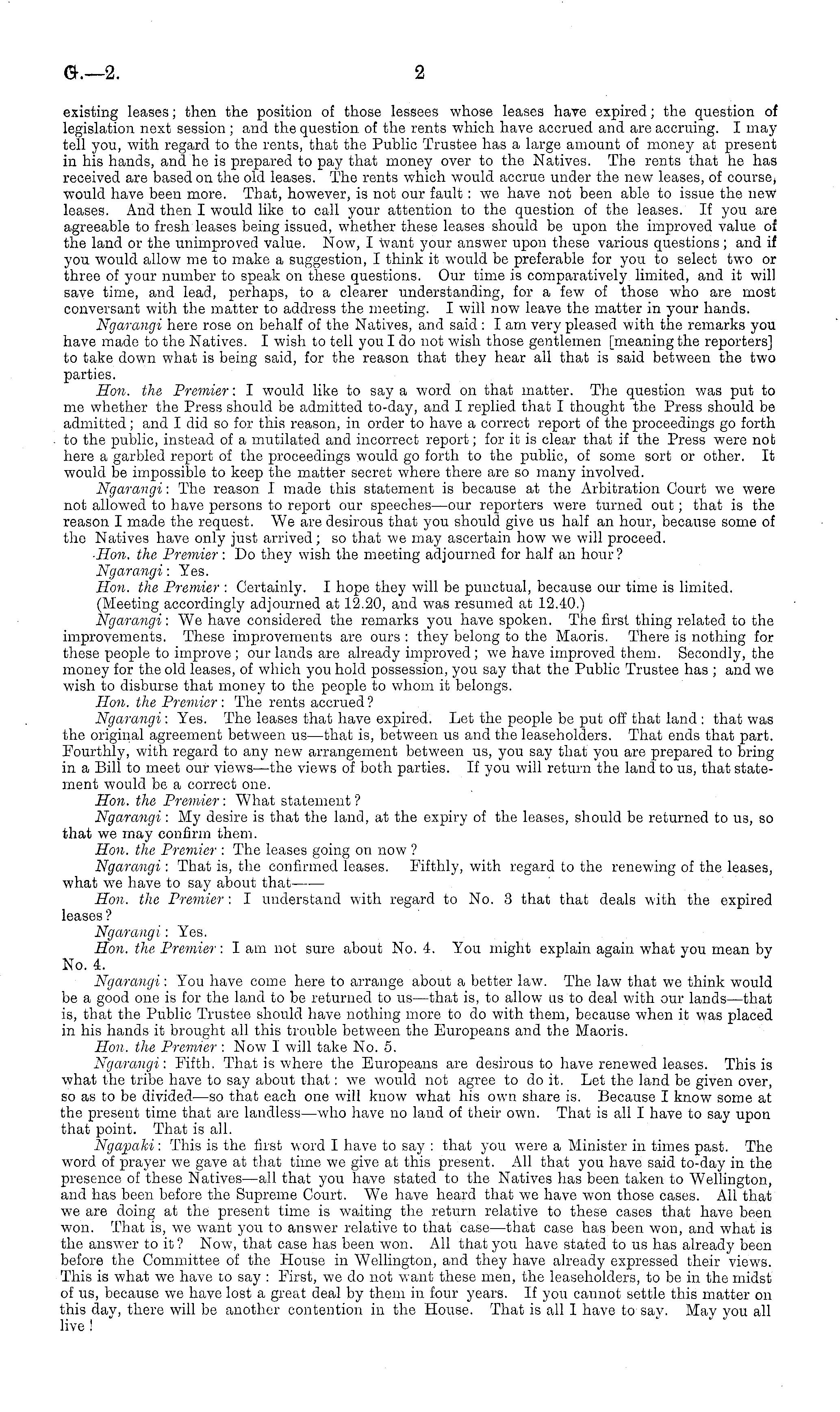 existing leases; then the position of those lessees whose leases have expired; the question of legislation next session ; and the question of the rents which have accrued and are accruing. I may tell you, with regard to the rents, that the Public Trustee has a large amount of money at present in his hands, and he is prepared to pay that money over to the Natives. The rents that he has received are based on the old leases. The rents which would accrue under the new leases, of course, would have been more. That, however, is not our fault: we have not been able to issue the new leases. And then I would like to call your attention to the question of the leases. If you are agreeable to fresh leases being issued, whether these leases should be upon the improved value of the land or the unimproved value. Now, I want your answer upon these various questions ; and if you would allow me to make a suggestion, I think it would be preferable for you to select two or three of your number to speak on these questions. Our time is comparatively limited, and it will save time, and lead, perhaps, to a clearer understanding, for a few of those who are most conversant with the matter to address the meeting. I will now leave the matter in your hands. Ngarangi here rose on behalf of the Natives, and said : I am very pleased with the remarks you have made to the Natives. I wish to tell you Ido not wish those gentlemen [meaning the reporters] to take down what is being said, for the reason that they hear all that is said between the two parties. Hon. the Premier : I would like to say a word on that matter. The question was put to me whether the Press should be admitted to-day, and I replied that I thought the Press should be admitted; and I did so for this reason, in order to have a correct report of the proceedings go forth to the public, instead of a mutilated and incorrect report; for it is clear that if the Press were not here a garbled report of the proceedings would go forth to the public, of some sort or other. It would be impossible to keep the matter secret where there are so many involved. Ngarangi : The reason I made this statement is because at the Arbitration Court we were not allowed to have persons to report our speeches—our reporters were turned out; that is the reason I made the request. We are desirous that you should give us half an hour, because some of the Natives have only just arrived; so that we may ascertain how we will proceed. ■Hon. the Premier : Do they wish the meeting adjourned for half an hour? Ngarangi : Yes. Hon. the Premier : Certainly. I hope they will be punctual, because our time is limited. (Meeting accordingly adjourned at 12.20, and was resumed at 12.40.) Ngarangi : We have considered the remarks you have spoken. The first thing related to the improvements. These improvements are ours : they belong to the Maoris. There is nothing for these people to improve ; our lands are already improved ;we have improved them. Secondly, the money for the old leases, of which you hold possession, you say that the Public Trustee has ; and we wish to disburse that money to the people to whom it belongs. Hon. the Premier : The rents accrued ? Ngarangi : Yes. The leases that have expired. Let the people be put off that land : that was the original agreement between us—that is, between us and the leaseholders. That ends that part. Fourthly, with regard to any new arrangement between us, you say that you are prepared to bring in a Bill to meet our views—the views of both parties. If you will return the land to us, that statement would be a correct one. Hon. the Premier : What statement ? Ngarangi: My desire is that the land, at the expiry of the leases, should be returned to us, so that we may confirm them. Hon. the Premier : The leases going on now ? Ngarangi : That is, the confirmed leases. Fifthly, with regard to the renewing of the leases, what we have to say about that Hon. the Premier : I understand with regard to No. 3 that that deals with the expired leases'? Ngarangi: Yes. Hon. the Premier : lam not sure about No. 4. You might explain again what you mean by No. 4. Ngarangi : You have come here to arrange about a better law. The law that we think would be a good one is for the land to be returned to vs —that is, to allow us to deal with our lands—that is, that the Public Trustee should have nothing more to do with them, because when it was placed in his hands it brought all this trouble between the Europeans and the Maoris. Hon. the Premier : Now I will take No. 5. Ngarangi : Fifth. That is where the Europeans are desirous to have renewed leases. This is what the tribe have to say about that: we would not agree to do it. Let the land be given over, so as to be divided —so that each one will know what his own share is. Because I know some at the present time that are landless—who have no land of their own. That is all I have to say upon that point. That is all. Ngapaki : This is the first word I have to say : that you were a Minister in times past. The word of prayer we gave at that time we give at this present. All that you have said to-day in the presence of these Natives—all that you have stated to the Natives has been taken to Wellington, and has been before the Supreme Court. We have heard that we have won those cases. All that we are doing at the present time is waiting the return relative to these cases that have been won. That is, we want you to answer relative to that case—that case has been won, and what is the answer to it? Now, that case has been won. All that you have stated to us has already been before the Committee of the House in Wellington, and they have already expressed their views. This is what we have to say : First, we do not want these men, the leaseholders, to be in the midst of us, because we have lost a great deal by them in four years. If you cannot settle this matter on this day, there will be another contention in the House. That is all 