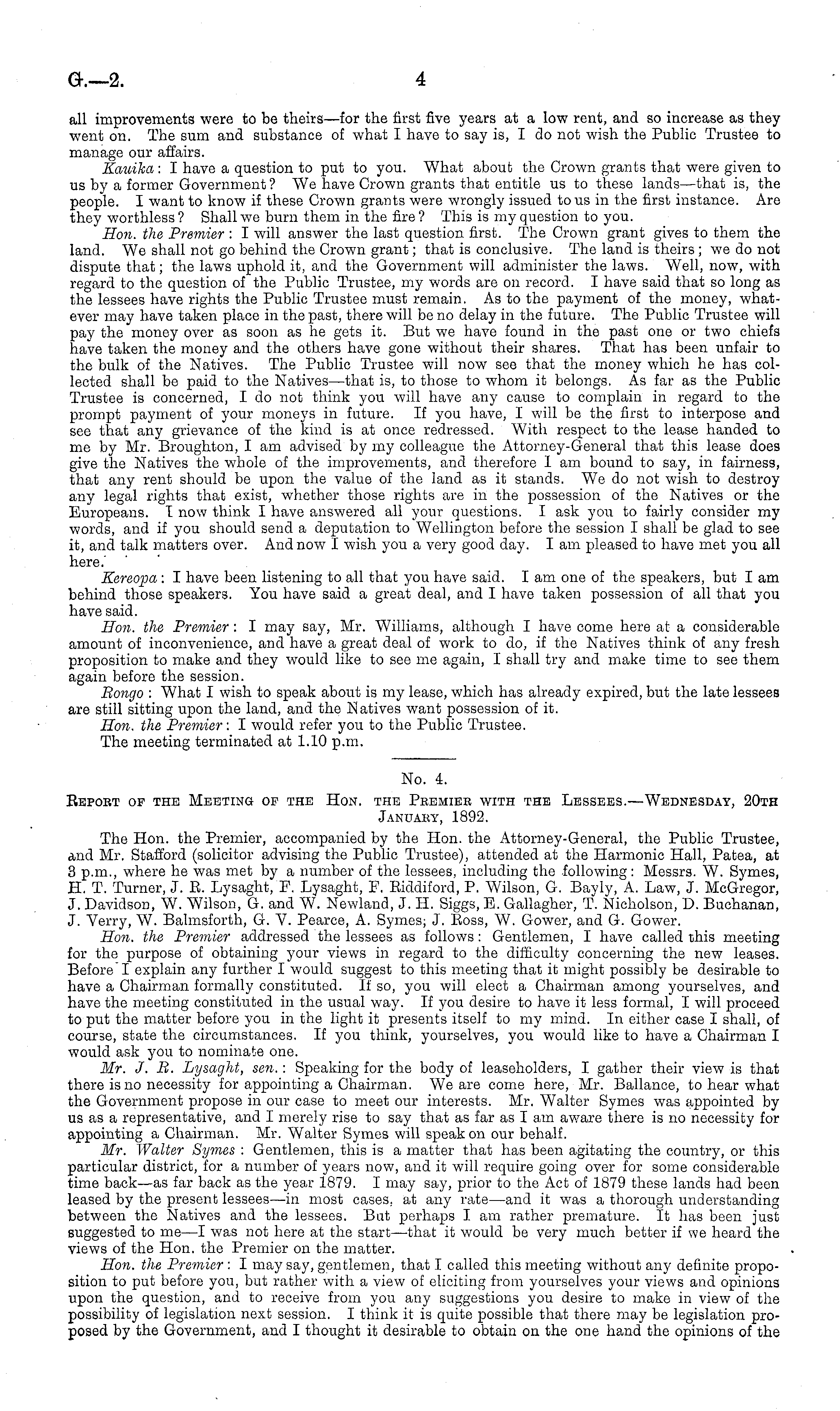 No. 4. Eeport op the Meeting op the Hon. the Pbemier with the Lessees.—Wednesday, 20th Januaby, 1892. The Hon. the Premier, accompanied by the Hon. the Attorney-General, the Public Trustee, and Mr. Stafford (solicitor advising the Public Trustee), attended at the Harmonic Hall, Patea, at 3 p.m., where he was met by a number of the lessees, including the following: Messrs. W. Symes, H. T. Turner, J. E. Lysaght, F. Lysaght, P. Eiddiford, P. Wilson, G. Bayly, A. Law, J. McGregor, J. Davidson, W. Wilson, G. and W. Newland, J. H. Siggs, B. Gallagher, T. Nicholson, D. Buchanan, J. Verry, W. Balmsforth, G. V. Pearce, A. Symes; J. Eoss, W. Gower, and G. Gower. Hon. the Premier addressed the lessees as follows: Gentlemen, I have called this meeting for the purpose of obtaining your views in regard to the difficulty concerning the new leases. Before I explain any further I would suggest to this meeting that it might possibly be desirable to have a Chairman formally constituted. If so, you will elect a Chairman among yourselves, and have the meeting constituted in the usual way. If you desire to have it less formal, I will proceed to put the matter before you in the light it presents itself to my mind. In either case I shall, of course, state the circumstances. If you think, yourselves, you would like to have a Chairman I would ask you to nominate one. Mr. J. B. Lysaght, sen. : Speaking for the body of leaseholders, I gather their view is that there is no necessity for appointing a Chairman. We are come here, Mr. Ballance, to hear what the Government propose in our case to meet our interests. Mr. Walter Symes was appointed by us as a representative, and I merely rise to say that as far as I am aware there is no necessity for appointing a Chairman. Mr. Walter Symes will speak on our behalf. Mr. Walter Symes : Gentlemen, this is a matter that has been agitating the country, or this particular district, for a number of years now, and it will require going over for some considerable time back—as far back as the year 1879. I may say, prior to the Act of 1879 these lands had been leased by the present lessees—in most cases, at any rate —and it was a thorough understanding between the Natives and the lessees. But perhaps I am rather premature. It has been just suggested to me —I was not here at the start —that it would be very much better if we heard the views of the Hon. the Premier on the matter. Hon. the Premier : I may say, gentlemen, that I called this meeting without any definite proposition to put before you, but rather with a view of eliciting from yourselves your views and opinions upon the question, and to receive from you any suggestions you desire to make in view of the possibility of legislation next session. I think it is quite possible that there may be legislation proposed by the Government, and I thought it desirable to obtain on the one hand the opinions of the