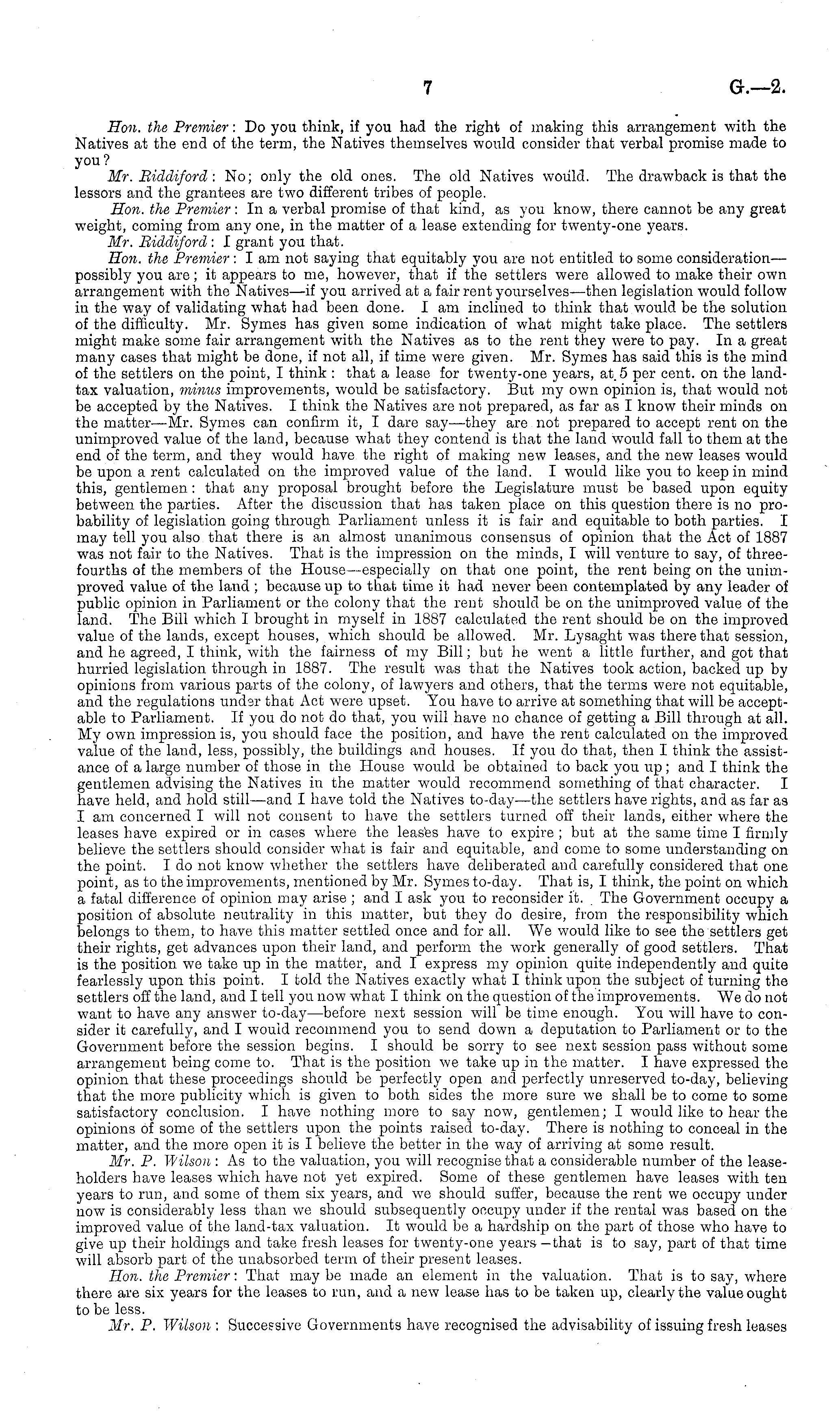 Hon. the Premier : Do you think, if you had the right of making this arrangement with the Natives at the end of the term, the Natives themselves would consider that verbal promise made to you ? Mr. Biddiford : No; only the old ones. The old Natives would. The drawback is that the lessors and the grantees are two different tribes of people. Hon. the Premier : In a verbal promise of that kind, as you know, there cannot be any great weight, coming from any one, in the matter of a lease extending for twenty-one years. Mr. Biddiford : I grant you that. Hon. the Premier : lam not saying that equitably you are not entitled to some consideration— possibly you are; it appears to me, however, that if the settlers were allowed to make their own arrangement with the Natives—if you arrived at a fair rent yourselves—then legislation would follow in the way of validating what had been done. I am inclined to think that would be the solution of the difficulty. Mr. Symes has given some indication of what might take place. The settlers might make some fair arrangement with the Natives as to the rent they were to pay. In a great many cases that might be done, if not all, if time were given. Mr. Symes has said this is the mind of the settlers on the point, I think : that a lease for twenty-one years, at. 5 per cent, on the landtax valuation, minus improvements, would be satisfactory. But my own opinion is, that would not be accepted by the Natives. I think the Natives are not prepared, as far as I know their minds on the matter —Mr. Symes can confirm it, I dare say—they are not prepared to accept rent on the unimproved value of the land, because what they contend is that the land would fall to them at the end of the term, and they would have the right of making new leases, and the new leases would be upon a rent calculated on the improved value of the land. I would like you to keep in mind this, gentlemen : that any proposal brought before the Legislature must be based upon equity between the parties. After the discussion that has taken place on this question there is no probability of legislation going through Parliament unless it is fair and equitable to both parties. I may tell you also that there is an almost unanimous consensus of opinion that the Act of 1887 was not fair to the Natives. That is the impression on the minds, I will venture to say, of threefourths of the members of the House —especially on that one point, the rent being on the unimproved value of the land ; because up to that time it had never been contemplated by any leader of public opinion in Parliament or the colony that the rent should be on the unimproved value of the land. The Bill which I brought in myself in 1887 calculated the rent should be on the improved value of the lands, except houses, which should be allowed. Mr. Lysaght was there that session, and he agreed, I think, with the fairness of my Bill; but he went a little further, and got that hurried legislation through in 1887. The result was that the Natives took action, backed up by opinions from various parts of the colony, of lawyers and others, that the terms were not equitable, and the regulations under that Act were upset. You have to arrive at something that will be acceptable to Parliament. If you do not do that, you will have no chance of getting a Bill through at all. My own impression is, you should face the position, and have the rent calculated on the improved value of the land, less, possibly, the buildings and houses. If you do that, then I think the assistance of a large number of those in the House would be obtained to back you up ; and I think the gentlemen advising the Natives in the matter would recommend something of that character. I have held, and hold still—and I have told the Natives to-day—the settlers have rights, and as far as I am concerned I will not consent to have the settlers turned off their lands, either where the leases have expired or in cases where the leases have to expire ; but at the same time I firmly believe the settlers should consider what is fair and equitable, and come to some understanding on the point. Ido not know whether the settlers have deliberated and carefully considered that one point, as to the improvements, mentioned by Mr. Symes to-day. That is, I think, the point on which a fatal difference of opinion may arise ; and I ask you to reconsider it. The Government occupy a position of absolute neutrality in this matter, but they do desire, from the responsibility which belongs to them, to have this matter settled once and for all. We would like to see the settlers get their rights, get advances upon their land, and perform the work generally of good settlers. That is the position we take up in the matter, and I express my opinion quite independently and quite fearlessly upon this point. I told the Natives exactly what I think upon the subject of turning the settlers off the land, and I tell you now what I think on the question of the improvements. We do not want to have any answer to-day—before next session will be time enough. You will have to consider it carefully, and I would recommend you to send down a deputation to Parliament or to the Government before the session begins. I should be sorry to see next session pass without some arrangement being come to. That is the position we take up in the matter. I have expressed the opinion that these proceedings should be perfectly open and perfectly unreserved to-day, believing that the more publicity which is given to both sides the more sure we shall be to come to some satisfactory conclusion. I have nothing more to say now, gentlemen; I would like to hear the opinions of some of the settlers upon the points raised to-day. There is nothing to conceal in the matter, and the more open it is I believe the better in the way of arriving at some result. Mr. P. Wilson : As to the valuation, you will recognise that a considerable number of the leaseholders have