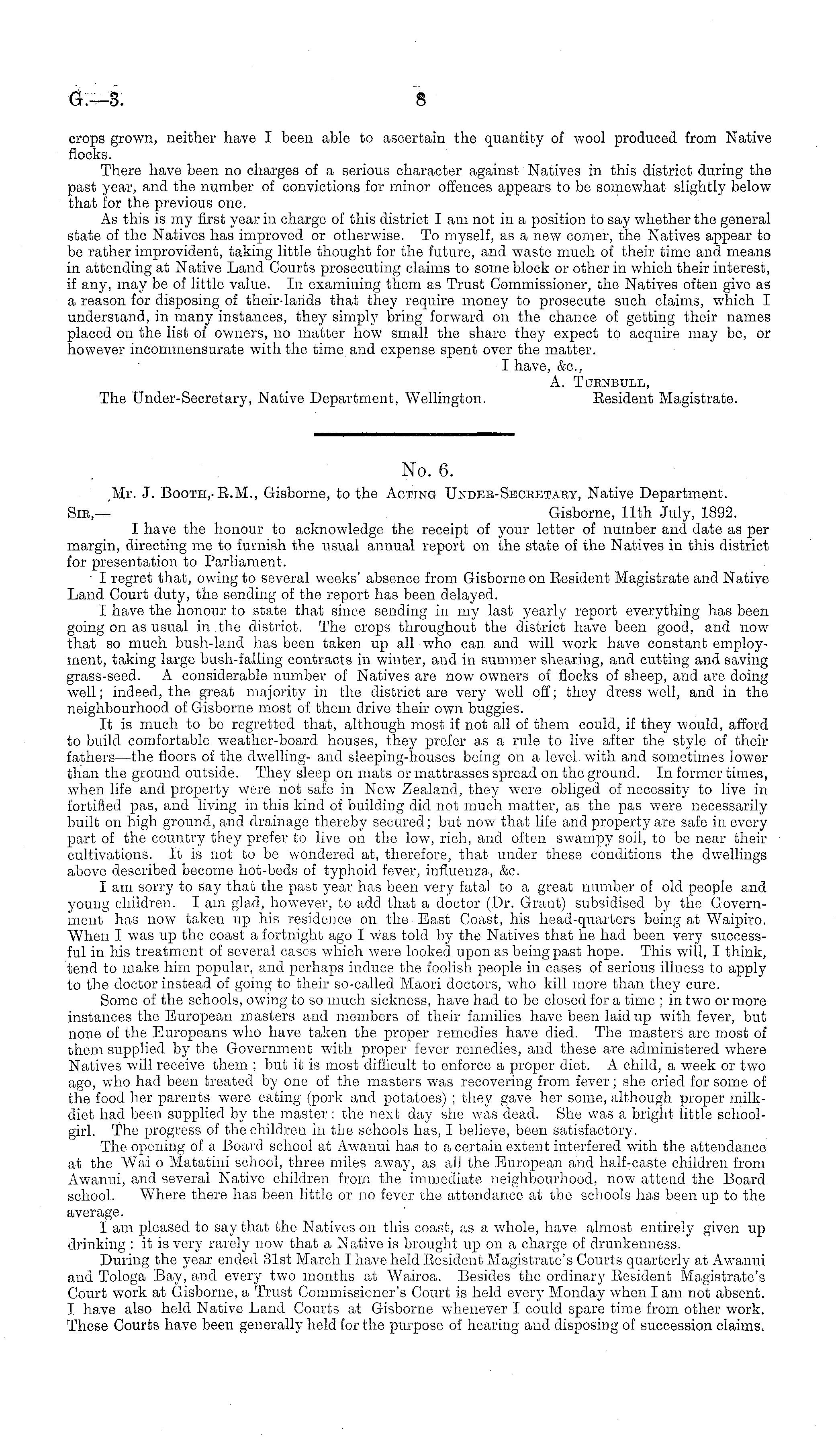 No. 6. ,Mr. J. Booth,-R.M., Gisborne, to the Acting Undeb-Secbetaby, Native Department. Sib,— Gisborne, 11th July, 1892. I have the honour to acknowledge the receipt of your letter of number and date as per margin, directing me to furnish the usual annual report on the state of the Natives in this district for presentation to Parliament. ■ I regret that, owing to several weeks' absence from Gisborne on Resident Magistrate and Native Land Court duty, the sending of the report has been delayed. I have the honour to state that since sending in my last yearly report everything has been going on as usual in the district. The crops throughout the district have been good, and now that so much bush-land has been taken up all who can and will work have constant employment, taking large bush-falling contracts in winter, and in summer shearing, and cutting and saving grass-seed. A considerable number of Natives are now owners of flocks of sheep, and are doing well; indeed, the great majority in the district are very well off; they dress well, and in the neighbourhood of Gisborne most of them drive their own buggies. It is much to be regretted that, although most if not all of them could, if they would, afford to build comfortable weather-board houses, the) 7 prefer as a rule to live after the style of their fathers —the floors of the dwelling- and sleeping-houses being on a level with and sometimes lower than the ground outside. They sleep on mats or mattrasses spread on the ground. In former times, when life and property were not safe in New Zealand, they were obliged of necessity to live in fortified pas, and living in this kind of building did not much matter, as the pas were necessarily built on high ground, and drainage thereby secured; but now that life and property are safe in every part of the country they prefer to live on the low, rich, and often swampy soil, to be near their cultivations. It is not to be wondered at, therefore, that under these conditions the dwellings above described become hot-beds of typhoid fever, influenza, &c. I am sorry to say that the past year has been very fatal to a great number of old people and young children. lam glad, however, to add that a doctor (Dr. Grant) subsidised by the Government has now taken up his residence on the East Coast, his head-quarters being at Waipiro. When I was up the coast a fortnight ago I was told by the Natives that he had been very successful in his treatment of several cases which were looked upon as being past hope. This will, I think, tend to make him popular, and perhaps induce the foolish people in cases of serious illness to apply to the doctor instead of going to their so-called Maori doctors, who kill more than they cure. Some of the schools, owing to so much sickness, have had to be closed for a time : in two or more instances the European masters and members of their families have been laid up with fever, but none of the Europeans who have taken the proper remedies have died. The masters are most of them supplied by the Government with proper fever remedies, and these are administered where Natives will receive them ; but it is most difficult to enforce a proper diet. A child, a week or two ago, who had been treated by one of the masters was recovering from fever; she cried for some of the food her parents were eating (pork and potatoes) ; they gave her some, although proper milkdiet had been supplied by the master: the next day she was dead. She was a bright little schoolgirl. The progress of the children in the schools has, I believe, been satisfactory. The opening of a Board school at Awanui has to a certain extent interfered with the attendance at the Wai o IVlatatini school, three miles away, as all the European and half-caste children from Awanui, and several Native children from the immediate neighbourhood, now attend the Board school. Where there has been little or no fever the attendance at the schools has been up to the average. I am pleased to say that the Natives on this coast, as a whole, have almost entirely given up drinking : it is very rarely now that a Native is brought up on a charge of drunkenness. During the year ended 31st March I have held Resident Magistrate's Courts quarterly at Awanui and Tologa Bay, and every two months at Wairoa. Besides the ordinary Resident Magistrate's Court work at Gisborne, a Trust Commissioner's Court is held every Monday when I am not absent. I have also held Native Land Courts at Gisborne whenever I could spare time from other work. These Courts have been generally held for the purpose of hearing and disposing of succession claims.