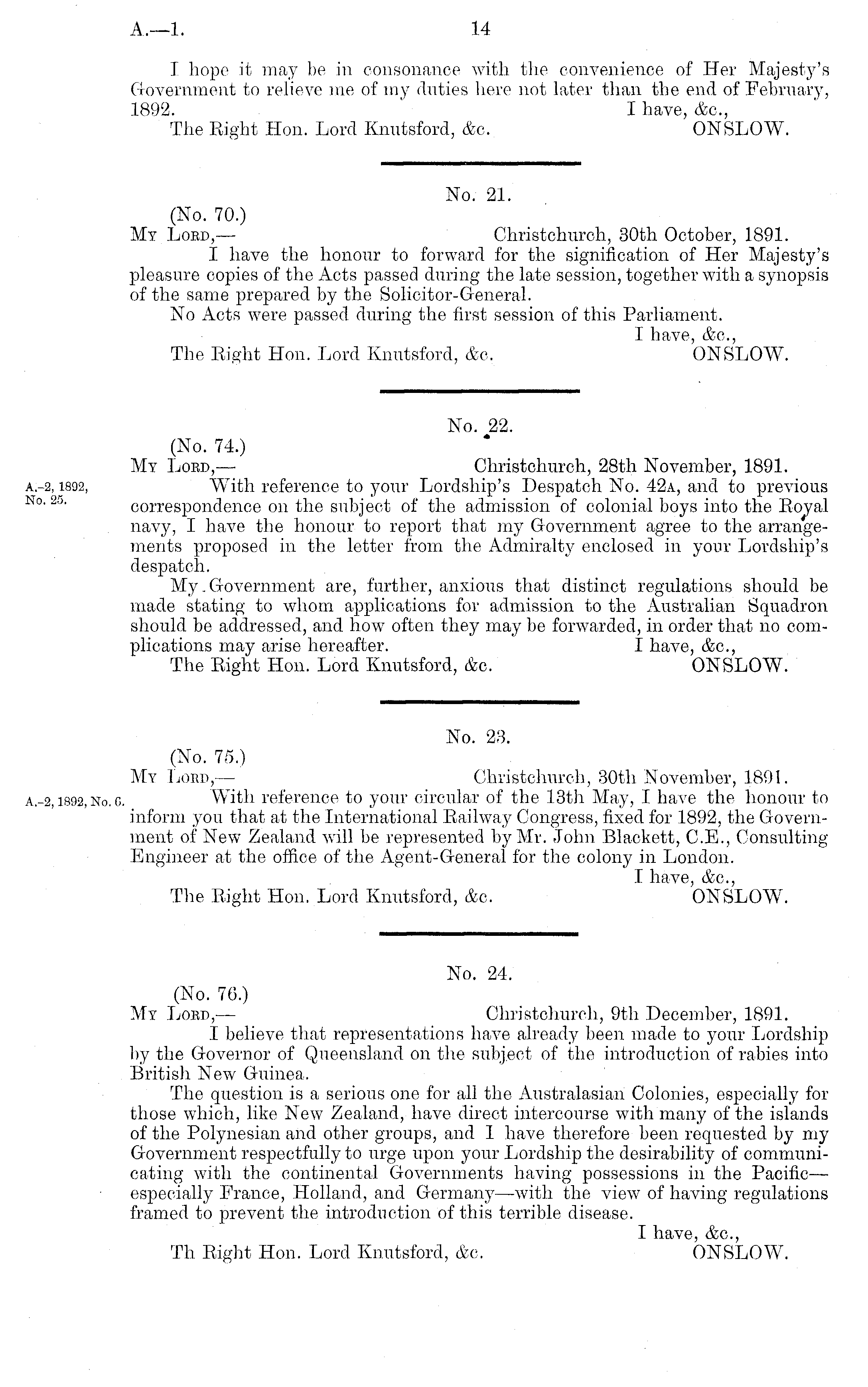 I hope it may be in consonance with the convenience of Her Majesty's Government to relieve me of my duties here not later than the end of February, 1892. I have, &c, The Eight Hon. Lord Knutsford, &c. ONSLOW.