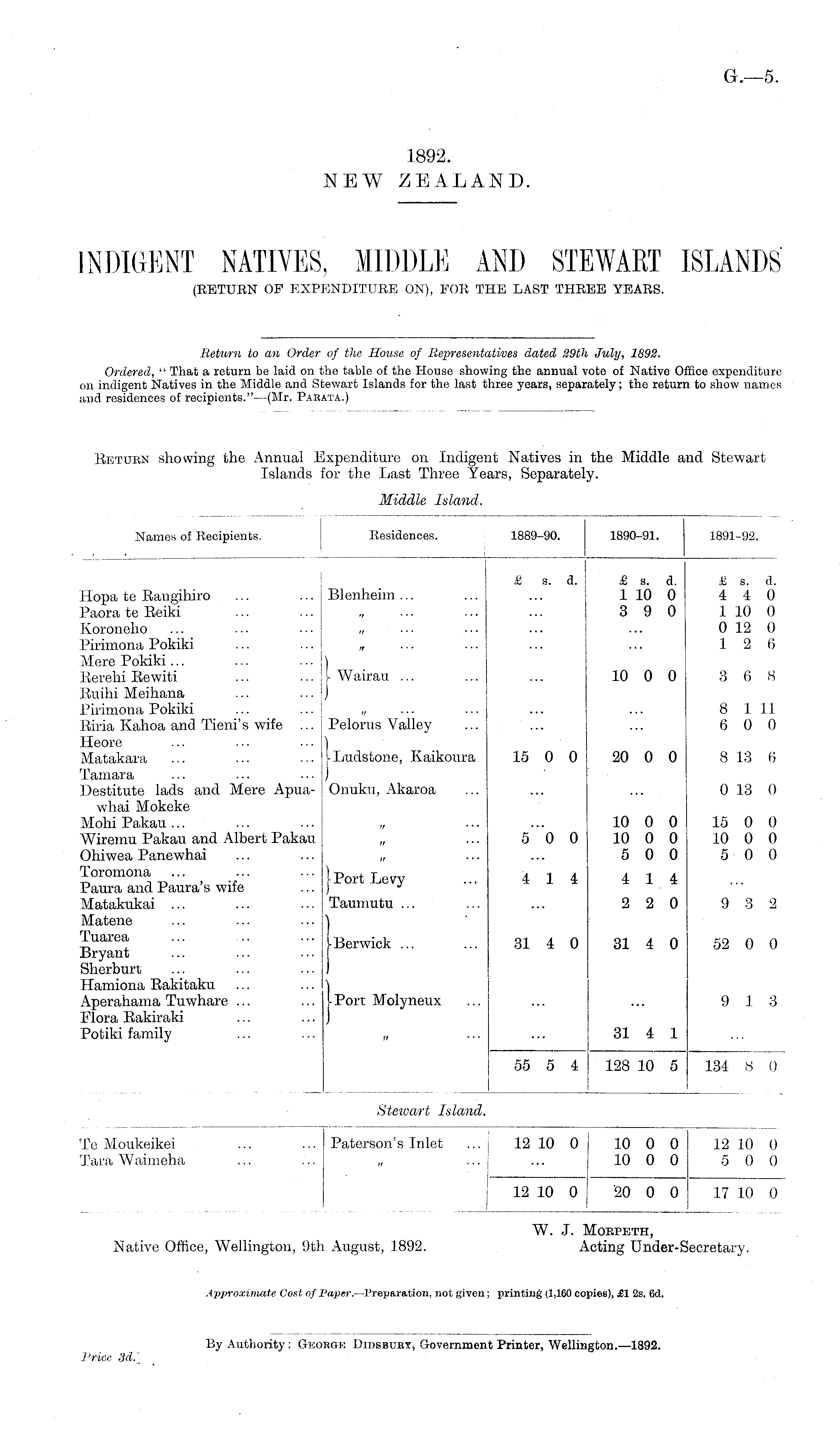 W. J. Morpeth, Native Office, Wellington, 9th August, 1892. Acting Under-Secretary. Approximate Cost of Paper. —Preparation, not given; printing (1,160 copies), £1 2s. 6d.