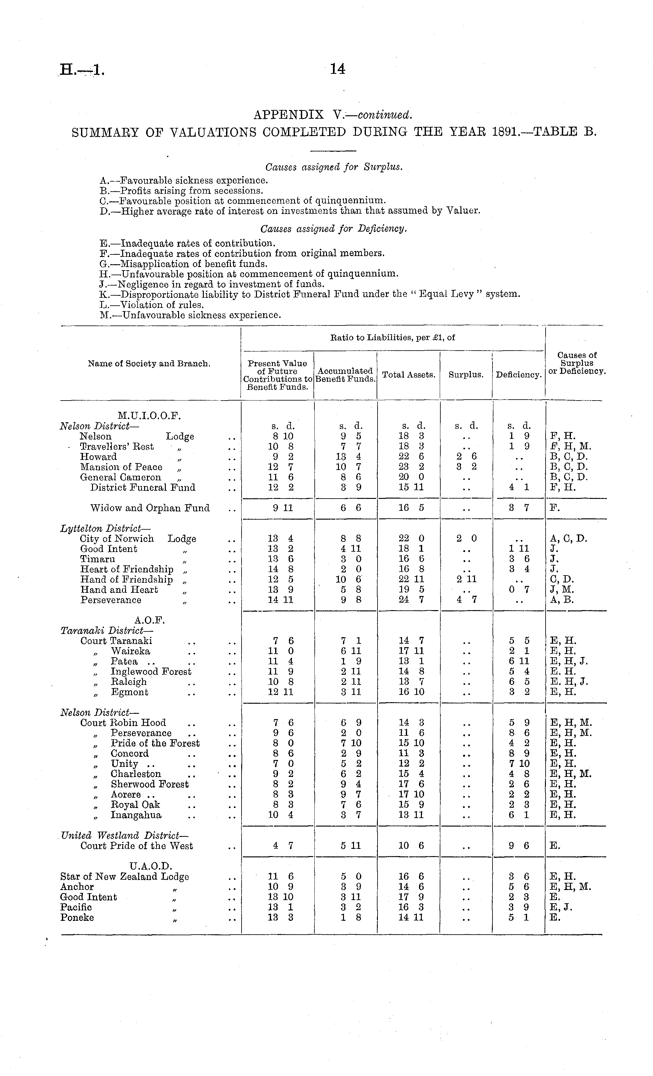 Causes assigned for Surplus. A.—Favourable sickness experience. B. —Profits arising from secessions. C.—Favourable position at commencement of quinquennium. D.—Higher average rate of interest on investments than that assumed by Valuer. Causes assigned for Deficiency. E. —Inadequate rates of contribution. F.—lnadequate rates of contribution from original members. G. —Misapplication of benefit funds. H.—Unfavourable position at commencement of quinquennium. J. —Negligence in regard to investment of funds. X. —Disproportionate liability to District Funeral Fund under the " Equal Levy " system. L.—Violation of rules. M.—Unfavourable sickness experience.