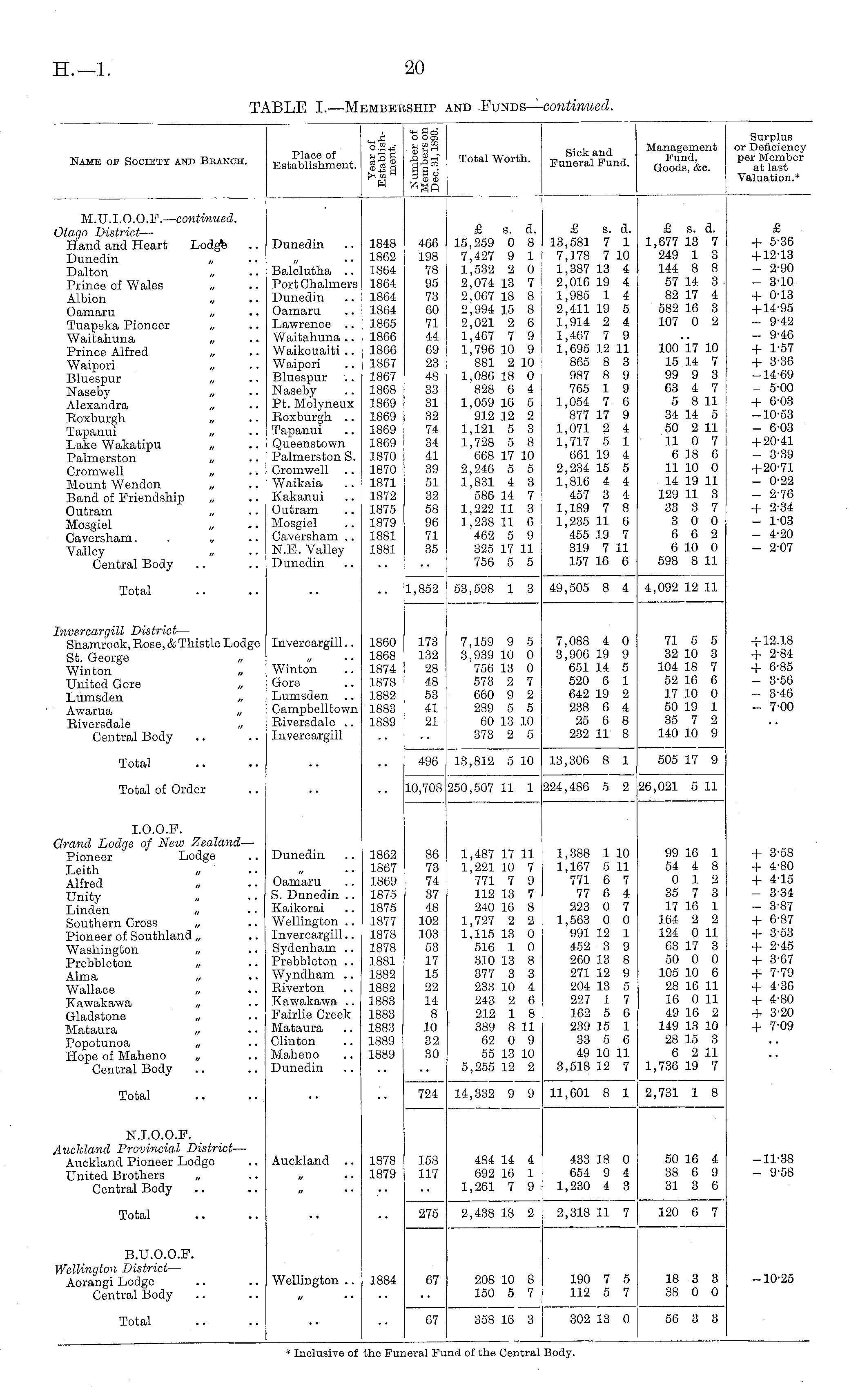 Name of Society and Bbanoh. Place of Establishment. O .r-I 4-J m H IB Total Worth. Sick and Funeral Fund. Management Fund, Goods, &c. Surplus or Deficiency per Member at last Valuation. 7 * M.U.I.O.O.F.— continued. Oiago District — Hand and Heart Lodg% Dunedin „ Dalton „ Prince of Wales „ Albion „ Oamaru „ Tuapcka Pioneer „ Waitahuna „ Prince Alfred „ Waipori „ Bluespur „ Naseby „ Alexandra „ Roxburgh „ Tapanui „ Lake Wakatipu „ Palmorston „ Cromwell „ Mount Wendon „ Band of Friendship Outram Mosgiel „ Caversham. ., Valley Central Body Dunedin Balclutha .. Port Chalmers Dunedin Oamam Lawrence .. Waitahuna .. Waikouaiti .. Waipori Bluespur Naseby Pt. Molyneux Roxburgh .. Tapanui Queenstown Palmeraton S. Cromwell Waikaia Kakanui Outram Mosgiel Caversham .. N.E. Valley Dunedin 1848 1862 1864 1864 1864 1864 1865 1866 1866 1867 1867 1868 1869 1869 1869 1869 1870 1870 1871 1872 1875 1879 1881 1881 4G6 198 78 95 73 60 71 44 69 23 48 33 31 32 74 34 41 39 51 32 58 96 71 35 £ s. d. 15,259 0 8 7,427 9 1 1,532 2 0 2,074 13 7 2,067 18 8 2,994 15 8 2,021 2 6 1,467 7 9 1,796 10 9 881 2 10 1,086 18 0 828 6 4 1,059 16 5 912 12 2 1,121 5 3 1,728 5 8 668 17 10 2,246 5 5 1,831 4 3 586 14 7 1,222 11 3 1,238 H 6 462 5 9 325 17 11 756 5 5 £ s. d. 13,581 7 1 7,178 7 10 1,387 13 4 2,016 19 4 1,985 1 4 2,411 19 5 1,914 2 4 1,467 7 9 1,695 12 11 865 8 3 987 8 9 765 1 9 1,054 7 6 877 17 9 1,071 2 4 1,717 5 1 661 19 4 2.234 15 5 1,816 4 4 457 3 4 1,189 7 8 1.235 11 6 455 19 7 319 7 11 157 16 6 £ s. d. 1,677 13 7 249 1 3 144 8 8 57 14 3 82 17 4 582 16 3 107 0 2 100 17 10 15 14 7 99 9 3 63 4 7 5 8 11 34 14 5 50 2 11 11 0 7 6 18 6 11 10 0 14 19 11 129 11 3 33 3 7 3 0 0 6 6 2 6 10 0 598 8 11 £ -f 5-36 + 12-13 - 2-90 - 3-10 + 0-13 + 14-95 - 9-42 - 9-46 + 1-57 + 3-36 -14-69 - 5-00 + 6-03 -10-53 - 6-03 + 20-41 - 3-39 + 20-71 - 0-22 - 2-76 + 2-34 - 1-03 - 4-20 - 2-07 Total 1,852 53,598 1 3 49,505 8 4 4,092 12 11 Invereargill District — Shamrock, Rose, & Thistle Lodge St. George Winton „ United Goro Lumsden „ Awarua „ Riversdale „ Central Body Invercargill.. Winton Gore Lumsden Campbell town Riversdale .. Inverc argil 1 1800 1868 1874 1878 1882 1883 1889 173 132 28 48 53 41 21 7,159 9 5 3,939 10 0 756 13 0 573 2 7 660 9 2 289 5 5 60 13 10 373 2 5 7,088 4 0 3,906 19 9 651 14 5 520 6 1 642 19 2 238 6 4 25 6 8 232 11 8 71 5 5 32 10 3 104 18 7 52 16 6 17 10 0 50 19 1 35 7 2 140 10 9 + 12.18 + 2-84 + 6-85 - 3-56 - 3-46 - 7-00 Total 496 13,812 5 10 250,507 11 1 13,306 8 1 505 17 9 Total of Order 10,708 224,486 6 2 26,021 5 11 I.O.O.F. Grand Lodge of New Zealand — Pioneer Lodge Leith Alfred Unity Linden „ Southern Cross „ Pioneer of Southland „ Washington „ Prebbloton „ Alma „ Wallace „ Kawakawa „ Gladstone „ Mataura „ Popotunoa „ Hope of Maheno „ Central Body Dunedin Oamaru S. Dunedin .. Kaikorai Wellington .. Invereargill.. Sydenham .. Prebbleton .. Wyndham .. Riverton Kawakawa .. Pairlie Creek Mataura Clinton Maheno Dunedin 1862 1867 1869 1875 1875 1877 1878 1878 1881 1882 1882 1883 1883 1883 1889 1889 86 73 74 37 48 102 103 53 17 15 22 14 8 10 32 30 1,487 17 11 1,221 10 7 771 7 9 112 13 7 240 10 8 1,727 2 2 1,115 13 0 516 1 0 310 13 8 377 3 3 233 10 4 243 2 6 212 1 8 389 8 11 G2 0 9 55 13 10 5,255 12 2 14,332 9 9 1,388 1 10 1,167 5 11 771 6 7 77 6 4 223 0 7 1,563 0 0 991 12 1 452 3 9 260 13 8 271 12 9 204 13 5 227 1 7 162 5 6 239 15 1 33 5 6 49 10 11 3,518 12 7 99 16 1 54 4 8 0 12 35 7 3 17 16 1 164 2 2 124 0 11 63 17 3 50 0 0 105 10 6 28 16 11 16 0 11 49 16 2 149 13 10 28 15 3 6 2 11 1,736 19 7 + 3-58 + 4-80 + 4-15 - 3-34 - 3-87 + 6-87 + 3-53 + 2-45 + 3-67 + 7-79 + 4-36 + 4-80 + 3-20 + 7-09 Total 724 11,601 8 1 2,731 1 8 N.I.O.O.F. Auckland Provincial District — Auckland Pioneer Lodge United Brothers „ Central Body Auckland .. 1878 1879 158 117 484 14 4 692 16 1 1,261 7 9 433 18 0 654 9 4 1,230 4 3 50 16 4 38 6 9 31 3 6 -11-38 - 9-58 Total 275 2,438 18 2 2,318 11 7 120 6 7 B.U.O.O.F. Wellington District — Aorangi Lodge Central Body Wellington .. 1884 67 208 10 8 150 5 7 190 7 5 112 5 7 18 3 3 38 0 0 -10-25 Total 67 358 16 3 302 13 0 56 3 3 * Inclusive of the Funeral Fund of tlio Central Bod;