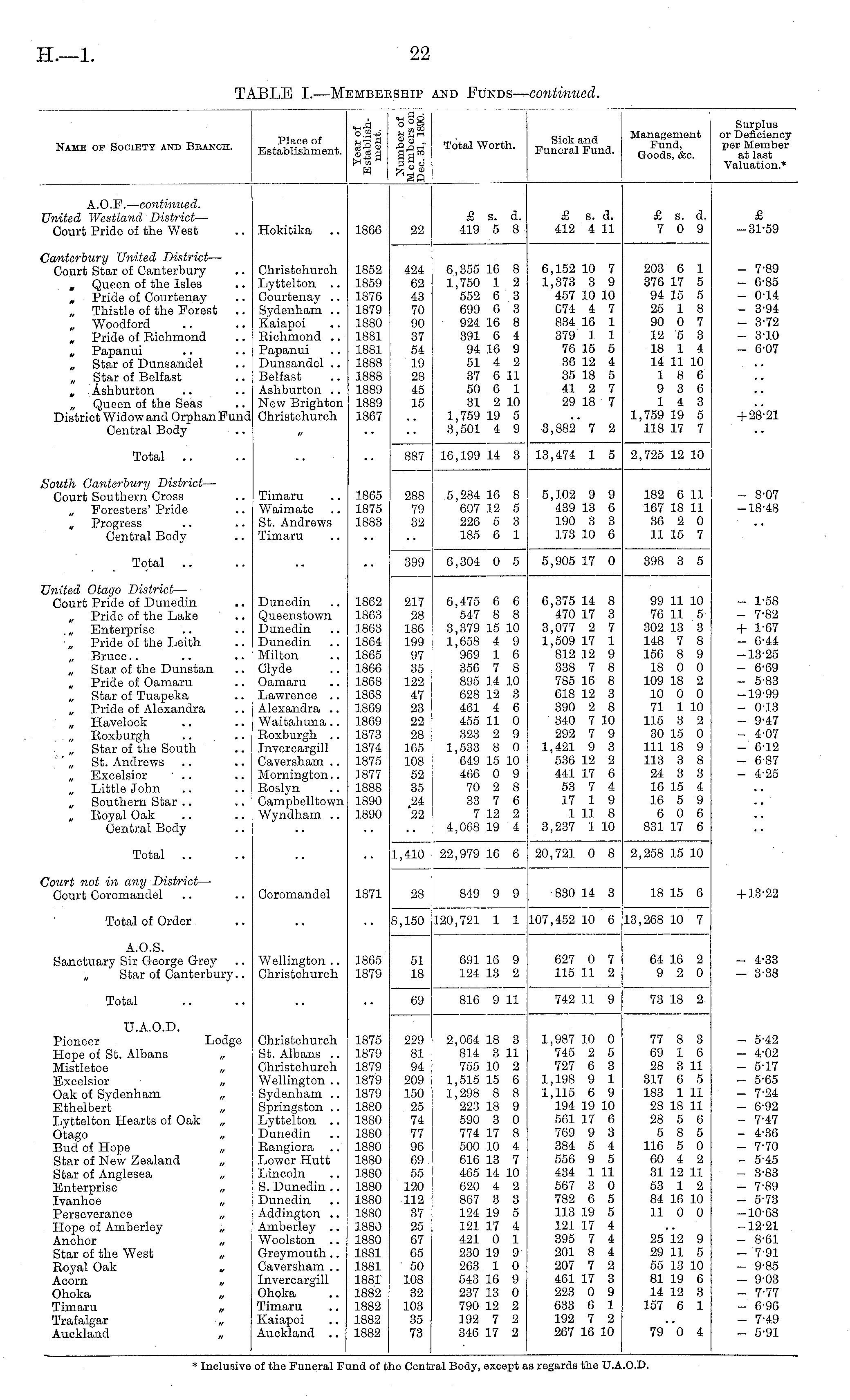 Name of Society and Branch. Place of Establishment. H ■gog Total Worth. Sick and Funeral Fund. Management Fund, Goods, &c. Surplus or Deficiency per Member at last Valuation.* A.O.F.— continued. United Westland District — Court Pride of the West £ s. d. 419 5 8 £ s. a. 412 4 11 £ s. d. 7 0 9 £ -31-59 Hokitika 1866 ■2-2 Canterbury United District — Court Star of Canterbury „ Queen of the Isles „ Pride of Courtenay „ Thistle of the "Forest .. „ Woodford „ Pride of Richmond „ Papanui „ Star of Dunsandel „ Star of Belfast „ Ashburton „ Queen of the Seas District Widow and OrphanFund Central Body Christchurch Lyttelton Courtenay .. Sydenham .. Kaiapoi Richmond .. Papanui Dunsandel .. Belfast Ashburton .. New Brighton Christchurch 1852 1859 1876 1879 1880 1881 1881 1888 1888 1889 1889 1867 424 62 43 70 90 37 54 19 28 45 15 6,355 16 8 1,750 1 2 552 6 3 699 6 3 924 16 8 391 6 4 94 16 9 51 4 2 37 6 11 50 6 1 31 2 10 1,759 19 5 3,501 4 9 6,152 10 7 1,373 3 9 457 10 10 074 4 7 834 16 1 379 1 1 76 15 5 36 12 4 35 18 5 41 2 7 29 18 7 203 6 1 376 17 5 94 15 5 25 1 8 90 0 7 12 '8 3 18 1 4 14 11 10 18 6 9 3 6 14 3 1,759 19 5 118 17 7 - 7-89 - 6-85 - 0-14 - 3-94 - 3-72 - 3-10 - 6-07 3,882' 7 2 + 28-21 Total 887 16,199 14 3 13,474 1 5 2,725 12 10 South Canterbury District — Court Southern Cross „ Foresters' Pride „ Progress Central Body Timaru Waimate St. Andrews Timaru 1865 1875 1883 182 6 11 167 18 11 36 2 0 11 15 7 - 8-07 -18-48 288 79 32 5,284 16 8 607 12 5 226 5 3 185 6 1 5,102 9 9 439 13 6 190 3 3 173 10 6 Total 399 6,304 0 5 5,905 17 0 398 3 5 - 1-58 - 7-82 + 1-67 - 6-44 -13-25 - 6-69 - 5-83 -19-99 - 013 - 9-47 - 4-07 - 6-12 - 6-87 - 4-25 United Otago District — Court Pride of Dunedin „ Pride of the Lake .„ Enterprise „ Pride of the Leith „ Bruce.. „ Star of the Dunstan „ Pride of Oamaru „ Star of Tuapeka „ Pride of Alexandra „ Havelock „ Roxburgh . „ Star of the South * „ St. Andrews „ Excelsior • .. „ Little John „ Southern Star .. „ Royal Oak Central Body Dunedin Queenstown Dunedin Dunedin Milton Clyde Oamaru Lawrence .. Alexandra .. Waitalmna .. Roxburgh .. Invercargill Caversham .. Mornington.. Roslyn Campbelltown Wyndham .. 1862 1863 1863 1864 1865 1866 1868 18G8 1869 1869 1873 1874 1875 1877 1888 1890 1890 217 28 186 199 97 35 122 47 23 22 28 165 108 52 35 ,24 22 6,475 6 6 547 8 8 3,379 15 10 1,658 4 9 969 1 6 356 7 8 895 14 10 028 12 3 461 4 6 455 11 0 323 2 9 1,533 8 0 649 15 10 466 0 9 70 2 8 33 7 6 7 12 2 4,068 19 4 6,375 14 8 470 17 3 3,077 2 7 1,509 17 1 812 12 9 338 7 8 785 16 8 018 12 3 390 2 8 340 7 10 292 7 9 1,421 9 8 536 12 2 441 17 6 53 7 4 17 1 9 1 11 8 3,237 1 10 99 11 10 76 11 5 302 13 3 148 7 8 156 8 9 18 0 0 109 18 2 10 0 0 71 1 10 115 3 2 30 15 0 111 18 9 113 3 8 24 3 3 16 15 4 16 5 9 6 0 6 831 17 6 Total 1,410 22,979 16 6 20,721 0 8 2,258 15 10 Court not in any District — Court Corom&ndel Coromandel 1871 28 849 9 9 •830 14 3 18 15 6 + 13-22 Total of Order 8,150 120,721 1 1 107,452 10 6 13,268 10 7 A.O.S. Sanctuary Sir George Grey „ Star of Canterbury.. Wellington .. Christchurch 1865 1879 51 18 691 16 9 124 13 2 627 0 7 115 11 2 64 16 2 9 2 0 - 4-33 - 3-38 Total 69 816 9 11 742 11 9 73 18 2 U.A.O.D. Pioneer Lodge Hope of St. Albans „ Mistletoe „ Excelsior „ Oak of Sydenham „ Ethelbert Lyttelton Hearts of Oak „ Otago Bud of Hope „ Star of New Zealand Star of Anglesea „ Enterprise „ Ivanhoe „ Perseverance „ Hope of Amberley „ Anchor „ Star of the West Royal Oak „ Acorn „ Ohoka „ Timaru „ Trafalgar „ Auckland „ Christchurch St. Albans .. Christchurch Wellington .. Sydenham .. Springston .. Lyttelton .. Dunedin Rangiora Lower Hutt Lincoln S. Dunedin .. Dunedin Addington .. Amberley .. Woolston .. Greymouth .. Caversham .. Invercargill Ohoka Timaru Kaiapoi Auckland .. 1875 1879 1879 1879 1879 1880 1880 1880 1880 1880 1880 1880 1880 1880 1880 1880 1881 1881 1881 1882 1882 1882 1882 229 81 94 209 150 25 74 77 96 69 55 120 112 37 25 67 65 50 108 32 103 35 73 2,064 18 3 814 3 11 755 10 2 1,515 15 6 1,298 8 8 223 18 9 590 3 0 774 17 8 500 10 4 616 13 7 465 14 10 620 4 2 867 3 3 124 19 5 121 17 4 421 0 1 230 19 9 263 1 0 543 16 9 237 13 0 790 12 2 192 7 2 346 17 2 1,987 10 0 745 2 5 727 6 3 1,198 9 1 1,115 6 9 194 19 10 561 17 6 769 9 3 384 5 4 556 9 5 434 1 11 567 3 0 782 6 5 113 19 5 121 17 4 395 7 4 201 8 4 207 7 2 461 17 3 223 0 9 633 6 1 192 7 2 267 16 10 77 8 3 69 1 6 28 3 11 317 6 5 183 1 11 28 18 11 28 5 6 5 8 5 116 5 0 60 4 2 31 12 11 53 1 2 84 16 10 11 0 0 - 5-42 - 4-02 - 5-17 - 5-65 - 7-24 - 6-92 - 7-47 - 4-36 - 7-70 - 5-45 - 3-83 - 7-89 - 5-73 -10-68 -12-21 - 8-61 - 7-91 - 9-85 - 903 - 7-77 - 6-96 - 7-49 - 5-91 25 12 9 29 11 5 55 13 10 81 19 6 14 12 3 157 6 1 79 0 4 * Inclusive of tho Funeral Fund of the Central Body, except as regards the U.A.O.D.