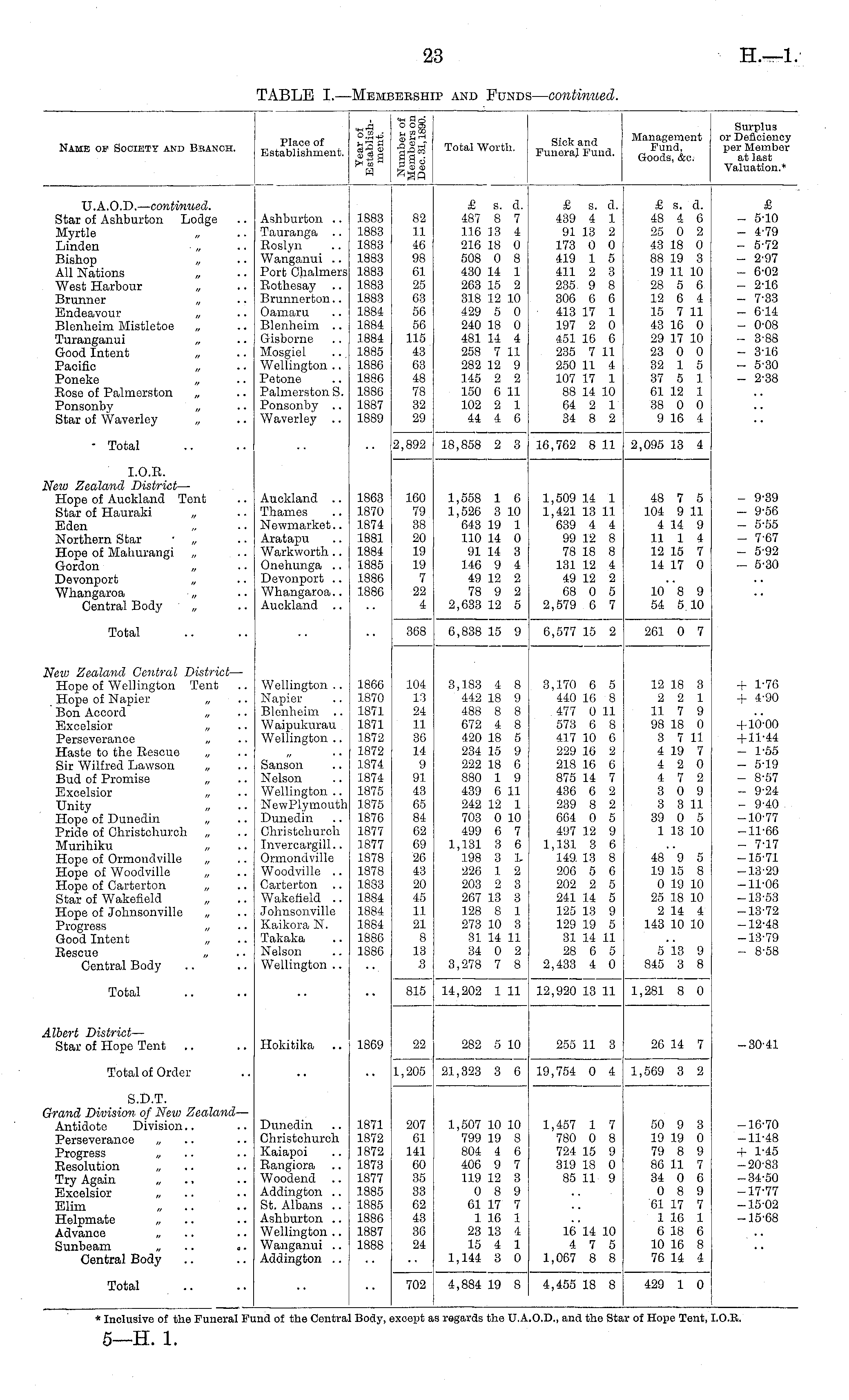 Name op Society and Branch. Place of Establishment. H •3S8 111 Total Worth. ! Sick and Management Funeral Funa. Go ™<&c. Surplus or Deficiency per Member at last Valuation.* U.A.O.D. — continued. Star of Ashburton Lodge Myrtle Linden „ Bishop „ All Nations West Harbour „ Brunner „ Endeavour Blenheim Mistletoe Turanganui „ Good Intent „ Pacific „ Poneke „ Bose of Palmerston „ Ponsonby Star of Waverley „ Ashburton .. Tauranga Roslyn Wanganui .. Port Chalmers Rothesay Brunnorton.. Oamaru Blenheim .. Gisbornc Mosgiel Wellington .. Potone Palmerston S. Ponsonby Waverley 1883 1883 1883 1883 1883 1883 1883 1884 1884 1884 1885 1886 1886 1886 1887 1889 82 11 46 98 61 25 63 56 56 115 43 63 48 78 32 29 £ s. d. 487 8 7 116 13 4 216 18 0 508 0 8 430 14 1 263 15 2 318 12 10 429 5 0 240 18 0 481 14 4 258 7 11 282 12 9 145 2 2 150 6 11 102 2 1 44 4 6 £ s. d. 439 4 1 91 13 2 173 0 0 419 1 5 411 2 3 235 9 8 306 6 6 413 17 1 197 2 0 451 16 6 235 7 11 250 11 4 107 17 1 88 14 10 04 2 1 34 8 2 £ s. d. 48 4 6 25 0 2 43 18 0 88 19 3 19 11 10 28 5 6 12 0 4 15 7 11 43 16 0 29 17 10 23 0 0 32 1 5 37 5 1 61 12 1 38 0 0 9 16 4 £ - 5-10 - 4-79 - 5-72 - 2-97 - 6-02 - 2-16 - 7-33 - 6-14 - 0-08 - 3-88 - 316 - 5-30 - 2-38 - Total 2,892 18,858 2 3 16,762 8 11 2,095 13 4 I.O.R. few Zealand District — Hope of Auckland Tent Star of Hauraki „ Eden Northern Star „ Hope of Mahurangi Gordon „ Devonport „ Whangaroa „ Central Body „ Auckland .. Thames Newmarket.. Aratapu Warkworth.. Onehunga .. Devonport .. Whangaroa.. Auckland 1863 1870 1874 1881 1884 1885 1886 1886 160 79 38 20 19 19 7 22 4 1,558 1 6 1,526 3 10 643 19 1 110 14 0 91 14 3 146 9 4 49 12 2 78 9 2 2,633 12 5 1,509 14 1 1,421 13 11 639 4 4 99 12 8 78 18 8 131 12 4 49 12 2 68 0 5 2,579 6 7 48 7 5 104 9 11 4 14 9 11 1 4 12 15 7 14 17 0 - 9-39 - 9-56 - 5-55 - 7-67 - 5-92 - 5-30 10 8 9 54 5 10 Total 368 6,838 15 9 6,577 15 2 201 0 7 Sfew Zealand Central District — Hope of Wellington Tent Hope of Napier „ Bon Accord „ Excelsior „ Perseverance „ Haste to the Rescue Sir Wilfred Lawson „ Bud of Promise Excelsior „ Unity Hope of Dunedin „ Pride of Christchurch Murihiku „ Hope of Ormondville „ Hope of Woodville Hope of Carterton „ Star of Wakefield Hope of Johnsonville „ Progress „ Good Intent „ Rescue „ Central Body Wellington .. Napier Blenheim Waipukurau Wellington .. + 1-70 + 4-90 Sanson Nelson Wellington .. NewPlymouth Dunedin Ghristchurch Invercargill.. Ormondville Woodville .. Carterton Wakefield .. Johnsonville Kaikora N. Takaka Nelson Wellington .. 1866 1870 1871 1871 1872 1872 1874 1874 1875 1875 1876 1877 1877 1878 1878 1883 1884 1884 1884 1886 1886 104 13 24 11 36 14 9 91 43 65 84 62 69 26 43 20 45 11 21 8 13 .3 3,183 4 8 442 18 9 488 8 8 672 4 8 420 18 5 : 234 15 9 222 18 6 880 1 9 439 6 11 242 12 1 703 0 10 499 6 7 1,131 3 6 198 3 1 226 1 2 203 2 3 207 13 3 128 8 1 273 10 3 31 14 11 ! 34 0 2 3,278 7 8 3,170 0 5 440 16 8 477 0 11 573 6 8 417 10 6 229 16 2 218 16 6 875 14 7 436 C 2 239 8 2 664 0 5 497 12 9 1,181 3 6 149. 13 8 206 5 6 202 2 5 241 14 5 125 13 9 129 19 5 31 14 11 28 6 5 2,433 4 0 12 18 3 2 2 1 11 7 9 98 18 0 3 7 11 4 19 7 4 2 0 4 7 2 j 3 0 9 3 3 11 39 0 5 1 13 10 + 10-00 + 11-44 - 1-55 - 5-19 - 8-57 - 9-24 - 9-40 -10-77 -11-66 - 7-17 -15-71 -13-29 -11-06 -13-53 -13-72 -12-48 -13-79 - 8-58 48 9 5 19 15 8 0 19 10 25 18 10 2 14 4 143 10 10 5 13 9 845 3 8 Total 815 14,202 1 11 12,920 13 11 1,281 8 0 llbert District — Star of Hope Tent Hokitika 1869 22 282 5 10 255 11 3 26 14 7 -30-41 Total of Order 1,205 21,323 3 6 19,754 0 4 1,569 3 2 S.D.T. rrand Division of New Zealand — Antidote Division Perseverance „ Progress „ Resolution „ Try Again Excelsior „ Elim Helpmate Advance „ Sunbeam „ .. <. Central Body Dunedin Christchurch Kaiapoi Rangiora Woodend Addington .. St. Albans .. Ashburton .. Wellington .. Wanganui .. Addington .. 1871 1872 1872 1873 1877 1885 1885 1886 1887 1888 207 61 141 60 35 33 62 43 36 24 1,507 10 10 799 19 8 804 4 6 406 9 7 119 12 3 0 8 9 CI 17 7 1 16 1 23 13 4 15 4 1 1,144 3 0 1,457 1 7 780 0 8 724 15 9 319 18 0 85 11 9 50 9 3 19 19 0 79 8 9 86 11 7 34 0 0 0 8 9 01 17 7 1 1C 1 6 18 6 10 16 8 76 14 4 -16-70 -11-48 + 1-45 -20-83 -34-50 -17-77 -15-02 -15-68 16 14 10 4 7 5 1,067 8 8 Total 702 4,884 19 8 4,455 18 8 429 1 0 * Inclusive of the Funeral Funa ol the Central Boay, except as regards the U.A.O.D., ana the Star ot Hope Tent, I.O.E.