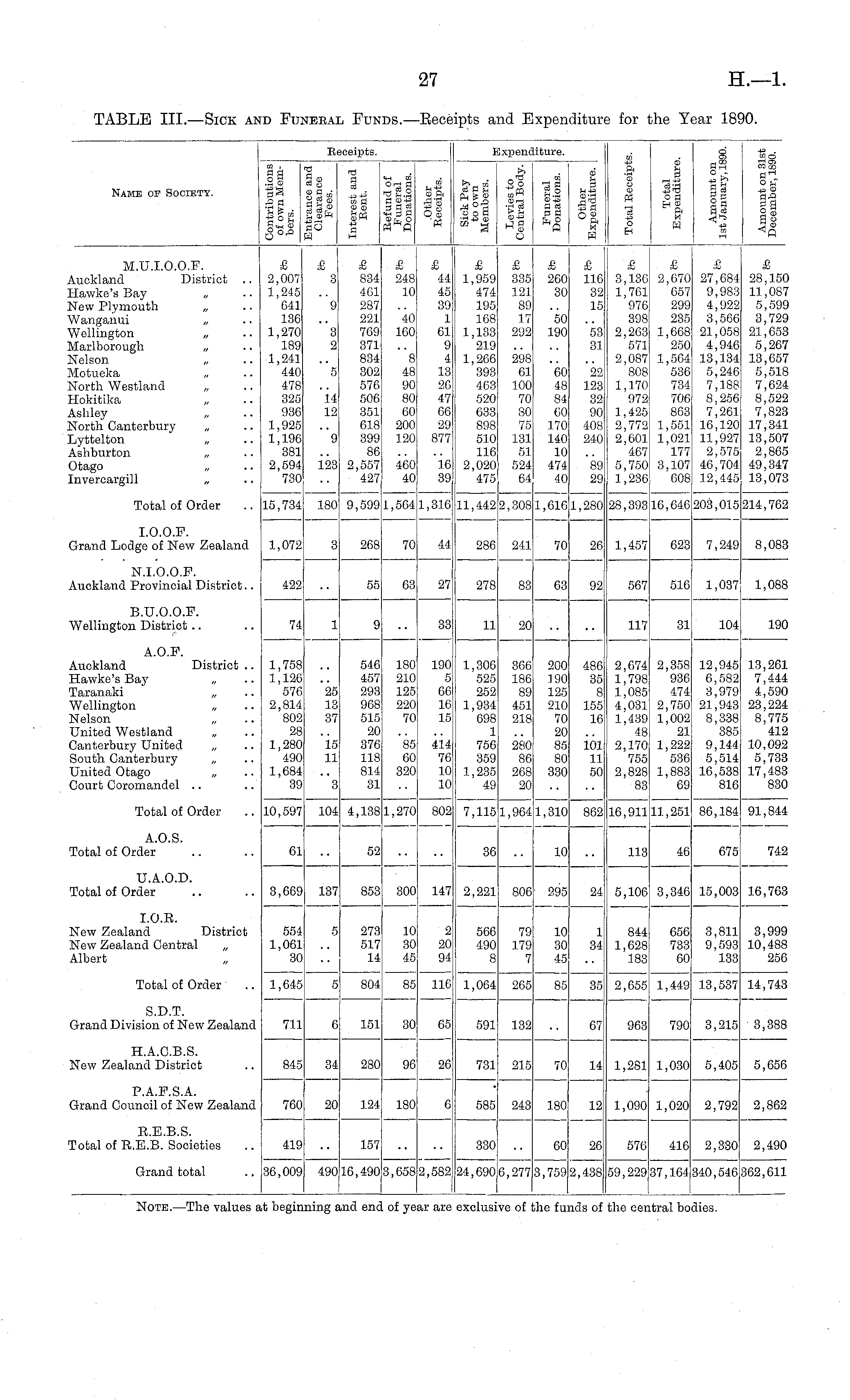 TABLE III.—Sick and Funeral Funds.—Receipts and Expenditure for the Year 1890.