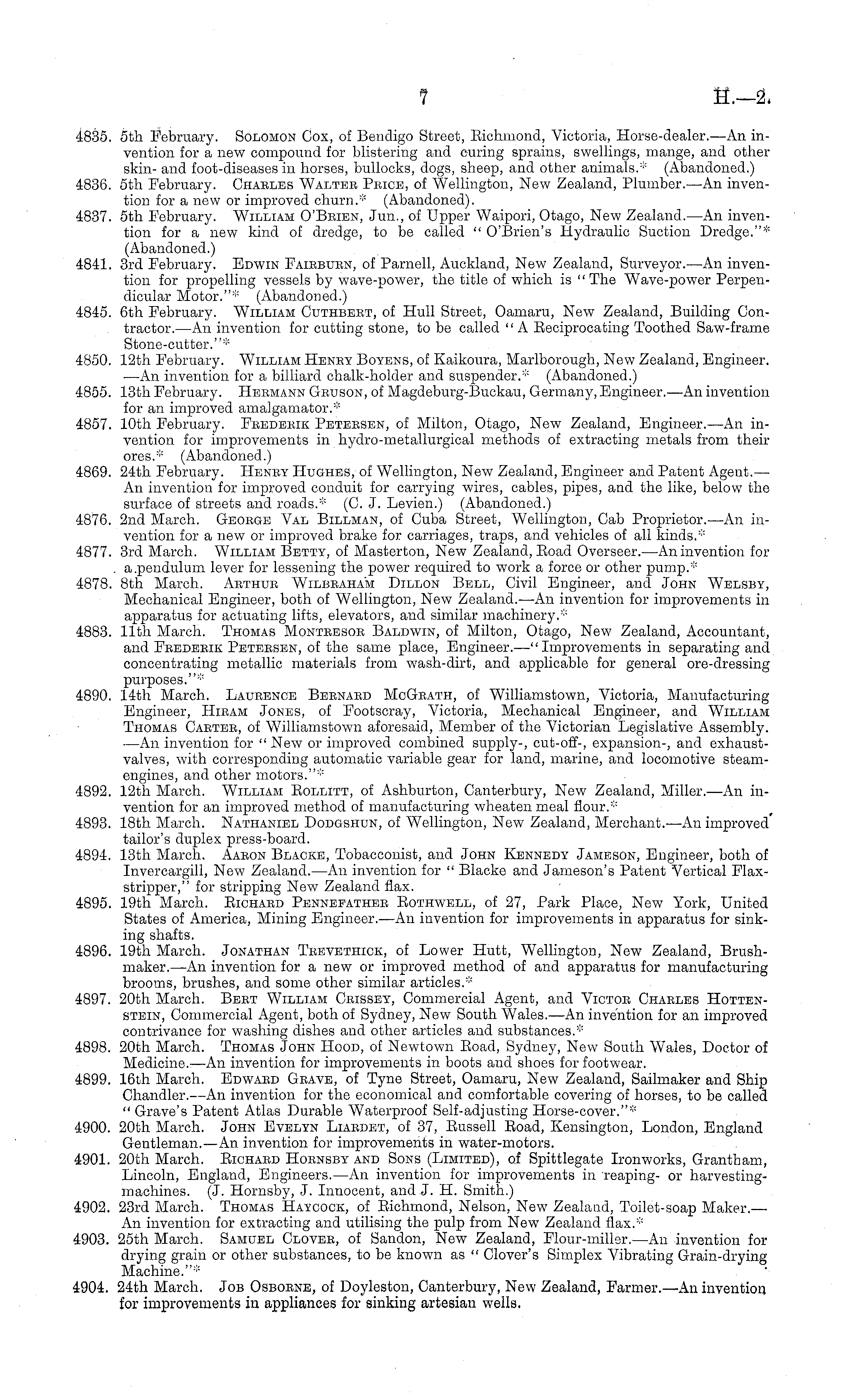 4835. sth February. Solomon Cox, of Beudigo Street, Richmond, Victoria, Horse-dealer.—An invention for a new compound for blistering and curing sprains, swellings, mange, and other skin- and foot-diseases in horses, bullocks, dogs, sheep, and other animals.* (Abandoned.) 4836. sth February. Charles "Walter Price, of Wellington, New Zealand, Plumber. —An invention for a new or improved churn.* (Abandoned). 4837. sth February. William O'Brien, Jun., of Upper Waipori, Otago, New Zealand.—An invention for a new kind of dredge, to be called " O'Brien's Hydraulic Suction Dredge."* (Abandoned.) 4841. 3rd February. Edwin Fairburn, of Parnell, Auckland, New Zealand, Surveyor. —An invention for propelling vessels by wave-power, the title of which is "The Wave-power Perpendicular Motor."* (Abandoned.) 4845. 6th February. William Cuthbert, of Hull Street, Oamaru, New Zealand, Building Contractor. —An invention for cutting stone, to be called "A Reciprocating Toothed Saw-frame Stone-cutter."* 4850. 12th February. William Henry Boyens, of Kaikoura, Marlborough, New Zealand, Engineer. —An invention for a billiard chalk-holder and suspender.* (Abandoned.) 4855. 13th February. Hermann Gruson, of Magdeburg-Buckau, Germany, Engineer.—An invention for an improved amalgamator.* 4857. 10th February. Frederik Petersen, of Milton, Otago, New Zealand, Engineer.—An invention for improvements in hydro-metallurgical methods of extracting metals from their ores.* (Abandoned.) 4869. 24th February. Henry Hughes, of Wellington, New Zealand, Engineer and Patent Agent.— An invention for improved conduit for carrying wires, cables, pipes, and the like, below the surface of streets and roads.* (0. J. Levien.) (Abandoned.) 4876. 2nd March. George Val Billman, of Cuba Street, Wellington, Cab Proprietor.—An invention for a new or improved brake for carriages, traps, and vehicles of all kinds.* 4877. 3rd March. William Betty, of Masterton, New Zealand, Road Overseer.—An invention for . a.pendulum lever for lessening the power required to work a force or other pump.* 4878. Bth March. Arthur Wilbraha'm Dillon Bell, Civil Engineer, and John Welsby, Mechanical Engineer, both of Wellington, New Zealand.—An invention for improvements in apparatus for actuating lifts, elevators, and similar machinery.* 4883. 11th March. Thomas Montresor Baldwin, of Milton, Otago, New Zealand, Accountant, and Frederik Petersen, of the same place, Engineer.—"lmprovements in separating and concentrating metallic materials from wash-dirt, and applicable for general ore-dressing purposes."* 4890. 14th March. Laurence Bernard McGrath, of Williamstown, Victoria, Manufacturing Engineer, Hiram Jones, of Footscray, Victoria, Mechanical Engineer, and William Thomas Caetee, of Williainstown aforesaid, Member of the Victorian Legislative Assembly. —An invention for " New or improved combined supply-, cut-off-, expansion-, and exhaustvalves, with corresponding automatic variable gear for land, marine, and locomotive steamengines, and other motors."* 4892. 12th March. William Rollitt, of Ashburton, Canterbury, New Zealand, Miller.—An invention for an improved method of manufacturing wheaten meal flour.* 4893. 18th March. Nathaniel Dodgshun, of Wellington, New Zealand, Merchant.—An improved tailor's duplex press-board. 4894. 13th March. Aaron Blacke, Tobacconist, and John Kennedy Jameson, Engineer, both of Invercargill, New Zealand.—An invention for " Blacke and Jameson's Patent Vertical Flaxstripper," for stripping New Zealand flax. 4895. 19th March. Richard Pennefather Rothwell, of 27, Park Place, New York, United States of America, Mining Engineer.—An invention for improvements in apparatus for sinking shafts. 4896. 19th March. Jonathan Teevethick, of Lower Hutt, Wellington, New Zealand, Brushmaker.—An invention for a new or improved method of and apparatus for manufacturing brooms, brushes, and some other similar articles.* 4897. 20th March. Bert William Crissey, Commercial Agent, and Victor Charles Hottenstein, Commercial Agent, both of Sydney, New South Wales.—An invention for an improved contrivance for washing dishes and other articles and substances.* 4898. 20th March. Thomas John Hood, of Newtown Road, Sydney, New South Wales, Doctor of Medicine.—An invention for improvements in boots and shoes for footwear. 4899. 16th March. Edward Grave, of Tyne Street, Oamaru, New Zealand, Sailmaker and Ship Chandler.—An invention for the economical and comfortable covering of horses, to be called " Grave's Patent Atlas Durable Waterproof Self-adjusting Horse-cover."* 4900. 20th March. John Evelyn Liardet, of 37, Russell Road, Kensington, London, England Gentleman. —An invention for improvements in water-motors. 4901. 20th March. Richard Hornsby and Sons (Limited), of Spittlegate Ironworks, Grantham, Lincoln, England, Engineers. —An invention for improvements in reaping- or harvestingmachines. (J. Hornsby, J. Innocent, and J. H. Smith.) 4902. 23rd March. Thomas Haycock, of Richmond, Nelson, New Zealand, Toilet-soap Maker.—■ An invention for extracting and utilising the pulp from New Zealand flax.* 4903. 25th March. Samuel Clovee, of Sandon, New Zealand, Flour-miller.—An invention for drying grain or other substances, to be known as " Clover's Simplex Vibrating Grain-drying Machine."* 4904. 24th March. Job Osborne, of Doyleston, Canterbury, New Zealand, Farmer.—An invention for improvements in appliances for sinking artesian wells.