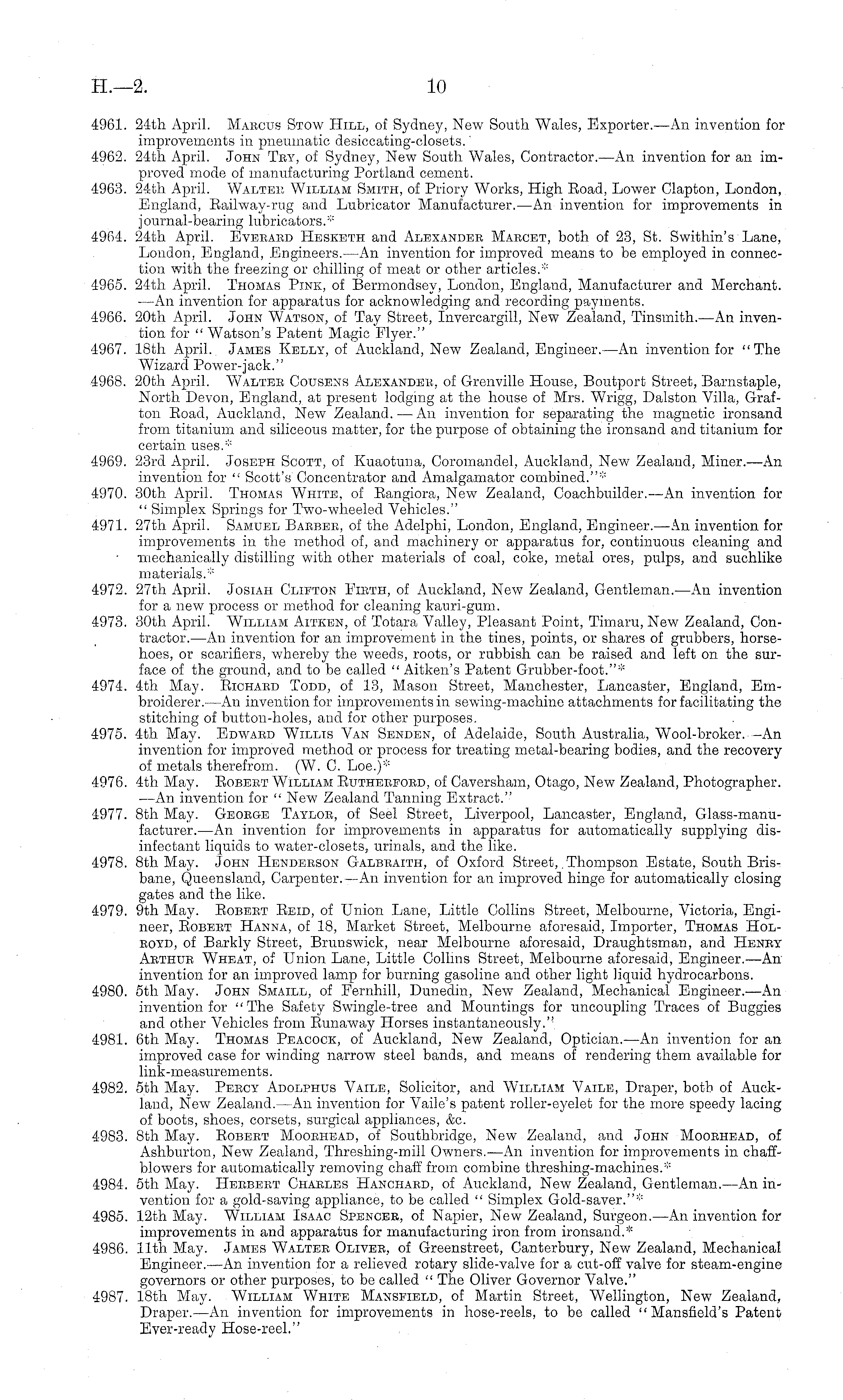 4961. 24th April. Marcus Stow Hill, of Sydney, New South Wales, Exporter.—An invention for improvements in pneumatic desiccating-closets." 4962. 24th April. John Try, of Sydney, New South Wales, Contractor.—An invention for an improved mode of manufacturing Portland cement. 4963. 24th April. Waltee William Smith, of Priory Works, High Eoad, Lower Clapton, London, England, Eailway-rug and Lubricator Manufacturer. —An invention for improvements in journal-bearing lubricators/ 4964. 24th April. Everard Hesketh and Alexander Maroet, both of 23, St. Swithin's Lane, London, England, Engineers. —An invention for improved means to be employed in connection with the freezing or chilling of meat or other articles.* 4965. 24th April. Thomas Pink, of Bermondsey, London, England, Manufacturer and Merchant. —An invention for apparatus for acknowledging and recording payments. 4966. 20th April. John Watson, of Tay Street, Invercargill, New Zealand, Tinsmith.—An invention for " Watson's Patent Magic Flyer." 4967. 18th April. James Kelly, of Auckland, New Zealand, Engineer. —An invention for "The Wizard Power-jack." 4968. 20th April. "Waltee Cousens Alexander, of Grenville House, Boutport Street, Barnstaple, North Devon, England, at present lodging at the house of Mrs. Wrigg, Dalston Villa, Grafton Eoad, Auckland, New Zealand. —An invention for separating the magnetic ironsand from titanium and siliceous matter, for the purpose of obtaining the ironsand and titanium for certain uses.* 4969. 23rd April. Joseph Scott, of Kuaotuna, Coromandel, Auckland, New Zealand, Miner.—An invention for " Scott's Concentrator and Amalgamator combined."* 4970. 30th April. Thomas White, of Eangiora, New Zealand, Coachbuilder.—An invention for " Simplex Springs for Two-wheeled Vehicles." 4971. 27th April. Samuel Barber, of the Adelphi, London, England, Engineer.—An invention for improvements in the method of, and machinery or apparatus for, continuous cleaning and mechanically distilling with other materials of coal, coke, metal ores, pulps, and suchlike materials.* 4972. 27th April. Jobiah Clifton Fieth, of Auckland, New Zealand, Gentleman. —An invention for a new process or method for cleaning kauri-gum. 4973. 30th April. William Aitken, of Totara Valley, Pleasant Point, Timaru, New Zealand, Contractor.—An invention for an improvement in the tines, points, or shares of grubbers, horsehoes, or scarifiers, whereby the weeds, roots, or rubbish can be raised and left on the surface of the ground, and to be called " Aitken's Patent Grubber-foot."* 4974. 4th May. Bichard Todd, of 13, Mason Street, Manchester, Lancaster, England, Embroiderer. —An invention for improvements in sewing-machine attachments for facilitating the stitching of button-holes, and for other purposes. 4975. 4th May. Edward Willis Van Senden, of Adelaide, South Australia, Wool-broker. -An invention for improved method or process for treating metal-bearing bodies, and the recovery of metals therefrom. (W. C. Loe.)* 4976. 4th May. Eobbet William Eutherford, of Caversham, Otago, Now Zealand, Photographer. —An invention for " New Zealand Tanning Extract." 4977. Bth May. George Taylor, of Seel Street, Liverpool, Lancaster, England, Glass-manu-facturer. —An invention for improvements in apparatus for automatically supplying disinfectant liquids to water-closets, urinals, and the like. 4978. Bth May. John Henderson Galbraith, of Oxford Street, Thompson Estate, South Brisbane, Queensland, Carpenter.—An invention for an improved hinge for automatically closing gates and the like. 4979. 9th May. Eobbet Eeid, of Union Lane, Little Collins Street, Melbourne, Victoria, Engineer, Eobert Hanna, of 18, Market Street, Melbourne aforesaid, Importer, Thomas Holsoyd, of Barkly Street, Brunswick, near Melbourne aforesaid, Draughtsman, and Henry Arthur. Wheat, of Union Lane, Little Collins Street, Melbourne aforesaid, Engineer.—An invention for an improved lamp for burning gasoline and other light liquid hydrocarbons. 4980. sth May. John Smaill, of Fernhill, Dunedin, New Zealand, Mechanical Engineer.—An invention for "The Safety Swingle-tree and Mountings for uncoupling Traces of Buggies and other Vehicles from Eunaway Horses instantaneously." 4981. 6th May. Thomas Peacock, of Auckland, New Zealand, Optician.—An invention for an improved case for winding narrow steel bands, and means of rendering them available for link-measurements. 4982. sth May. Peecy Adolphus Vaile, Solicitor, and William Vaile, Draper, both of Auckland, New Zealand. —An invention for Vaile's patent roller-eyelet for the more speedy lacing of boots, shoes, corsets, surgical appliances, &c. 4983. Bth May. Eobert Moorhead, of Southbridge, New Zealand, and John Mooehead, of Ashburton, New Zealand, Threshing-mill Owners. —An invention for improvements in chaffblowers for automatically removing chaff from combine threshing-machines.* 4984. sth May. Herbert Charles Hanchard, of Auckland, New Zealand, Gentleman.—An invention for a gold-saving appliance, to be called " Simplex Gold-saver."* 4985. 12th May. William Isaac Spencer, of Napier, New Zealand, Surgeon.—An invention for improvements in and apparatus for manufacturing iron from ironsand.* 4986. 11th May. James Waltee Olivbe, of Greenstreet, Canterbury, New Zealand, Mechanical Engineer. —An invention for a relieved rotary slide-valve for a cut-off valve for steam-engine governors or other purposes, to be called " The Oliver Governor Valve." 4987. 18th May. William White Mansfield, of Martin Street, Wellington, New Zealand, Draper.—An invention for improvements in hose-reels, to be called "Mansfield's Patent Ever-ready Hose-reel."
