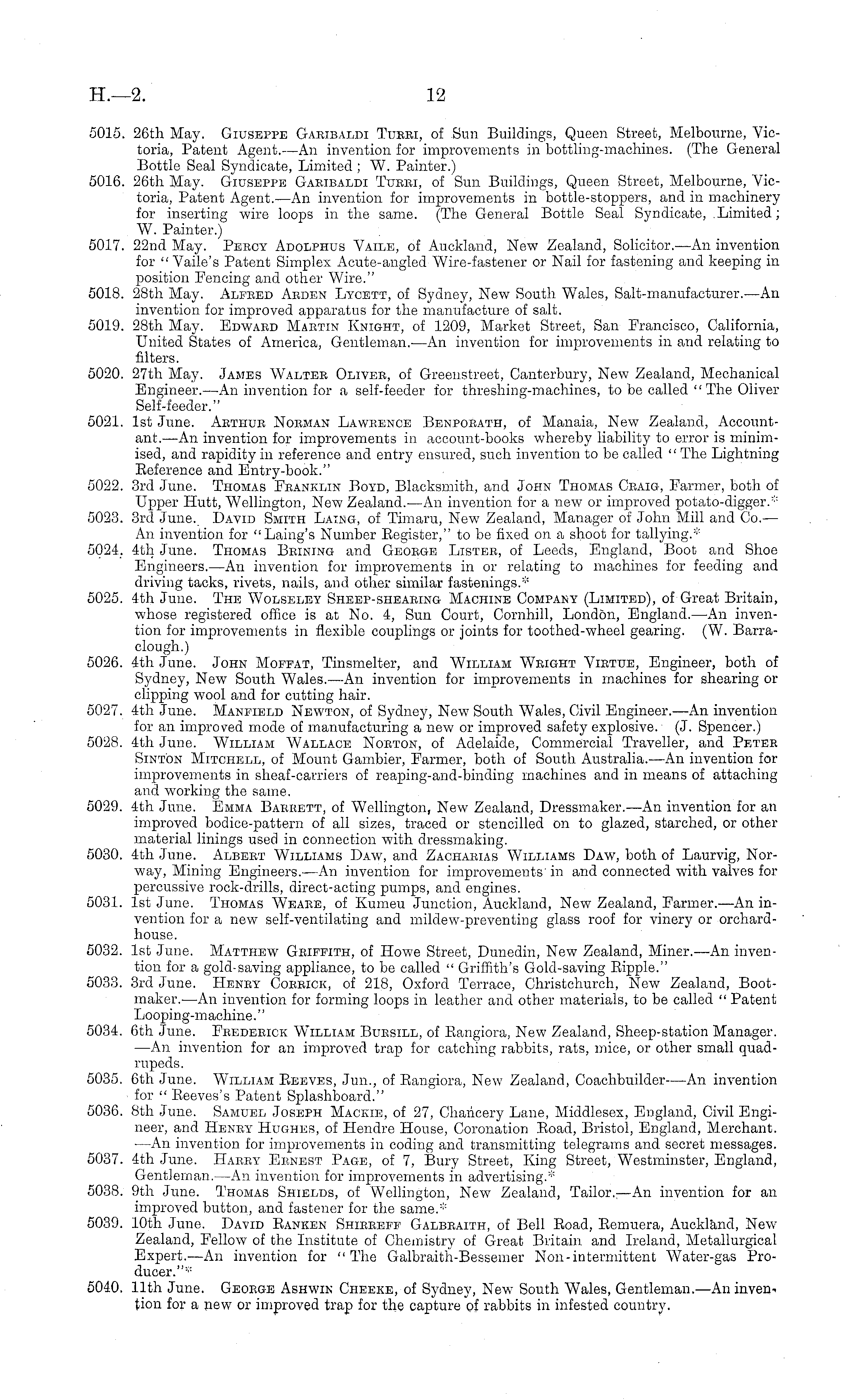 5015. 26th May. Giuseppe Garibaldi Tubri, of Sun Buildings, Queen Street, Melbourne, Victoria, Patent Agent.—An invention for improvements in bottling-machines. (The General Bottle Seal Syndicate, Limited ; W. Painter.) 5016. 26th May. Giuseppe Gabibaldi Tubbi, of Sun Buildings, Queen Street, Melbourne, Victoria, Patent Agent.—An invention for improvements in bottle-stoppers, and in machinery for inserting wire loops in the same. (The General Bottle Seal Syndicate, Limited; W. Painter.) 5017. 22nd May. Pebcy Adolphus Vaile, of Auckland, New Zealand, Solicitor. —An invention for " Vaile's Patent Simplex Acute-angled Wire-fastener or Nail for fastening and keeping in position Fencing and other Wire." 5018. 28th May. Alfred Aeden Lycett, of Sydney, New South Wales, Salt-manufacturer. —An invention for improved apparatus for the manufacture of salt. 5019. 28th May. Edwabd Martin Knight, of 1209, Market Street, San Francisco, California, United States of America, Gentleman.—An invention for improvements in and relating to filters. 5020. 27th May. James Walter Oliveb, of Greeustreet, Canterbury, New Zealand, Mechanical Engineer.—An invention for a self-feeder for threshing-machines, to be called "The Oliver Self-feeder." 5021. Ist June. Abthue Noeman Lawrence Benporath, of Manaia, New Zealand, Accountant. —An invention for improvements in account-books whereby liability to error is minimised, and rapidity in reference and entry ensured, such invention to be called " The Lightning Reference and Entry-book." 5022. 3rd June. Thomas Franklin Boyd, Blacksmith, and John Thomas Cbaig, Farmer, both of Upper Hutt, Wellington, New Zealand. —An invention for a new or improved potato-digger.* 5023. 3rd June. David Smith Laing, of Timaru, New Zealand, Manager of John Mill and Co. — An invention for "Laing's Number Register," to be fixed on a shoot for tallying.* 5024. 4th June. Thomas Brining and George Listee, of Leeds, England, Boot and Shoe Engineers.—An invention for improvements in or relating to machines for feeding and driving tacks, rivets, nails, and other similar fastenings.* 5025. 4th June. The Wolseley Sheep-sheaeing Machine Company (Limited), of Great Britain, whose registered office is at No. 4, Sun Court, Cornhill, London, England.—An invention for improvements in flexible couplings or joints for toothed-wheel gearing. (W. Barraclough.) 5026. 4th June. John Moffat, Tinsmelter, and William Wright Vietue, Engineer, both of Sydney, New South Wales.—An invention for improvements in machines for shearing or clipping wool and for cutting hair. 5027. 4th June. Manfield Newton, of Sydney, New South Wales, Civil Engineer.—An invention for an improved mode of manufacturing a new or improved safety explosive. (J. Spencer.) 5028. 4th June. William Wallace Norton, of Adelaide, Commercial Traveller, and Peteb Sinton Mitchell, of Mount Gambier, Farmer, both of South Australia.—An invention for improvements in sheaf-carriers of reaping-and-binding machines and in means of attaching and working the same. 5029. 4th June. Emma Baeeett, of Wellington, New Zealand, Dressmaker.—An invention for an improved bodice-pattern of all sizes, traced or stencilled on to glazed, starched, or other material linings used in connection with dressmaking. 5030. 4th June. Albert Williams Daw, and Zachaeias Williams Daw, both of Laurvig, Norway, Mining Engineers.—An invention for improvements in and connected with valves for percussive rock-drills, direct-acting pumps, and engines. 5031. Ist June. Thomas Weare, of Kumeu Junction, Auckland, New Zealand, Farmer. —An invention for a new self-ventilating and mildew-preventing glass roof for vinery or orchardhouse. 5032. Ist June. Matthew Gbiffith, of Howe Street, Dunedin, New Zealand, Miner.—An invention for a gold-saving appliance, to be called " Griffith's Gold-saving Eipple." 5033. 3rd June. Heney Cobbick, of 218, Oxford Terrace, Christchurch, New Zealand, Bootmaker.—An invention for forming loops in leather and other materials, to be called " Patent Looping-machine." 5034. 6th June. Feedeeick W t illiam Buesill, of Eangiora, New Zealand, Sheep-station Manager. —An invention for an improved trap for catching rabbits, rats, mice, or other small quadrupeds. 5035. 6th June. William Reeves, Jim., of Rangiora, New Zealand, Coachbuilder —An invention for " Reeves's Patent Splashboard." 5036. Bth June. Samuel Joseph Mackie, of 27, Chancery Lane, Middlesex, England, Civil Engineer, and Heney Hughes, of Hendre House, Coronation Road, Bristol, England, Merchant. —An invention for improvements in coding and transmitting telegrams and secret messages. 5037. 4th June. Harey Ernest Page, of 7, Bury Street, King Street, Westminster, England, Gentleman.—An invention for improvements in advertising.* 5038. 9th June. Thomas Shields, of Wellington, New Zealand, Tailor.; —An invention for an improved button, and fastener for the same.* 5039. 10th June. David Ranken Shieeeff Galbeaith, of Bell Road, Remuera, Auckland, New Zealand, Fellow of the Institute of Chemistry of Great Britain and Ireland, Metallurgical Expert.—An invention for " The Galbraith-Bessemer Non-intermittent Water-gas Producer."* 5040. 11th June. Geobge Ashwin Cheeke, of Sydney, New South Wales, Gentleman. — An inven--tion for a new or improved trap for the capture of rabbits in infested country.